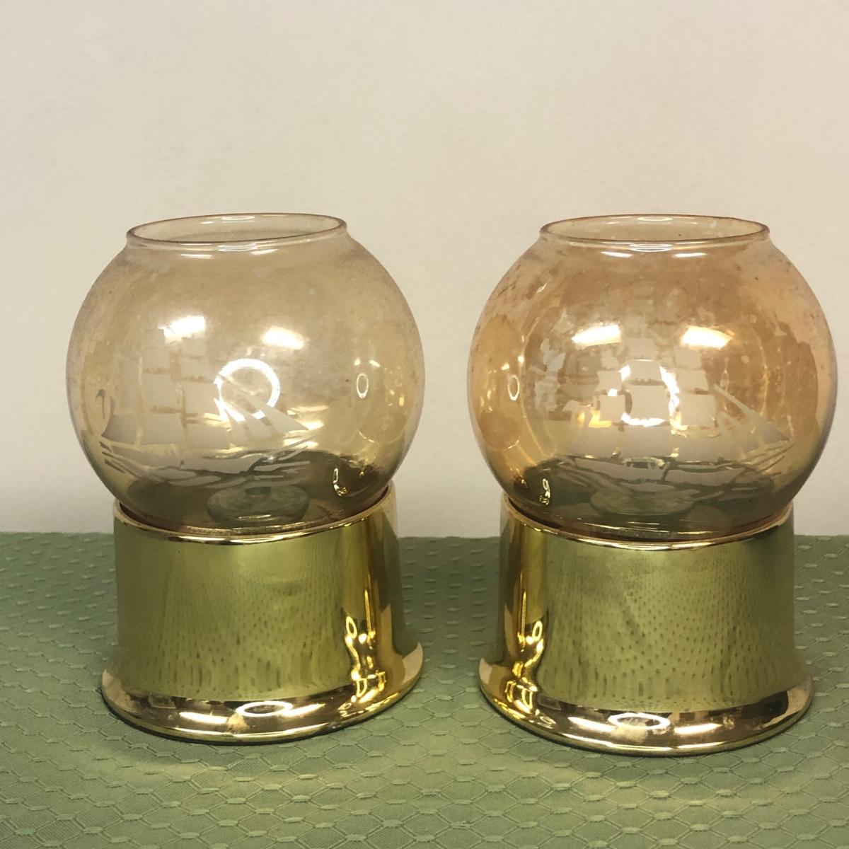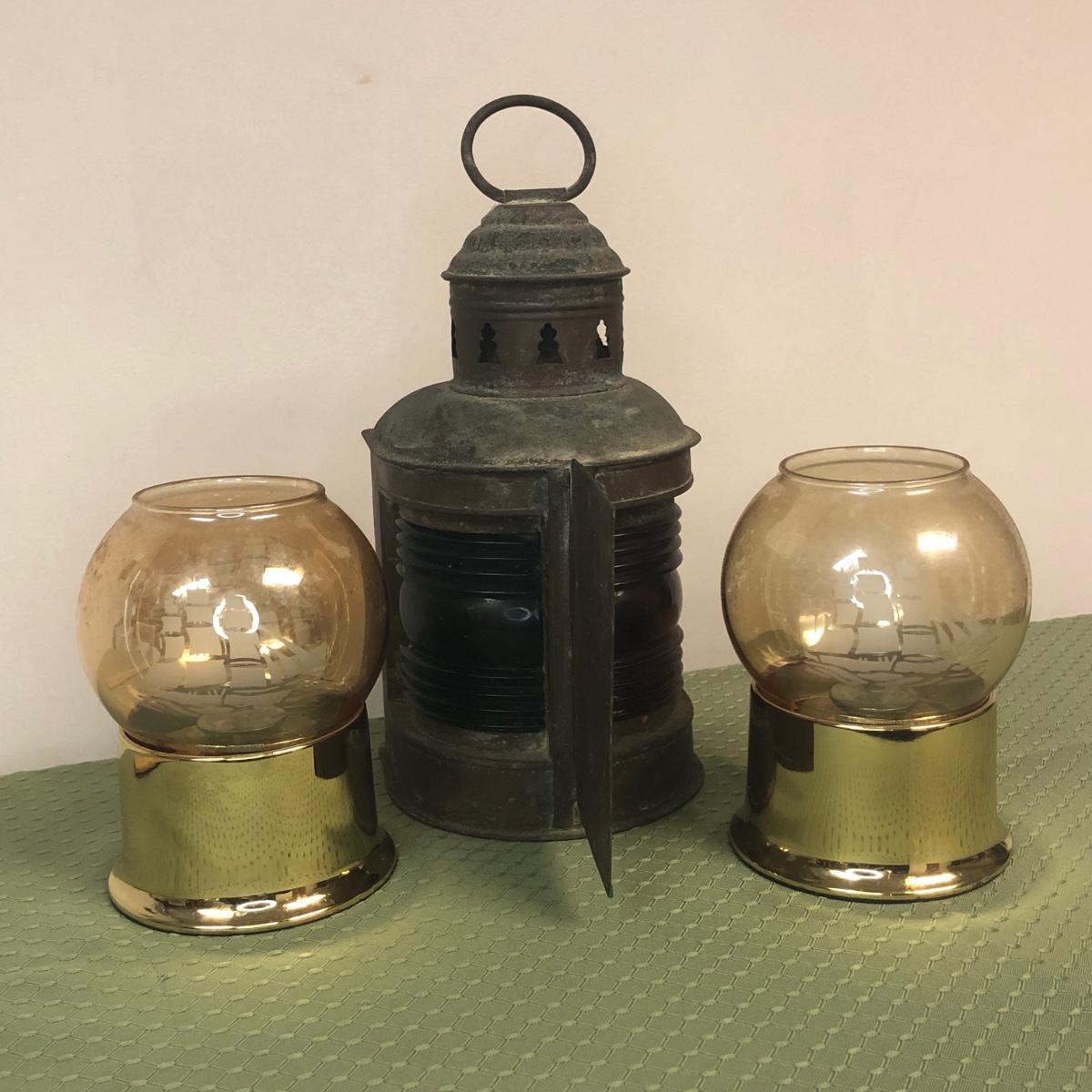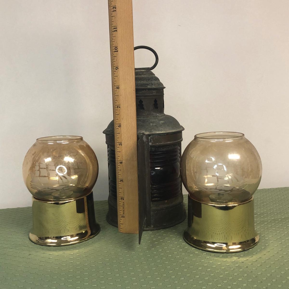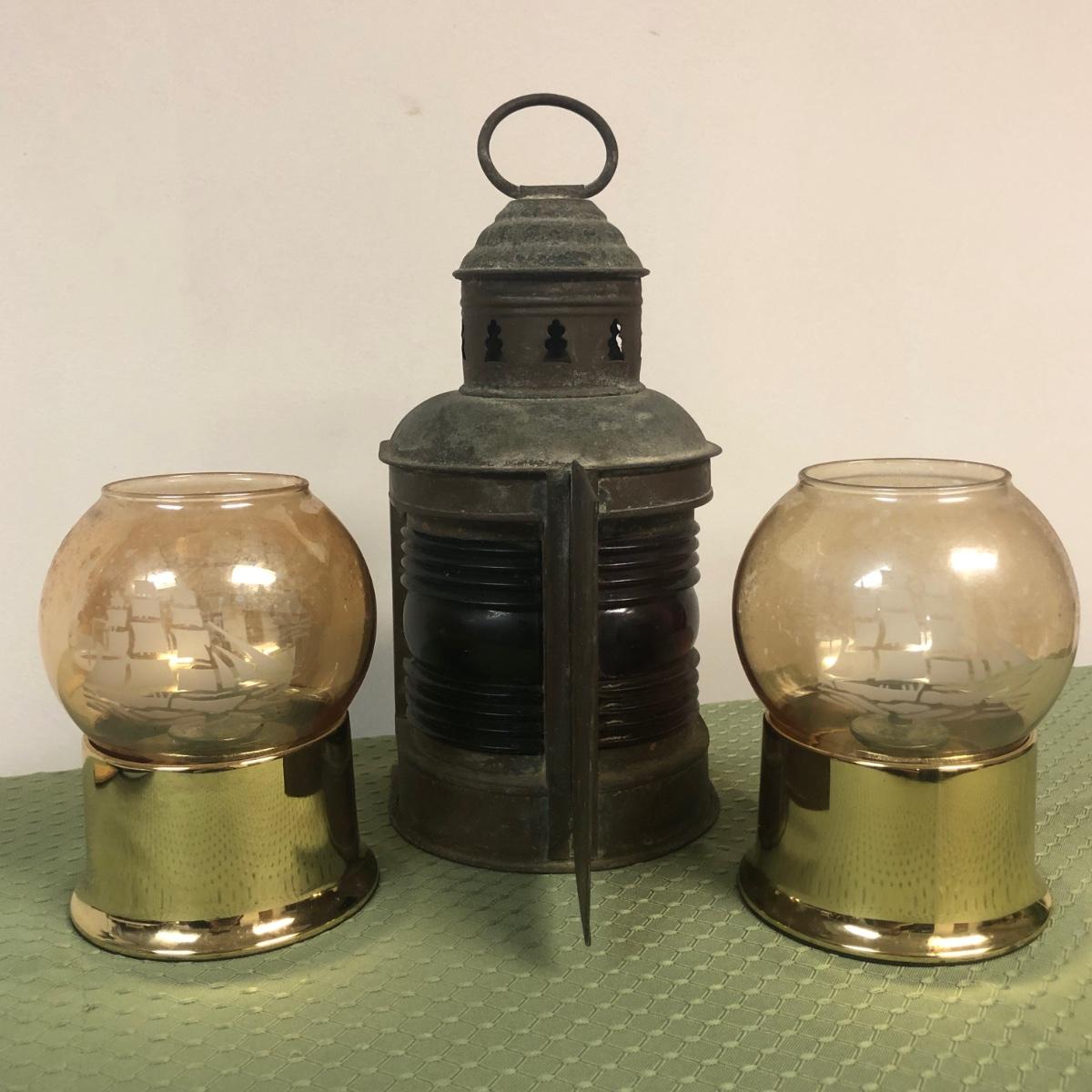 Includes one Perko Nautical Lantern made by Perkins Marine Lamp & Hardware Corporation in Brooklyn, New York. Includes 2 small oil lamps with large ships etched in the glass.