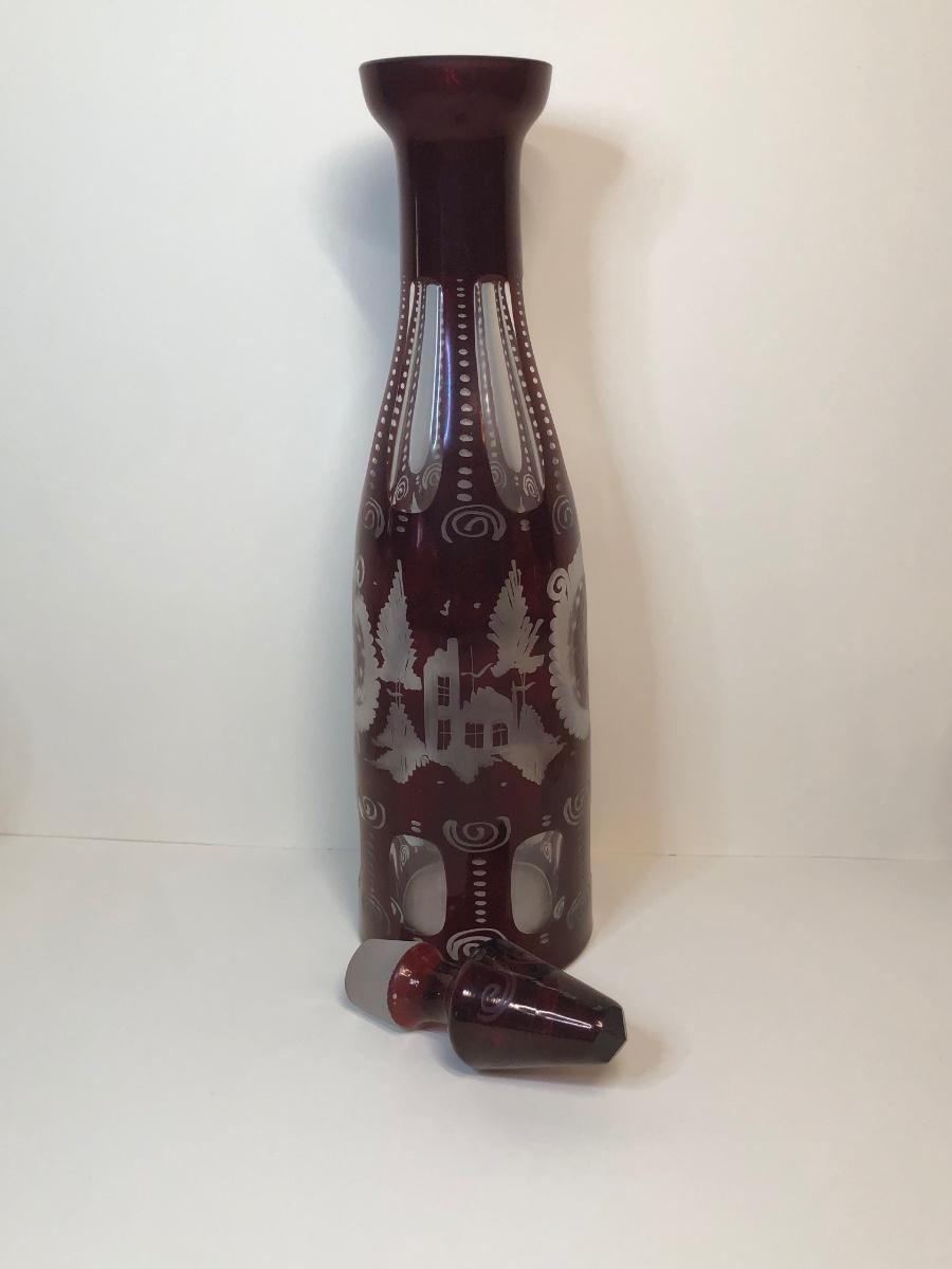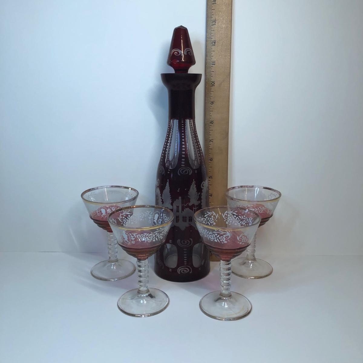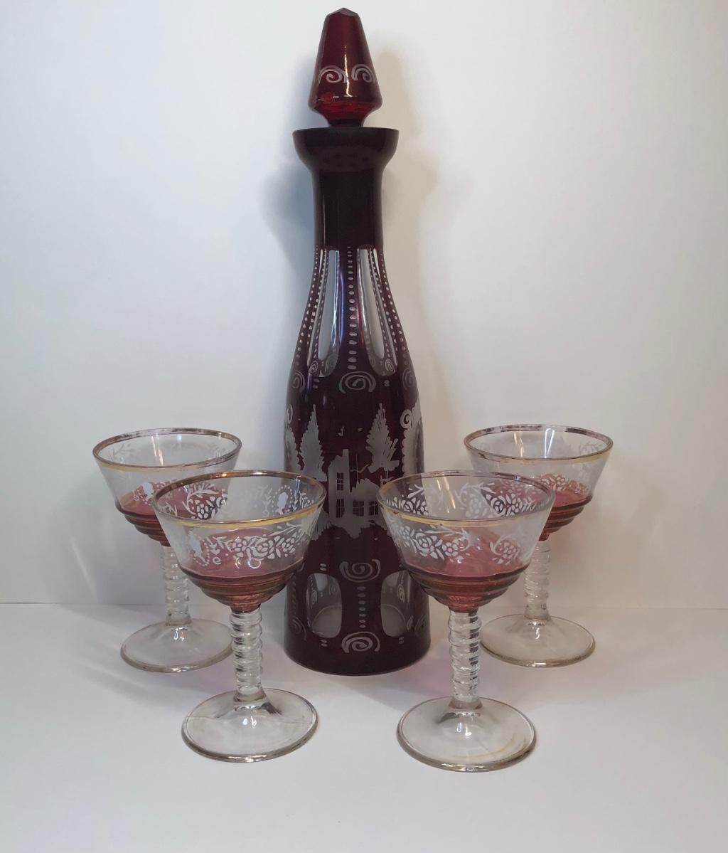 LOT 1M: Bohemian Ruby Cut to Clear Decanter & Ruby Cameo Stem Glasses