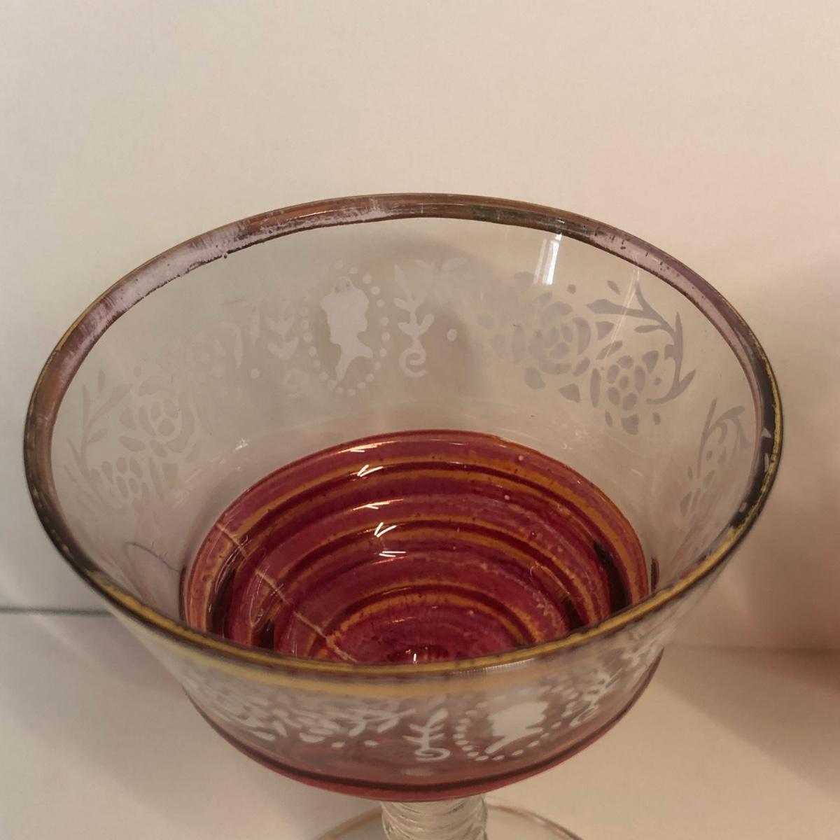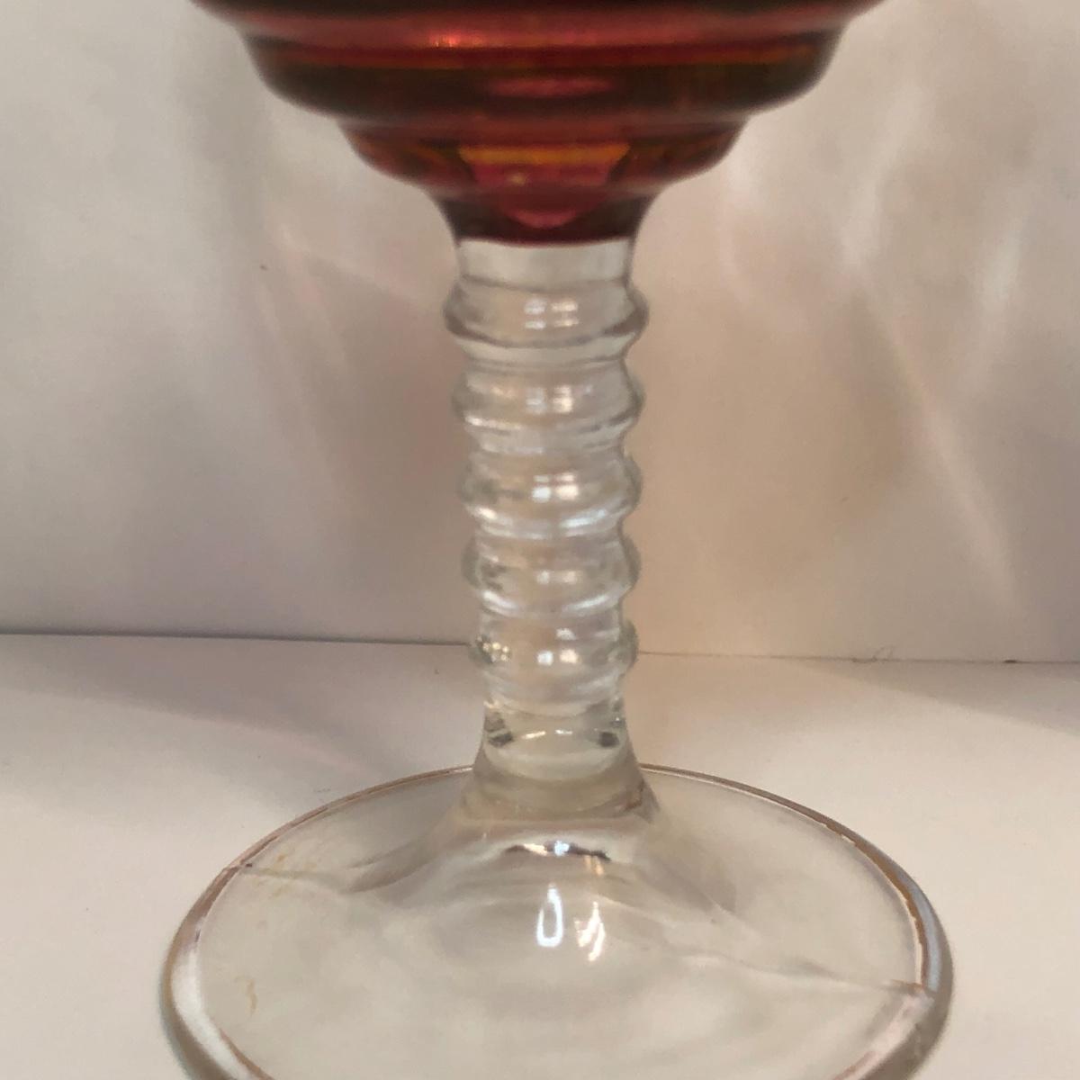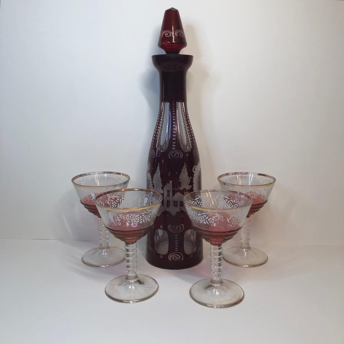 One ruby decanter with a cut to clear design and four ruby and clear glass stemmed glasses with a cameo design and a gold tone rim.