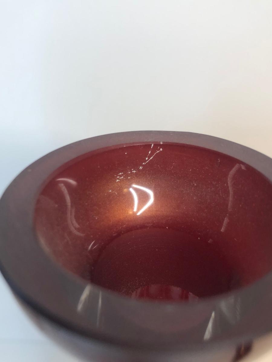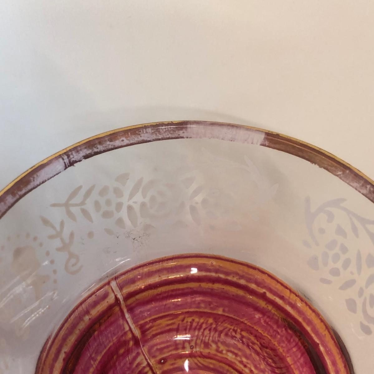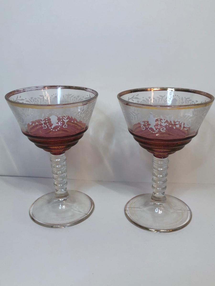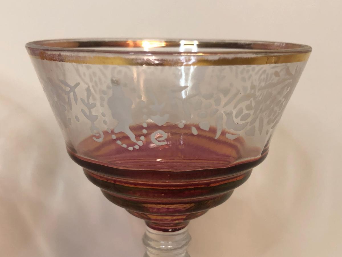 One ruby decanter with a cut to clear design and four ruby and clear glass stemmed glasses with a cameo design and a gold tone rim.