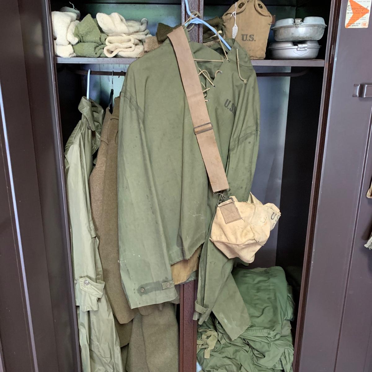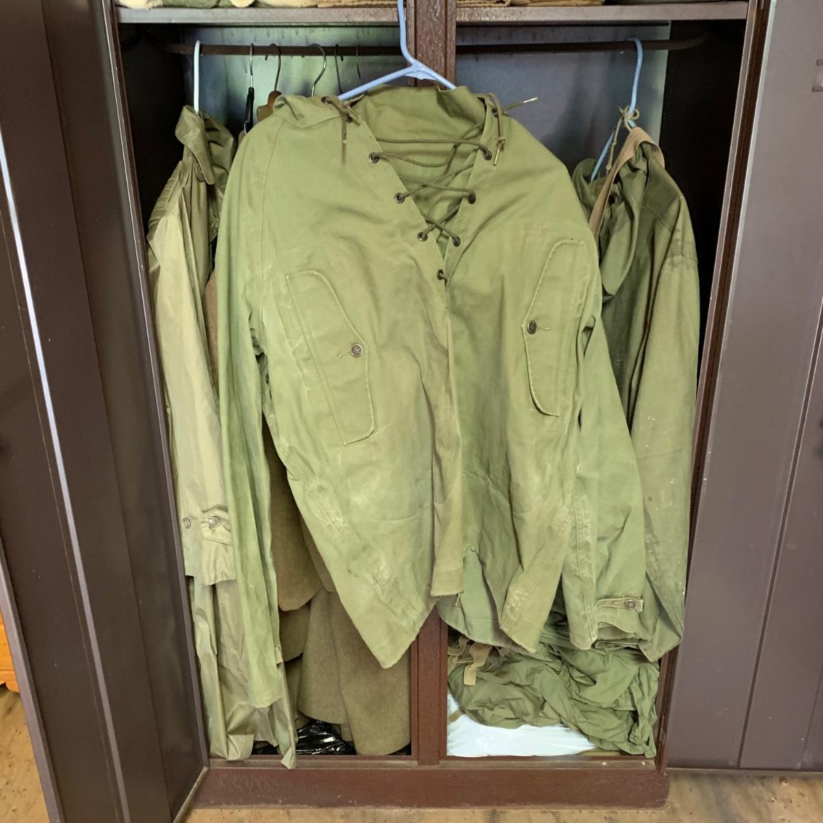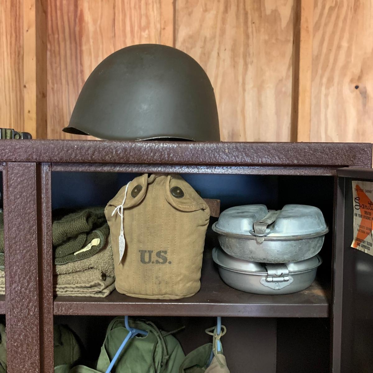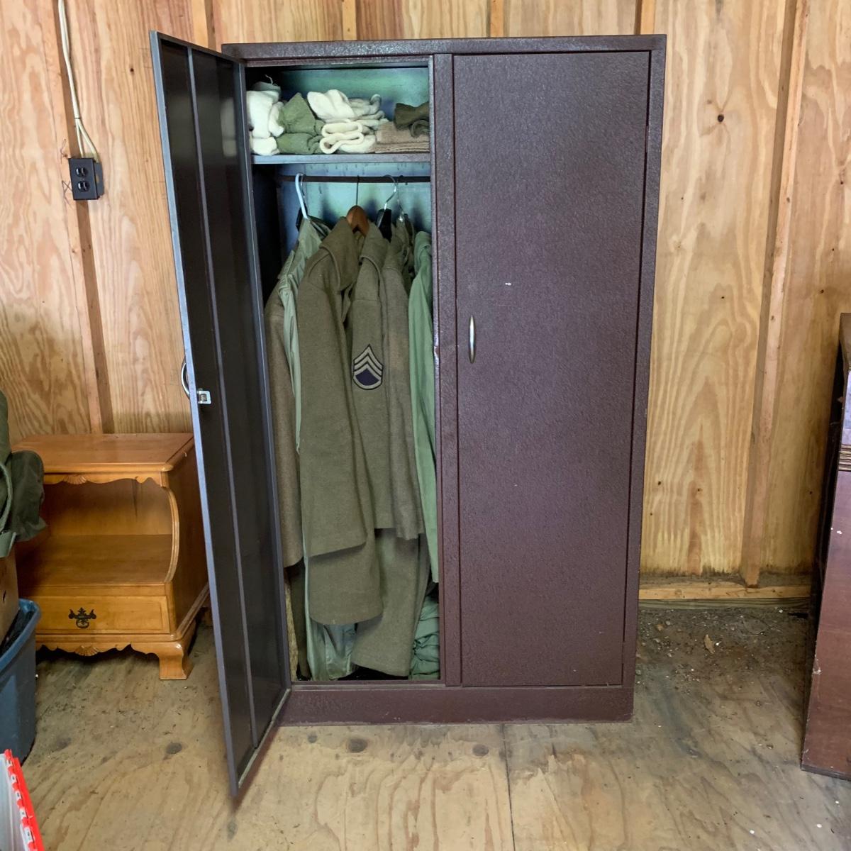 LOT 1R: Contents of Metal Cabinet: Vintage Military Clothing, Helmets, Mess Kit, Canteen & More
