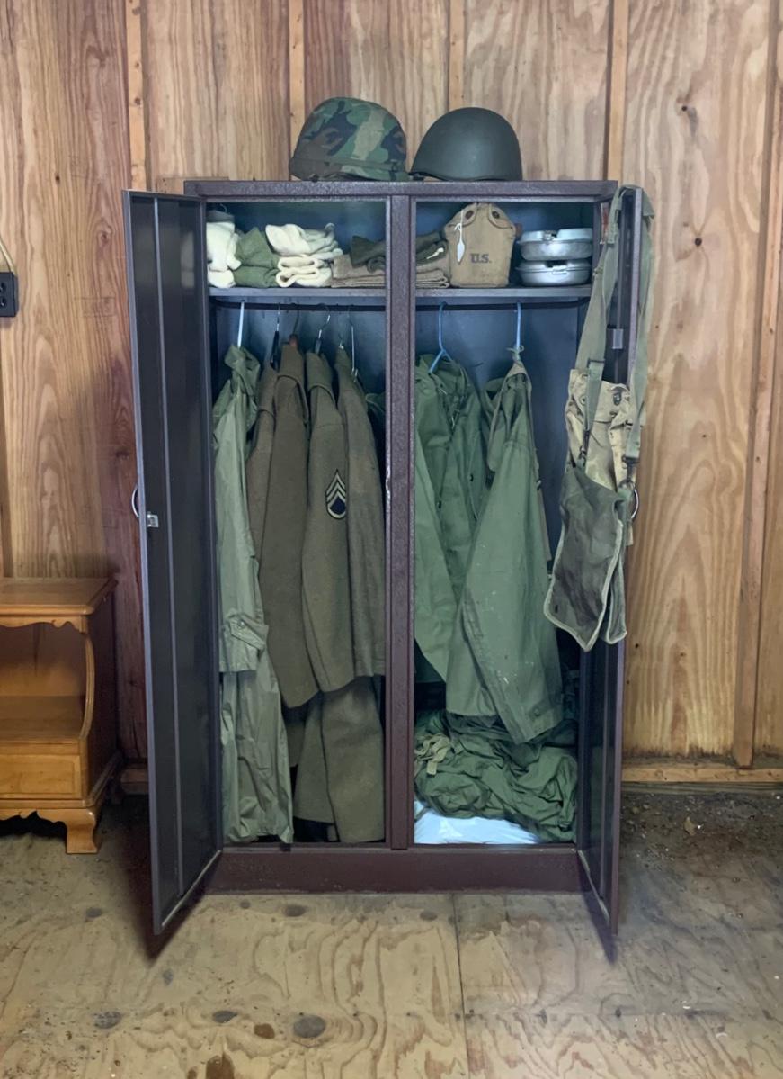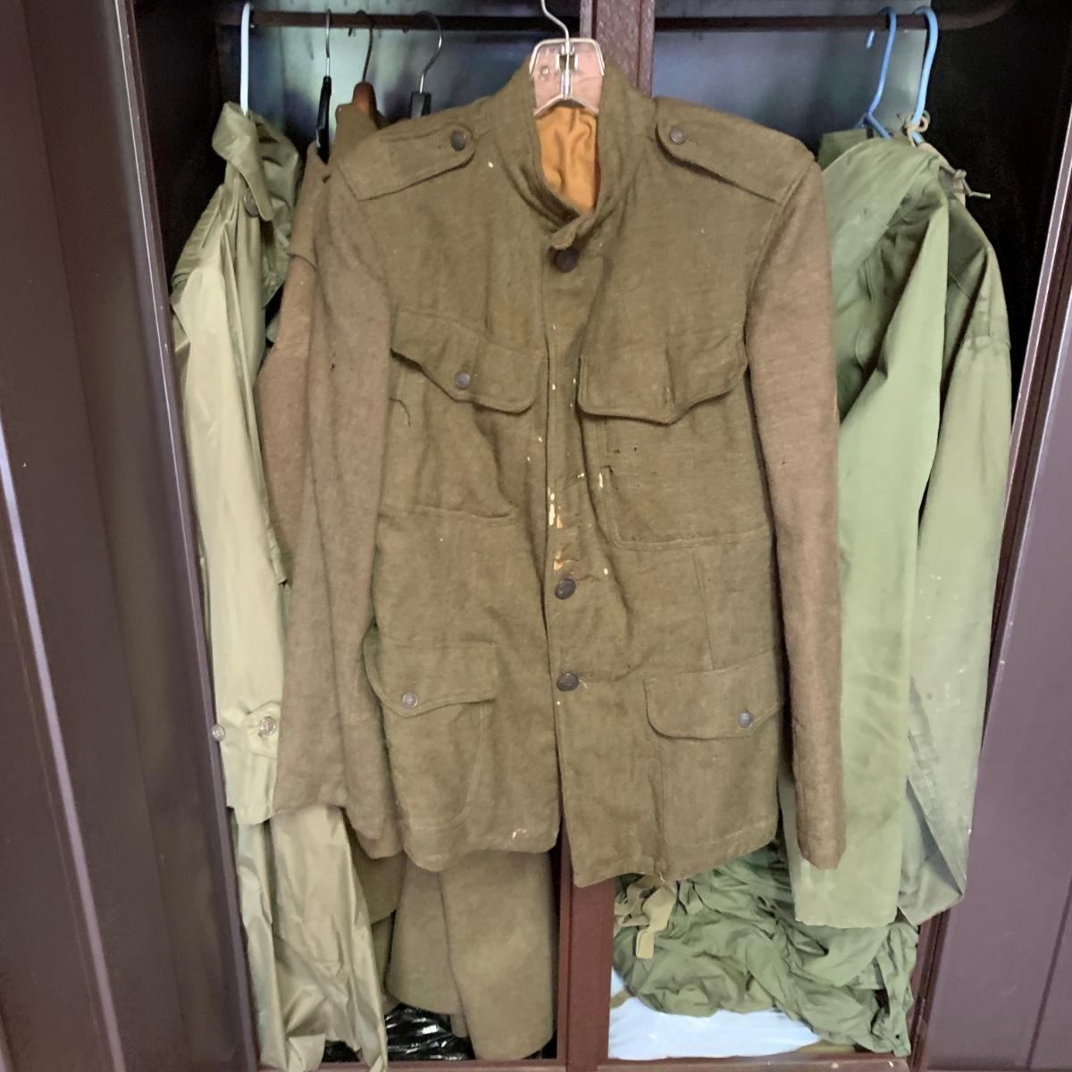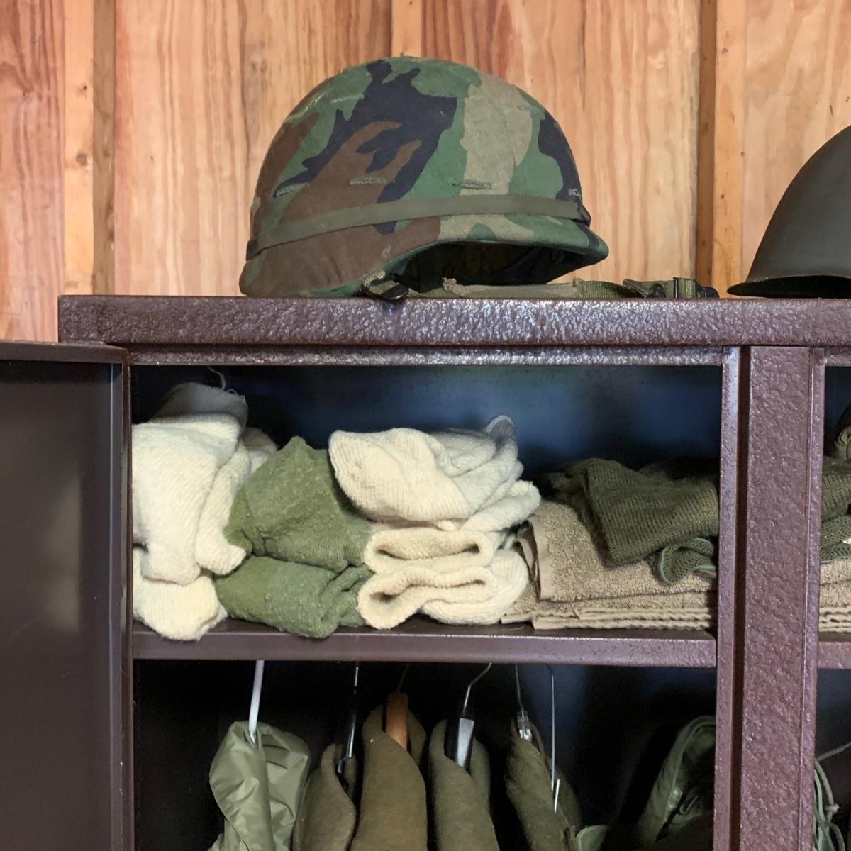 LOT 1R: Contents of Metal Cabinet: Vintage Military Clothing, Helmets, Mess Kit, Canteen & More