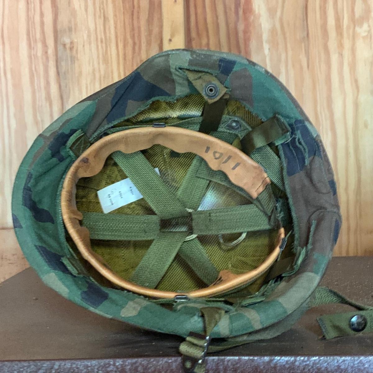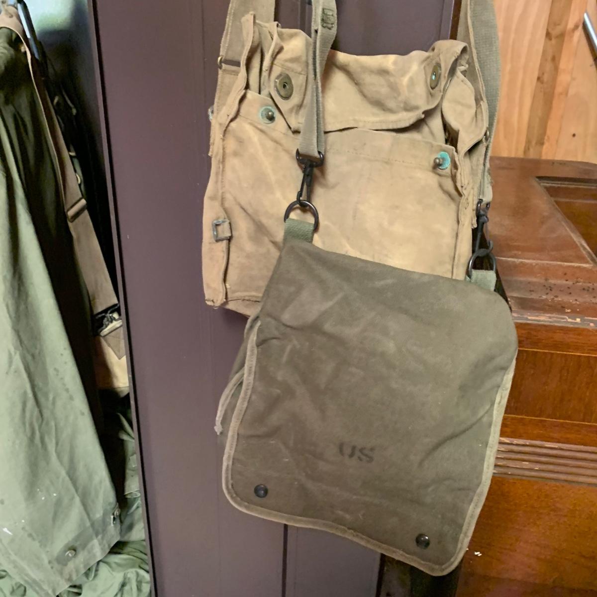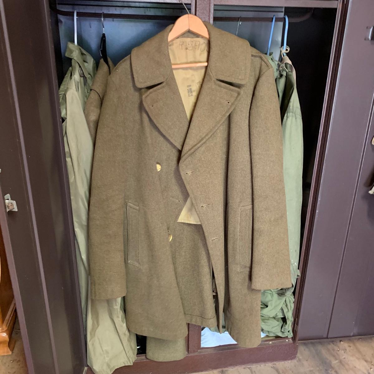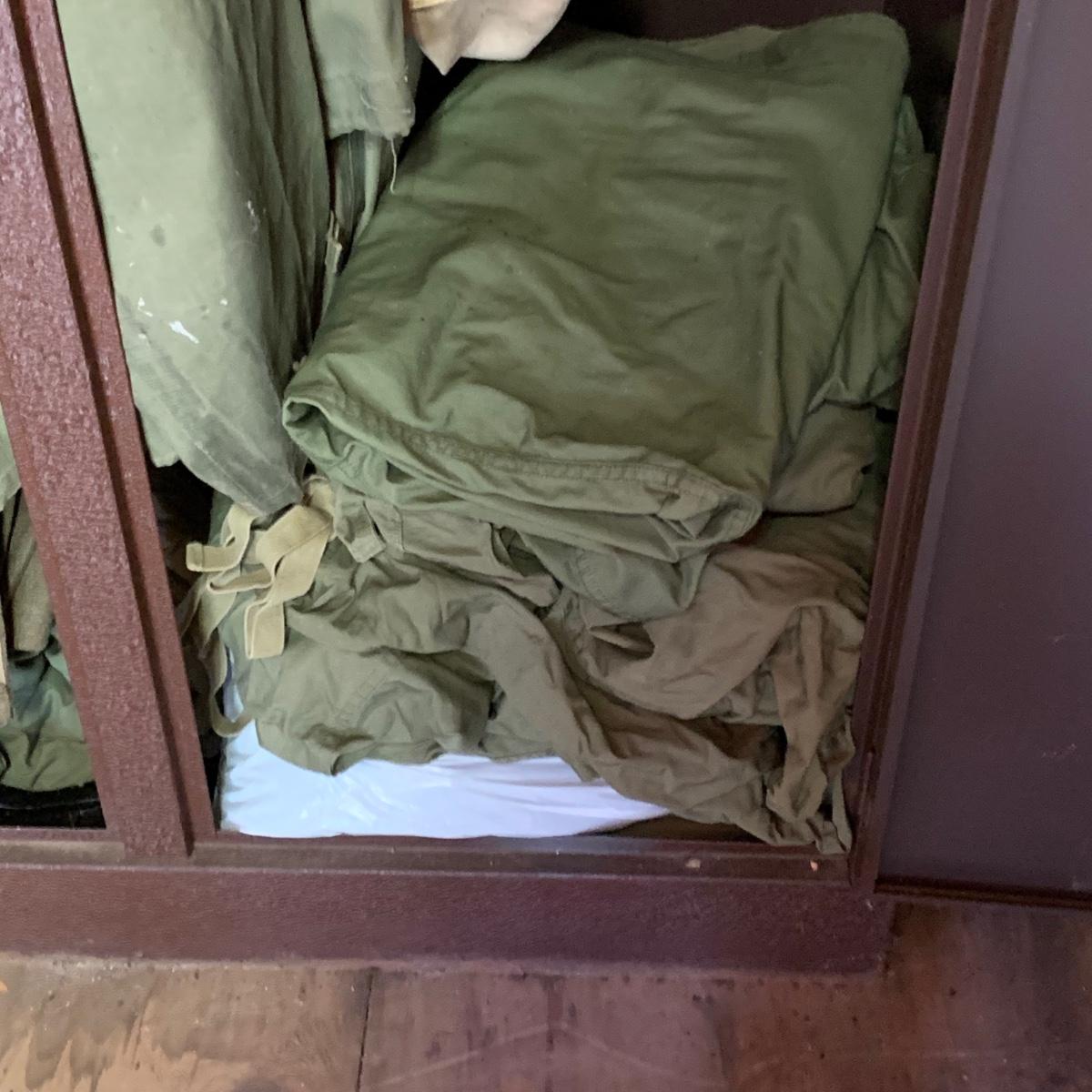 LOT 1R: Contents of Metal Cabinet: Vintage Military Clothing, Helmets, Mess Kit, Canteen & More