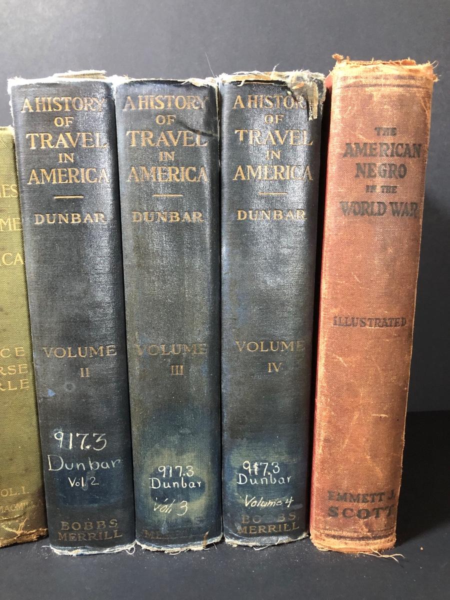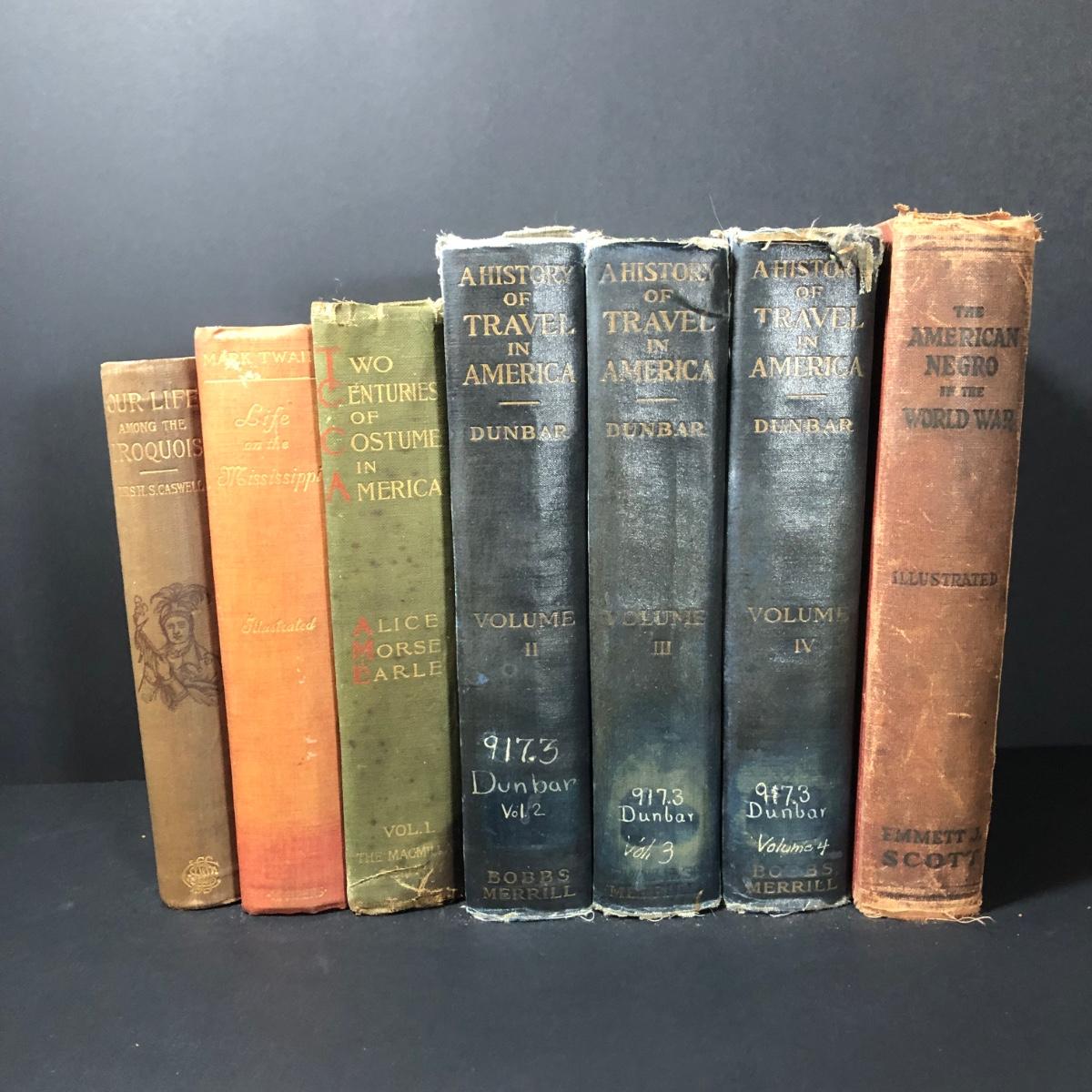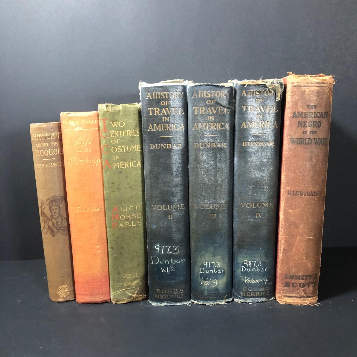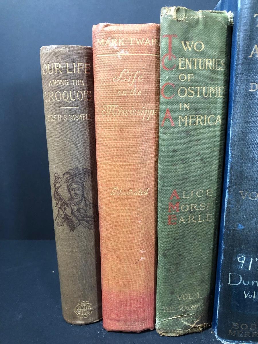 LOT 1D: Antique Books - Mark Twain's Life on the Mississippi (1883), Alice Morse Elise's Two Centuries of Costume in America (1903), Dunbar's A History of Travel in America (Vol2-4, 1915) & More
