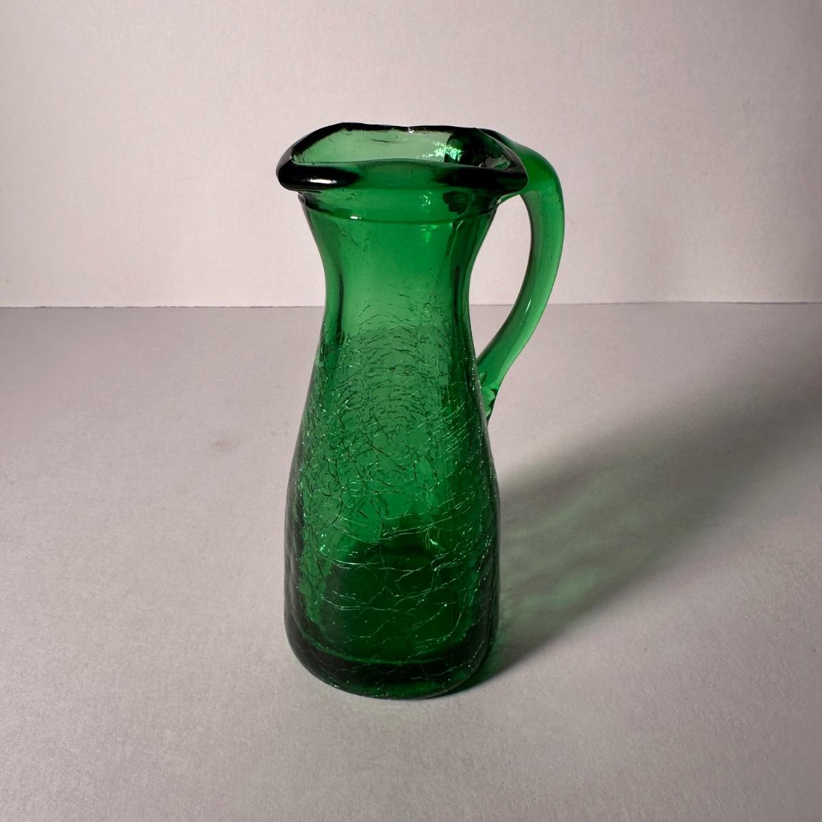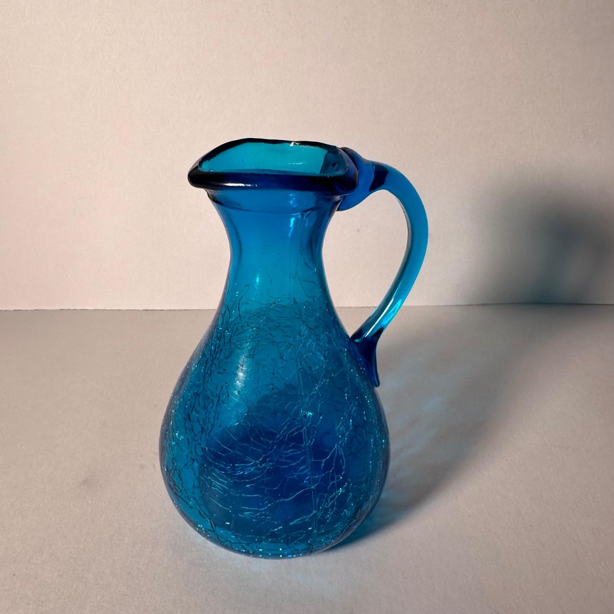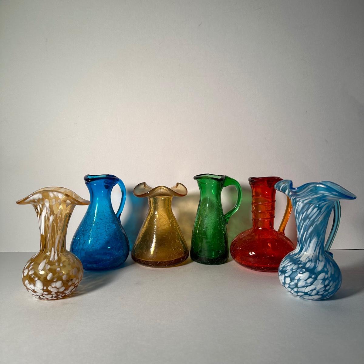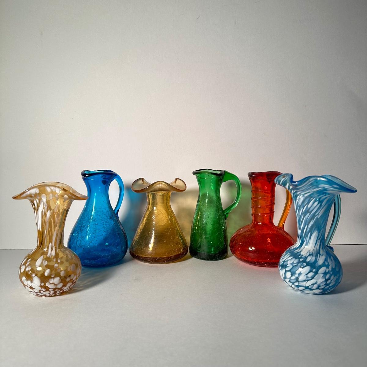 LOT 1F: Vintage Colored Crackle Glass & Hand Blown Rainbow Glass Pitchers