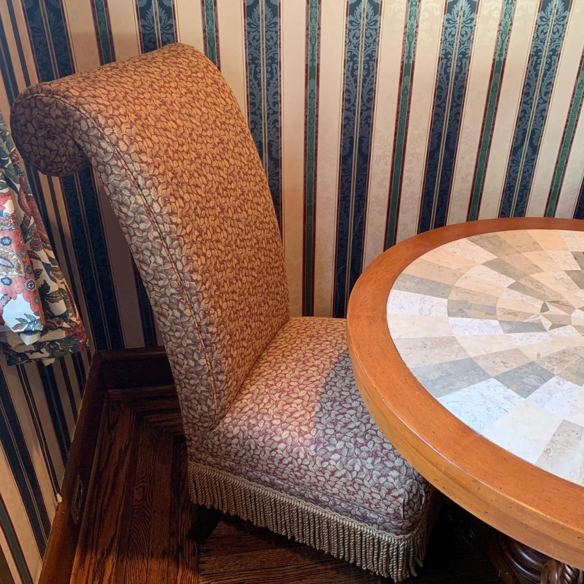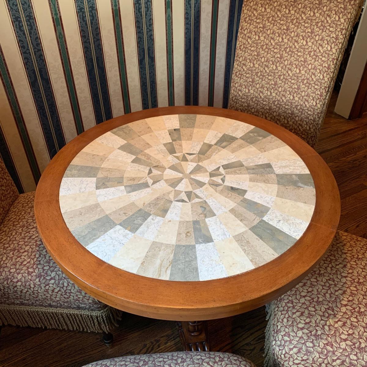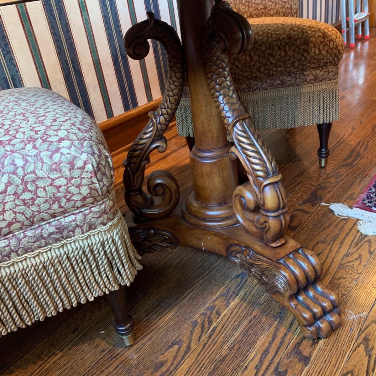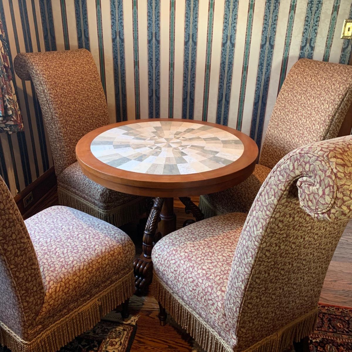 LOT 1: Lillian August Collection Upholstered Chairs & Round Pedestal Table w/Faux Inlaid Feature