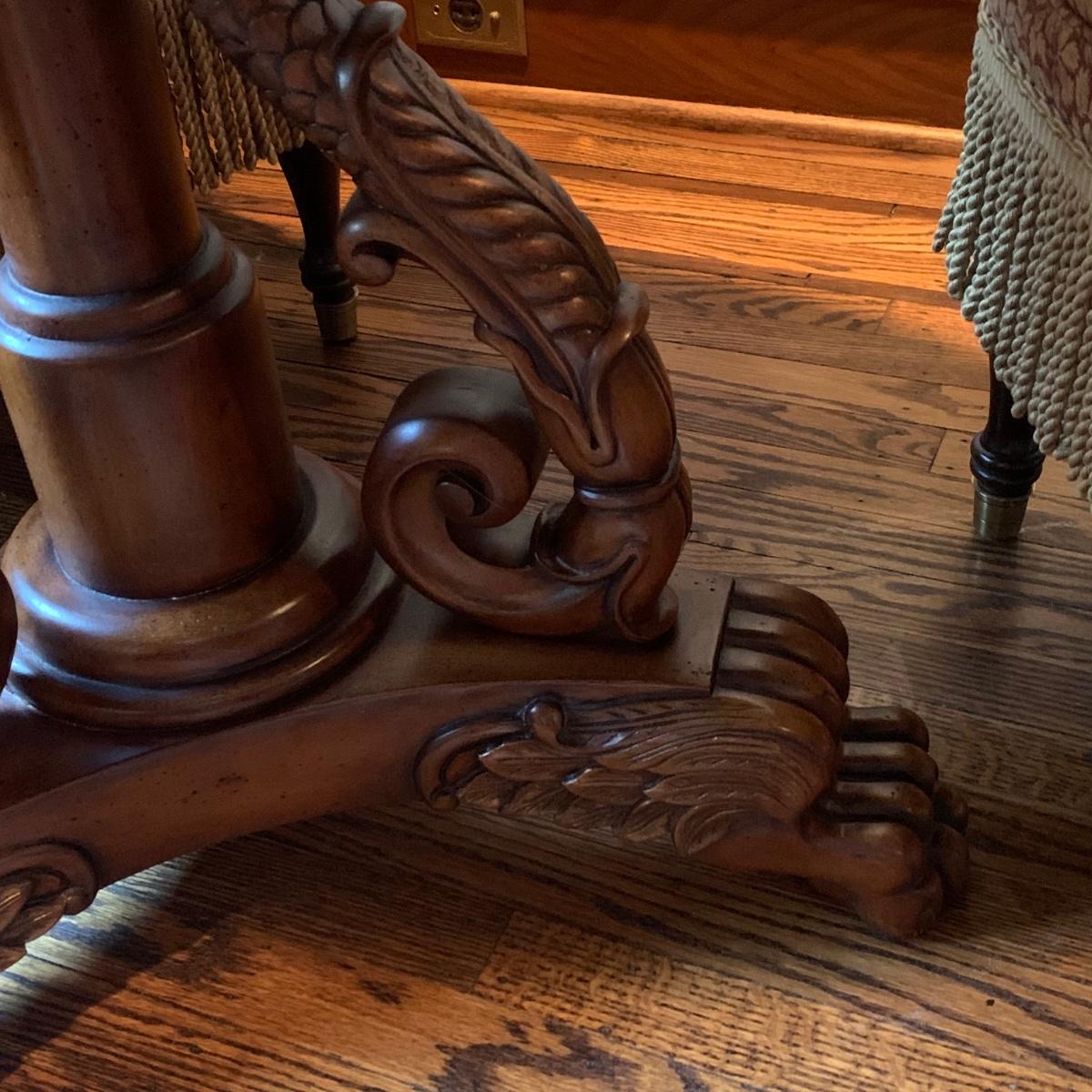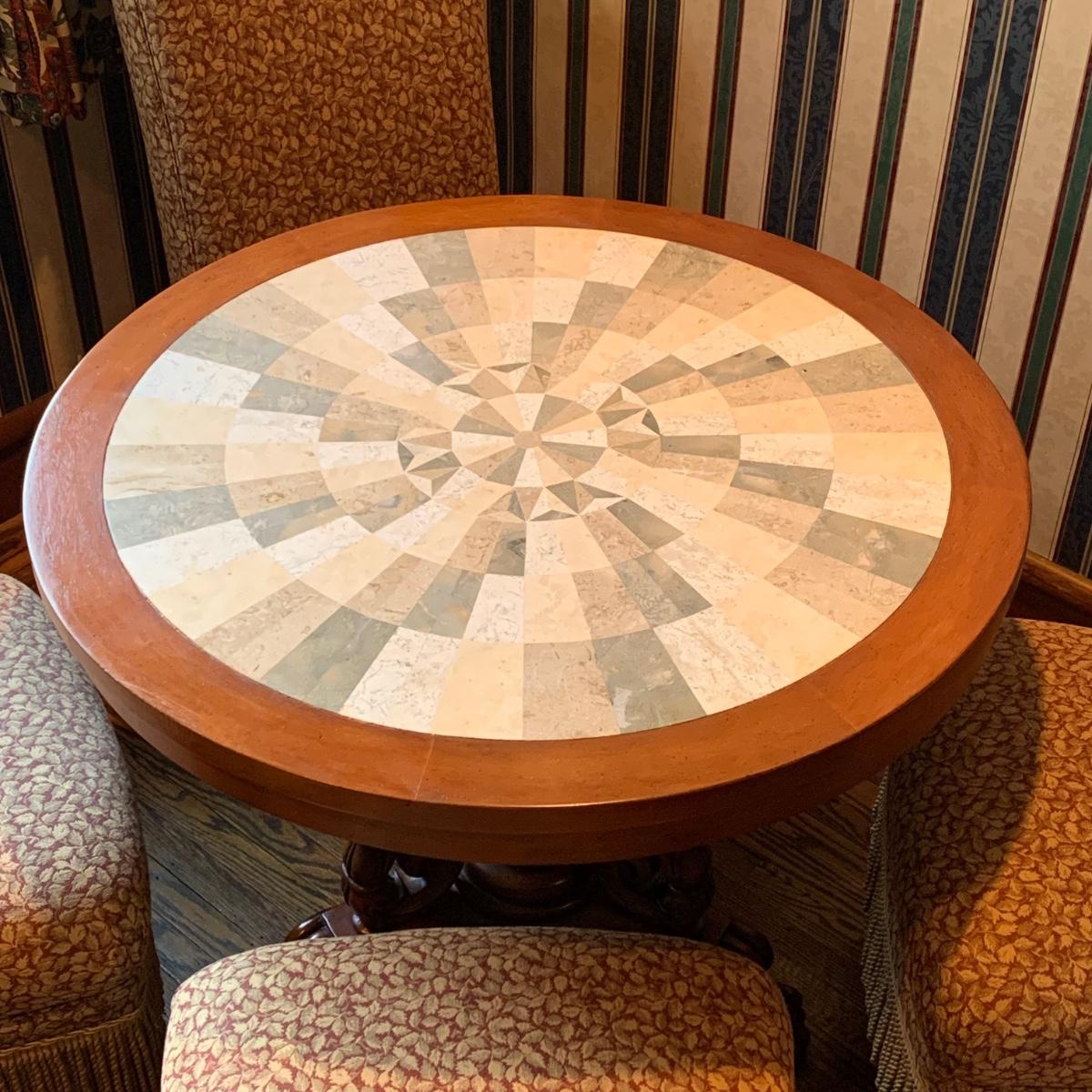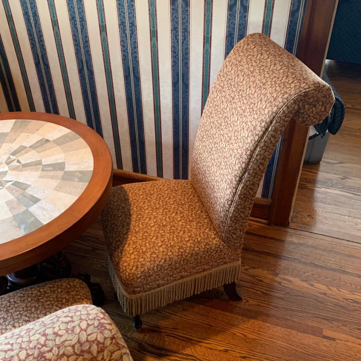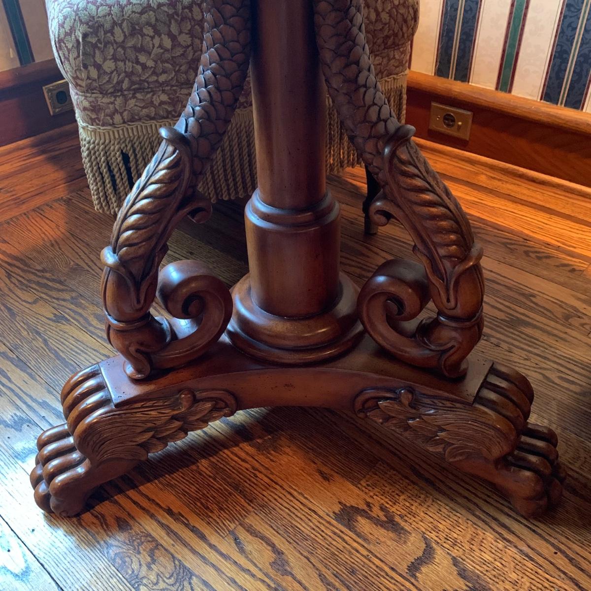 LOT 1: Lillian August Collection Upholstered Chairs & Round Pedestal Table w/Faux Inlaid Feature