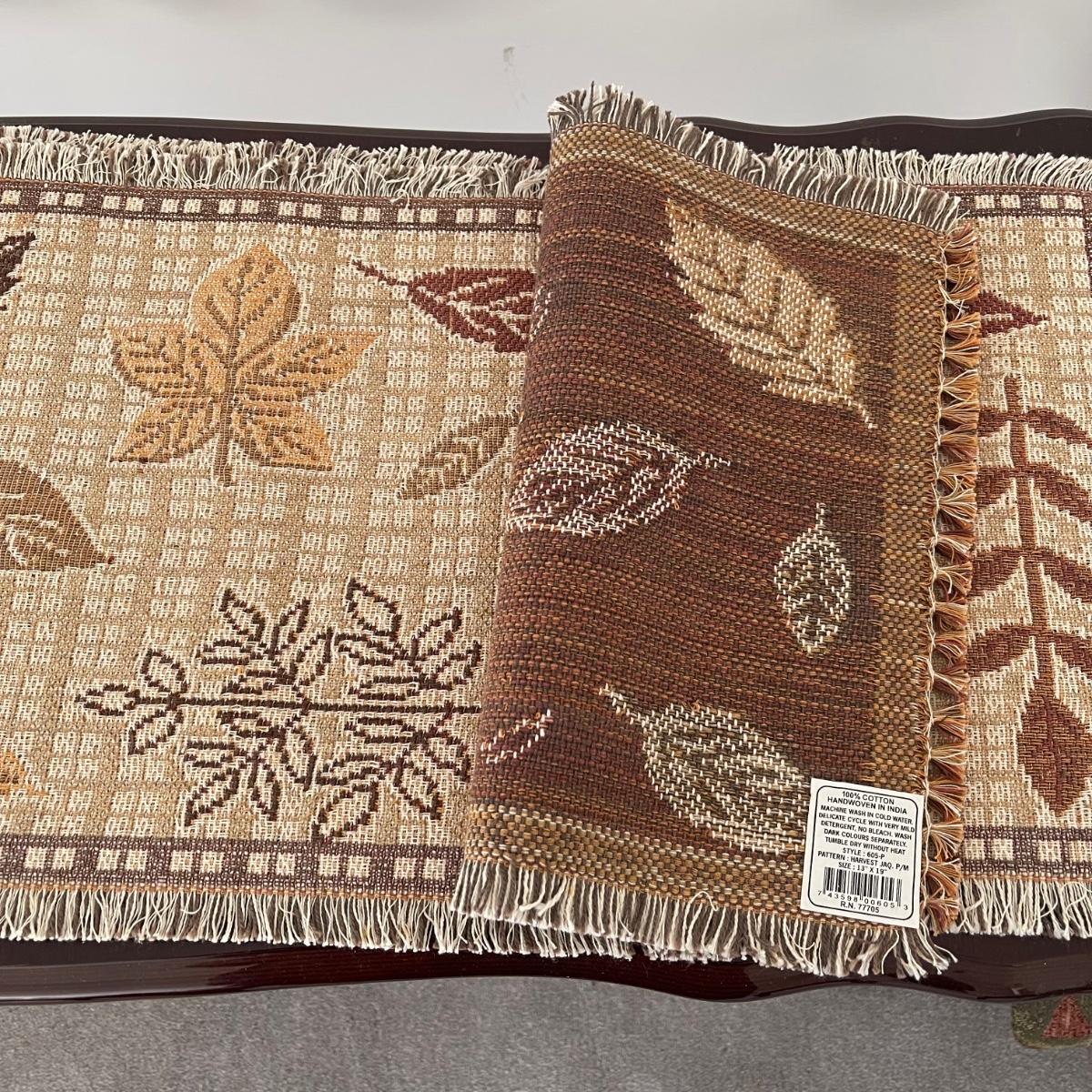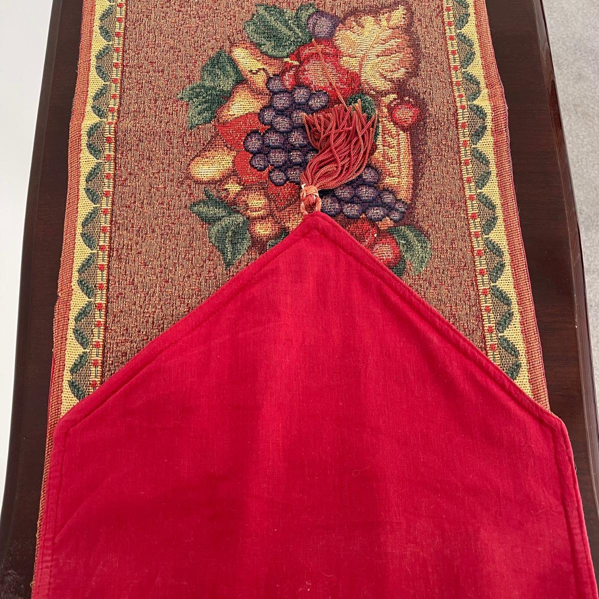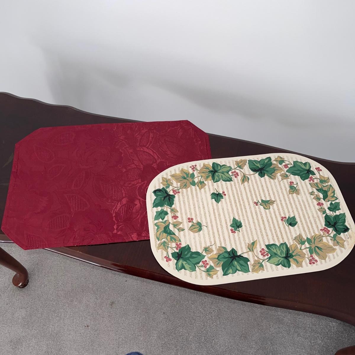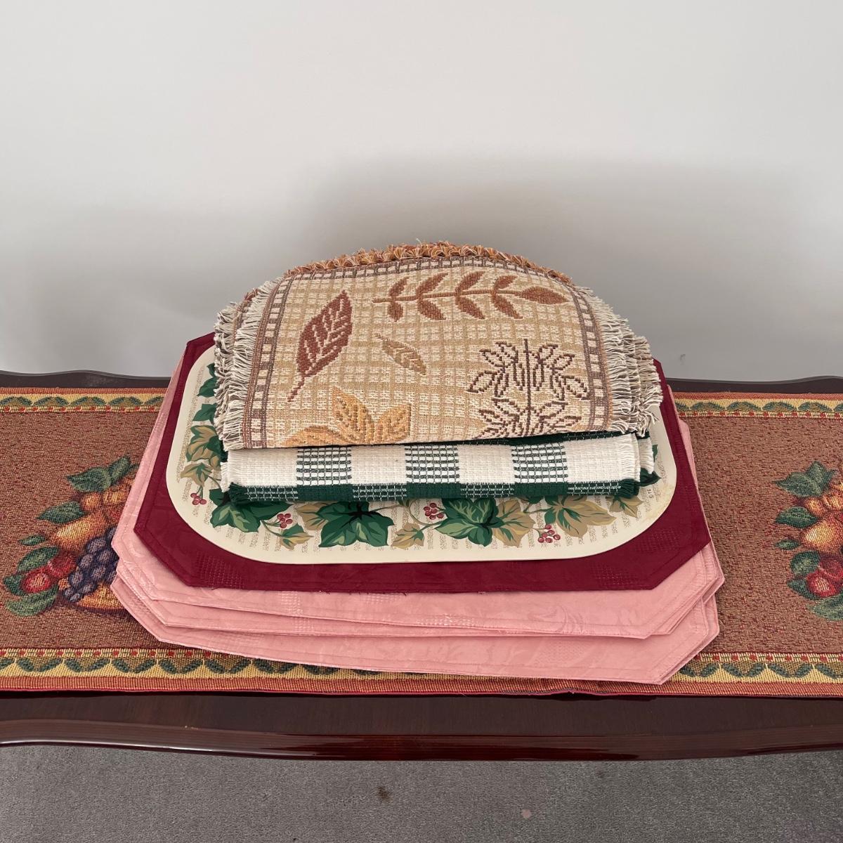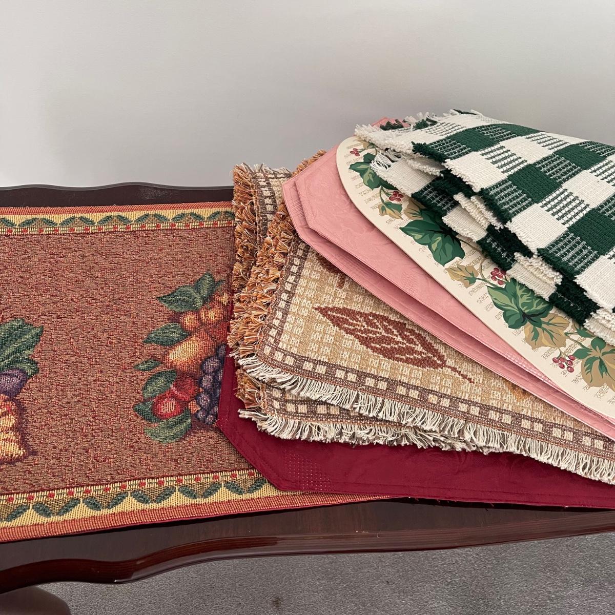 There are six pink polyester floral placemats, a single matching red floral placemat, a single vinyl holiday mat, six cotton green and white checkered placemats, and six autumn themed cotton placemats; all of which are just about 13” x 19”. The table runner included has a red underside and is a tapestry-like material decorated with fruit imagery. Shipping Available