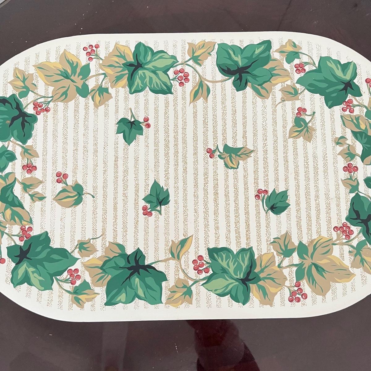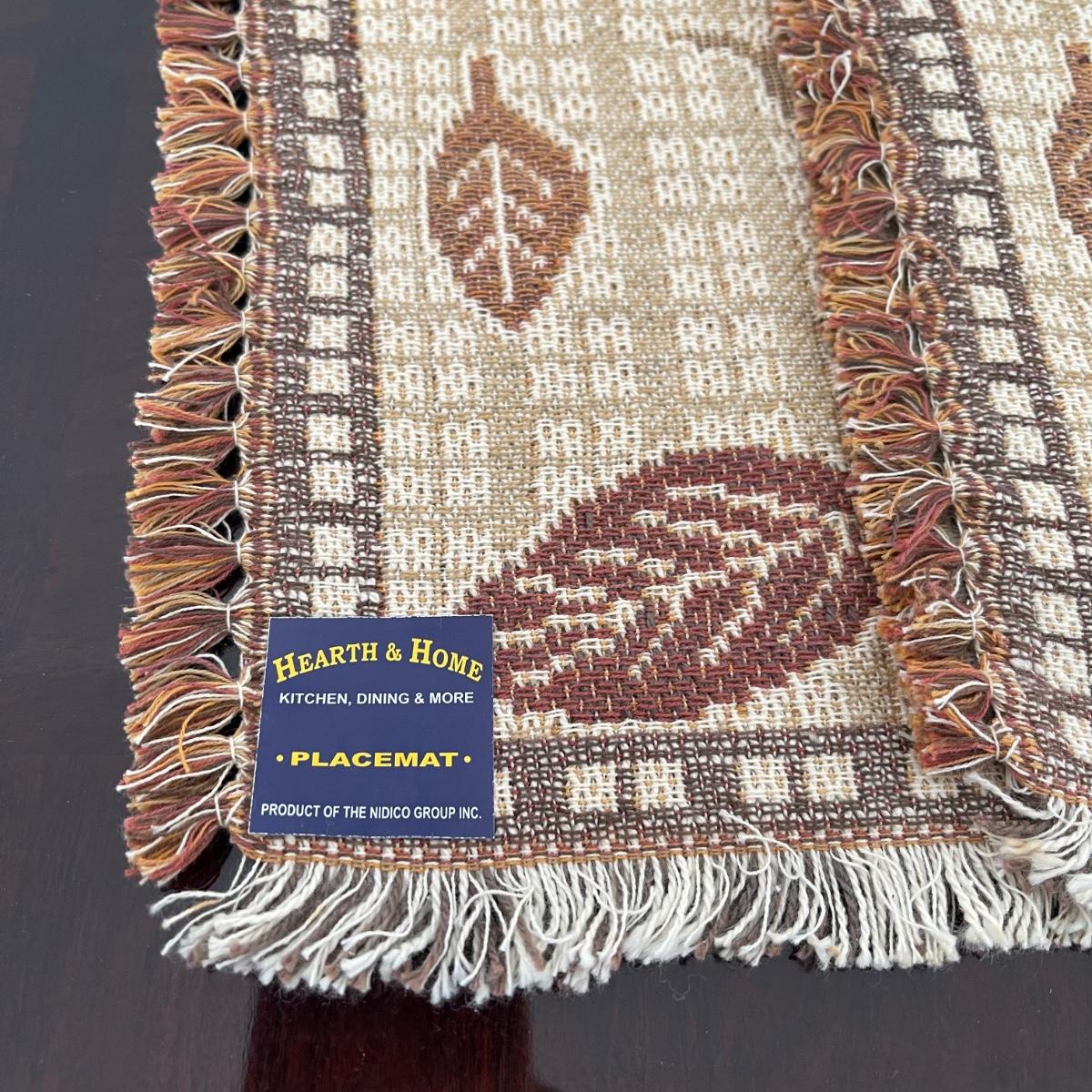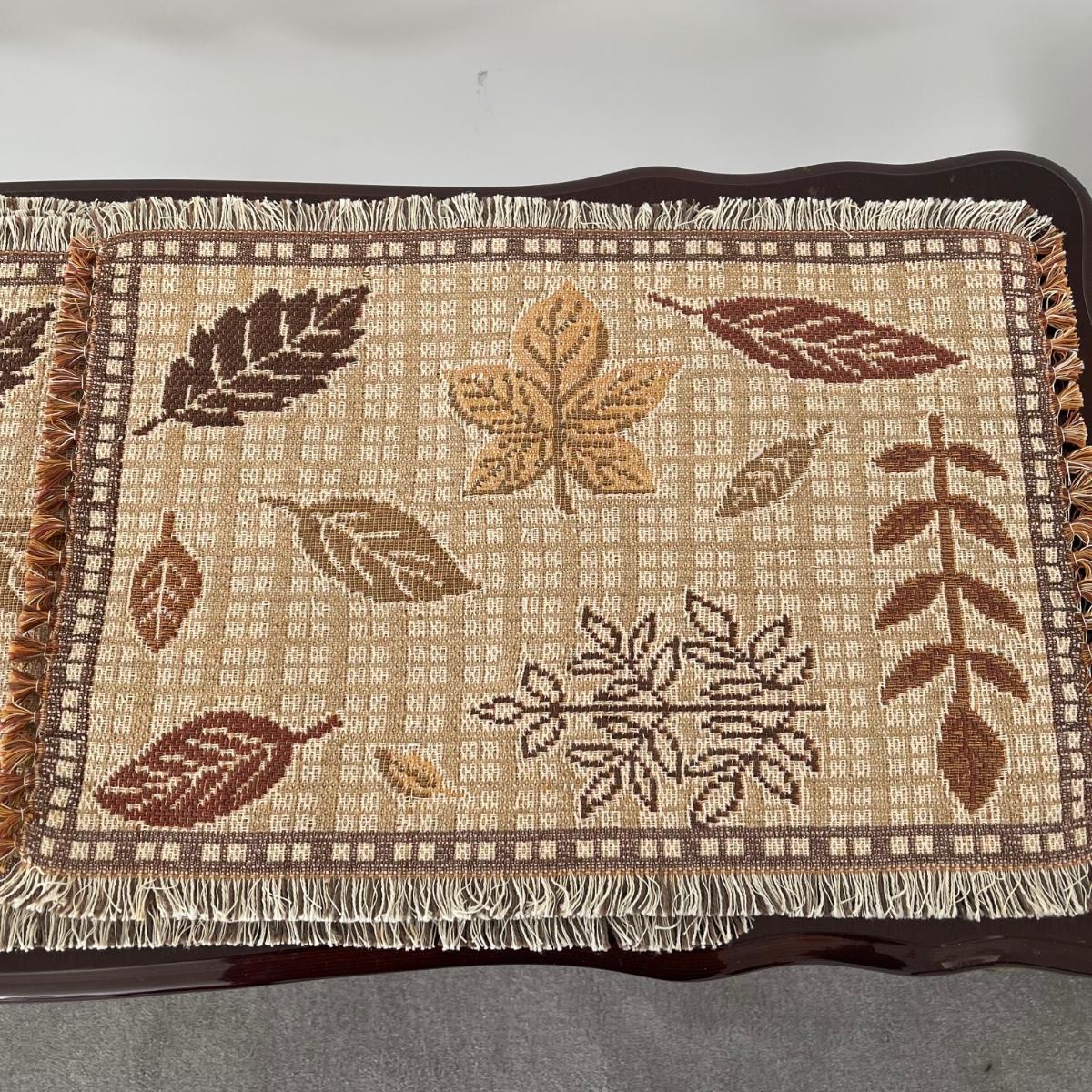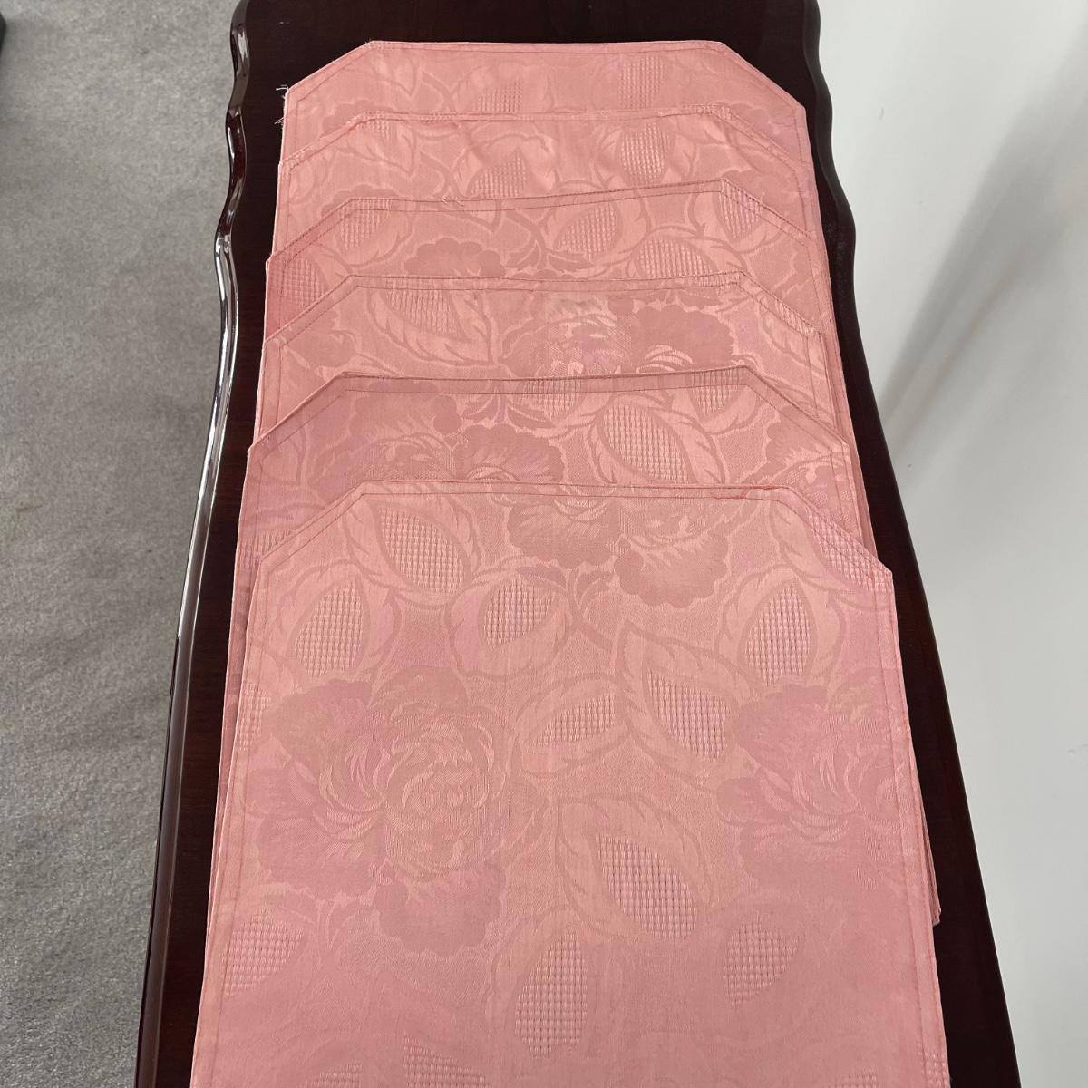 There are six pink polyester floral placemats, a single matching red floral placemat, a single vinyl holiday mat, six cotton green and white checkered placemats, and six autumn themed cotton placemats; all of which are just about 13” x 19”. The table runner included has a red underside and is a tapestry-like material decorated with fruit imagery. Shipping Available