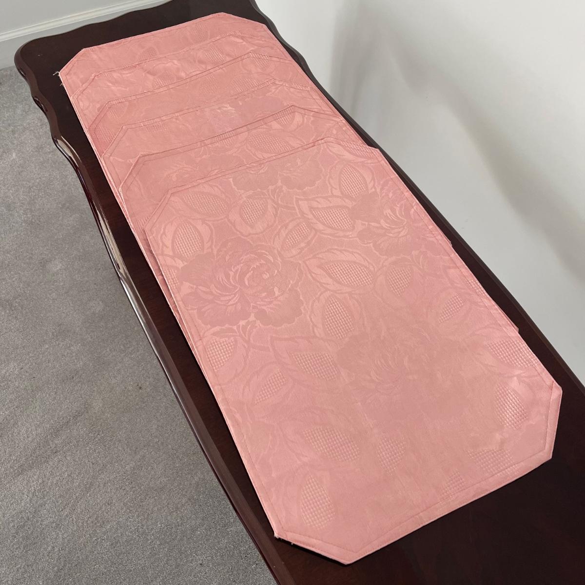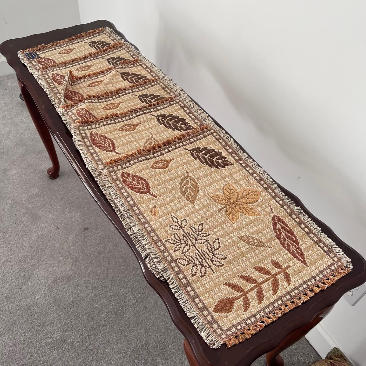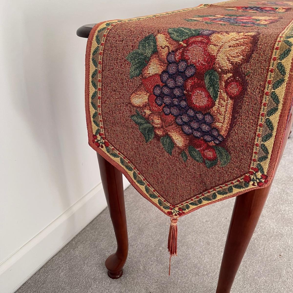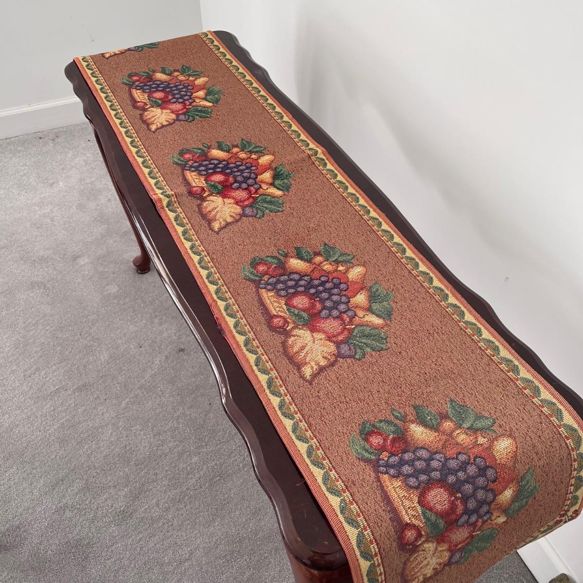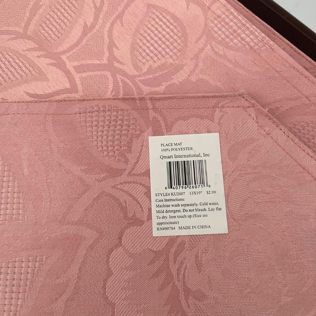 There are six pink polyester floral placemats, a single matching red floral placemat, a single vinyl holiday mat, six cotton green and white checkered placemats, and six autumn themed cotton placemats; all of which are just about 13” x 19”. The table runner included has a red underside and is a tapestry-like material decorated with fruit imagery. Shipping Available