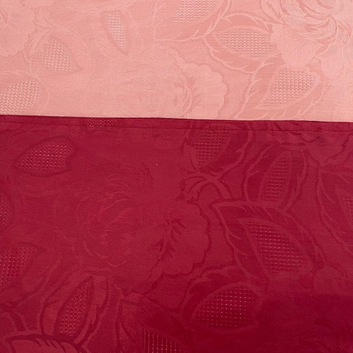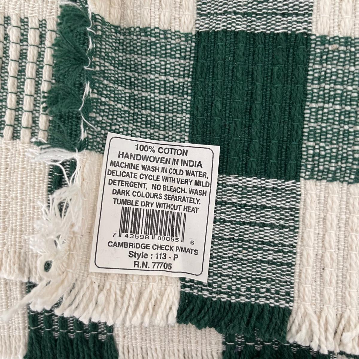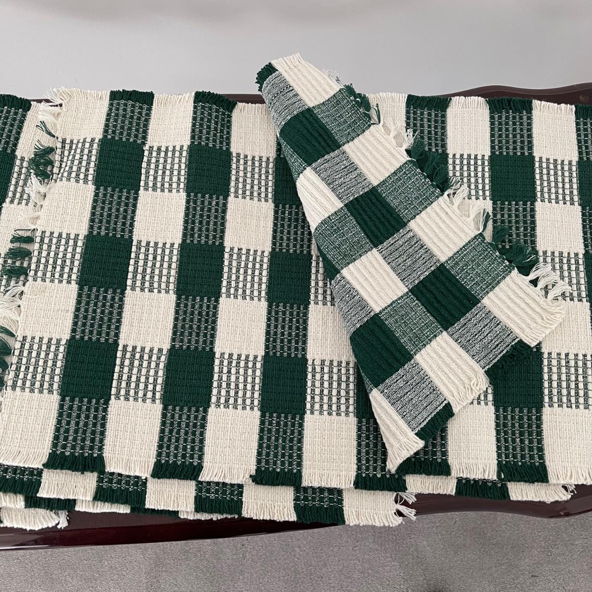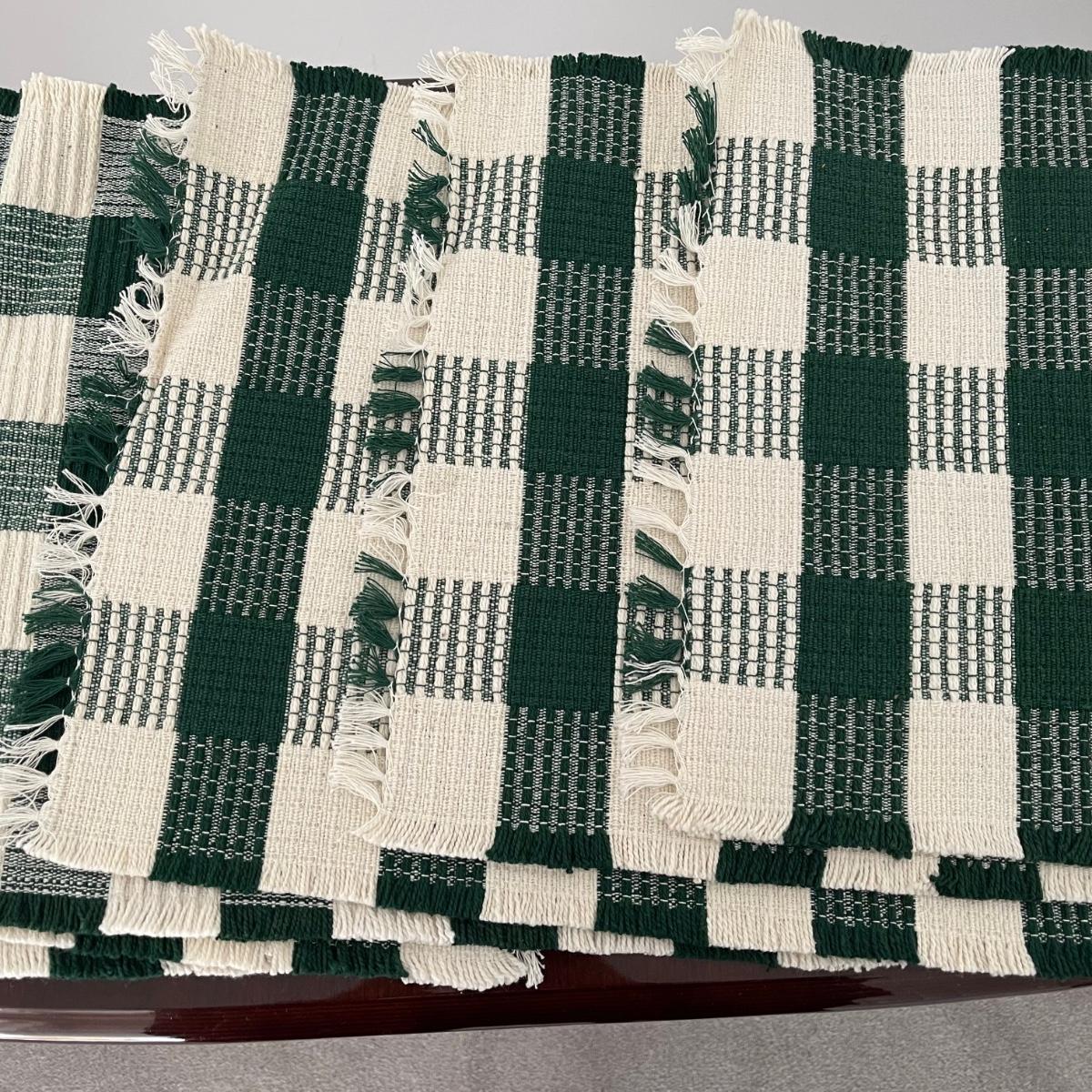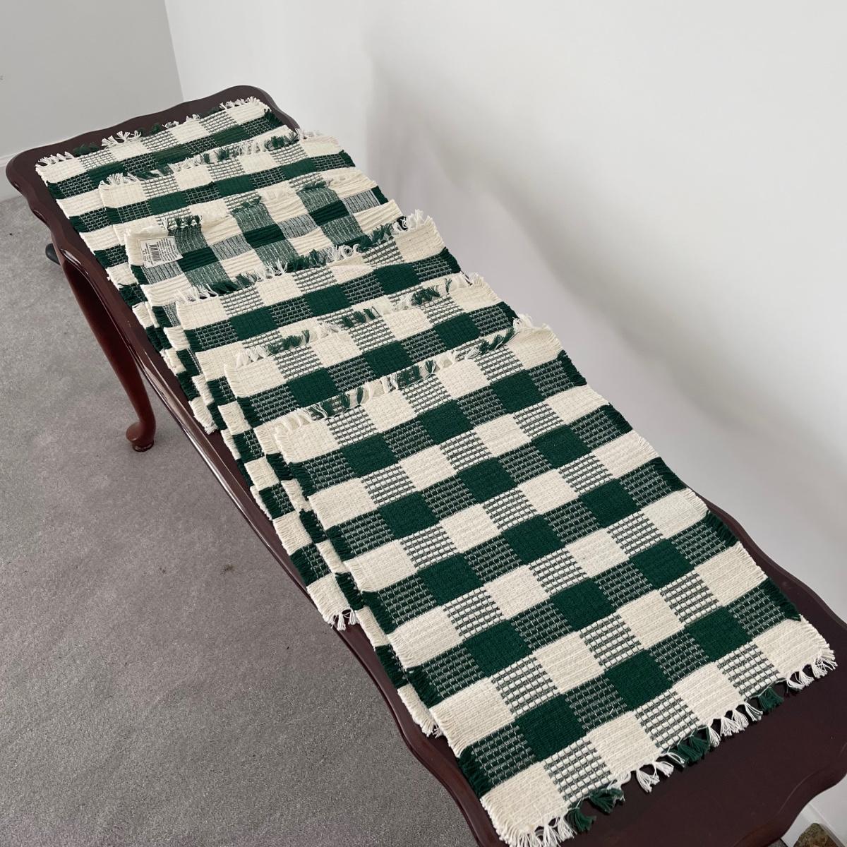 There are six pink polyester floral placemats, a single matching red floral placemat, a single vinyl holiday mat, six cotton green and white checkered placemats, and six autumn themed cotton placemats; all of which are just about 13” x 19”. The table runner included has a red underside and is a tapestry-like material decorated with fruit imagery. Shipping Available