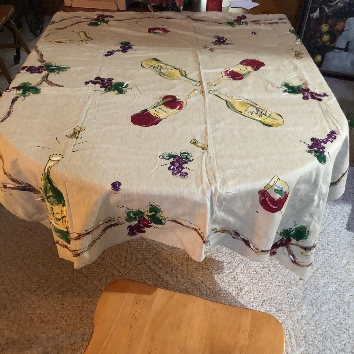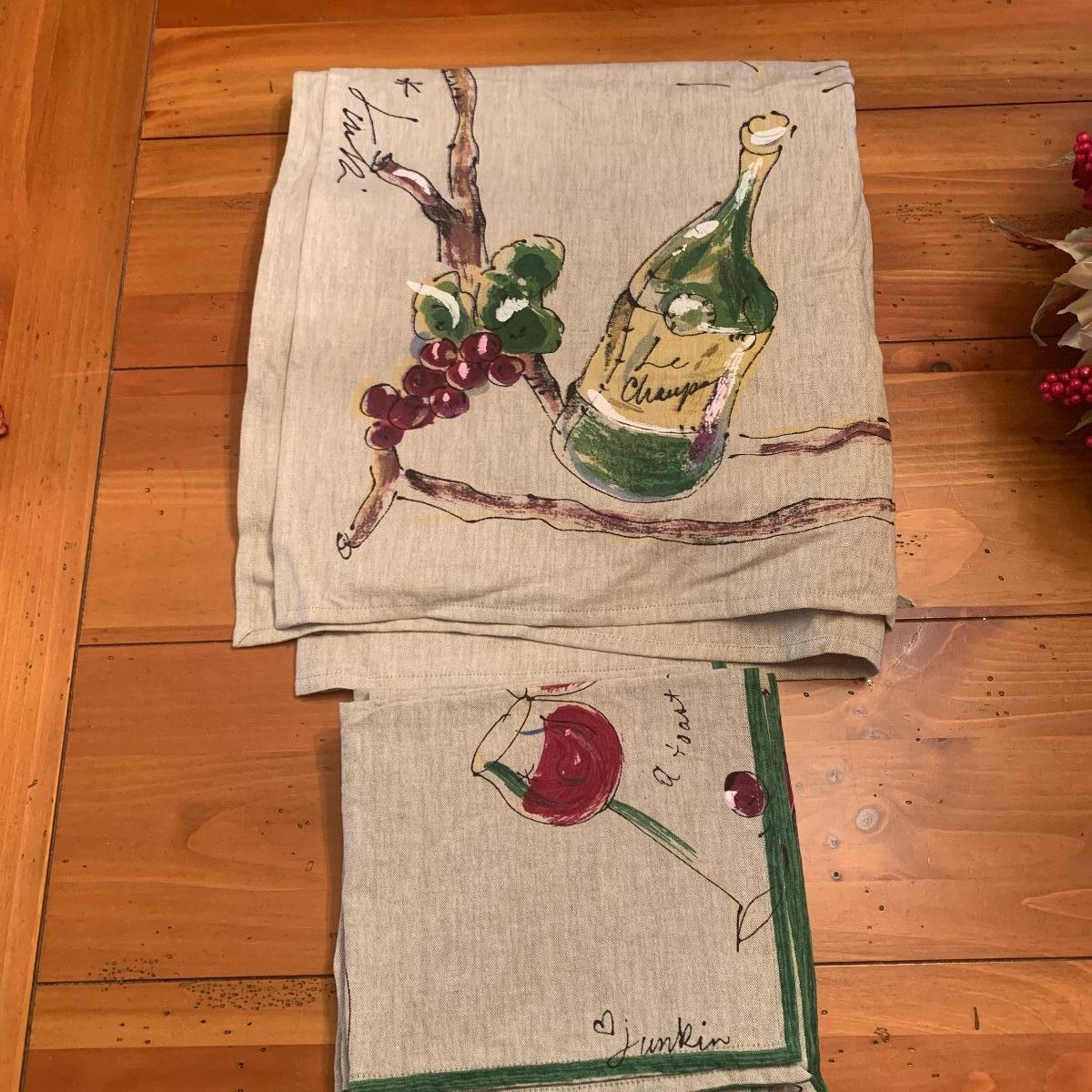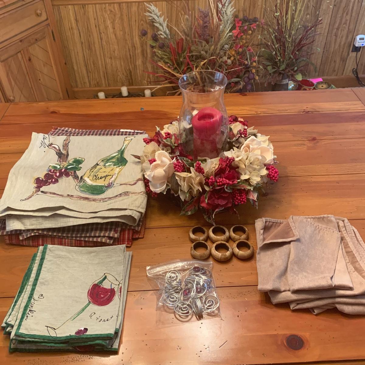 This group includes a dining centerpiece, two sets of napkin rings, a set of napkins, three sets of placemats, and a matching table cloth/napkin set.tablecloth measures 59” x 59” Local pick up only.