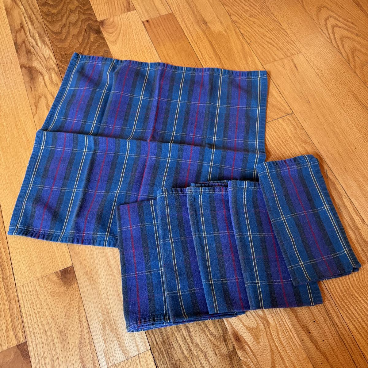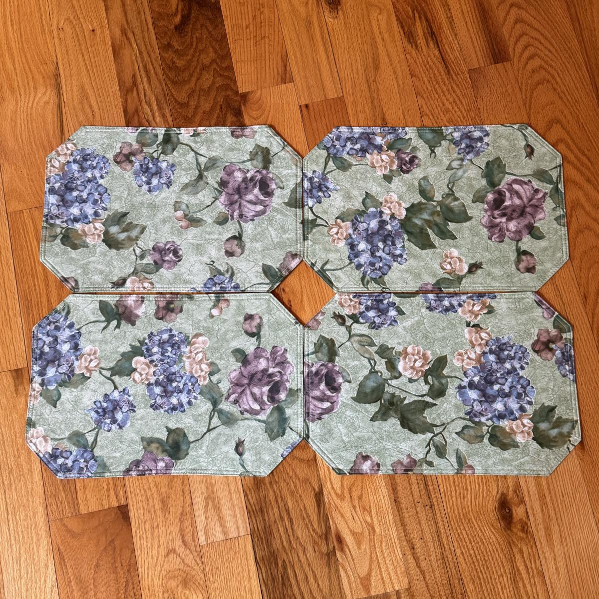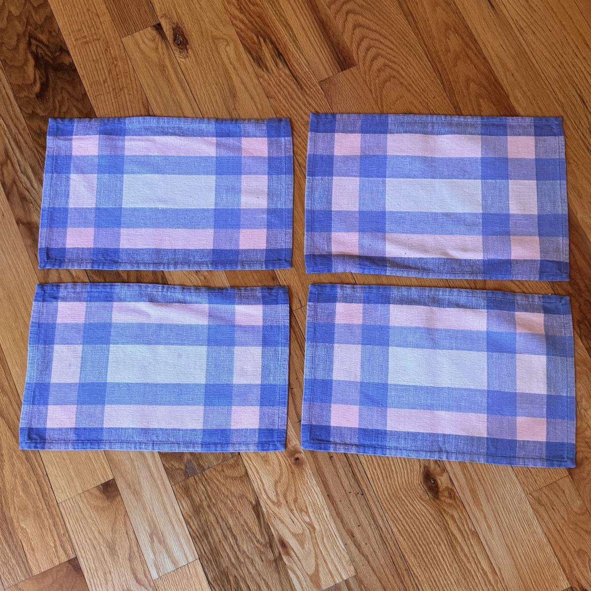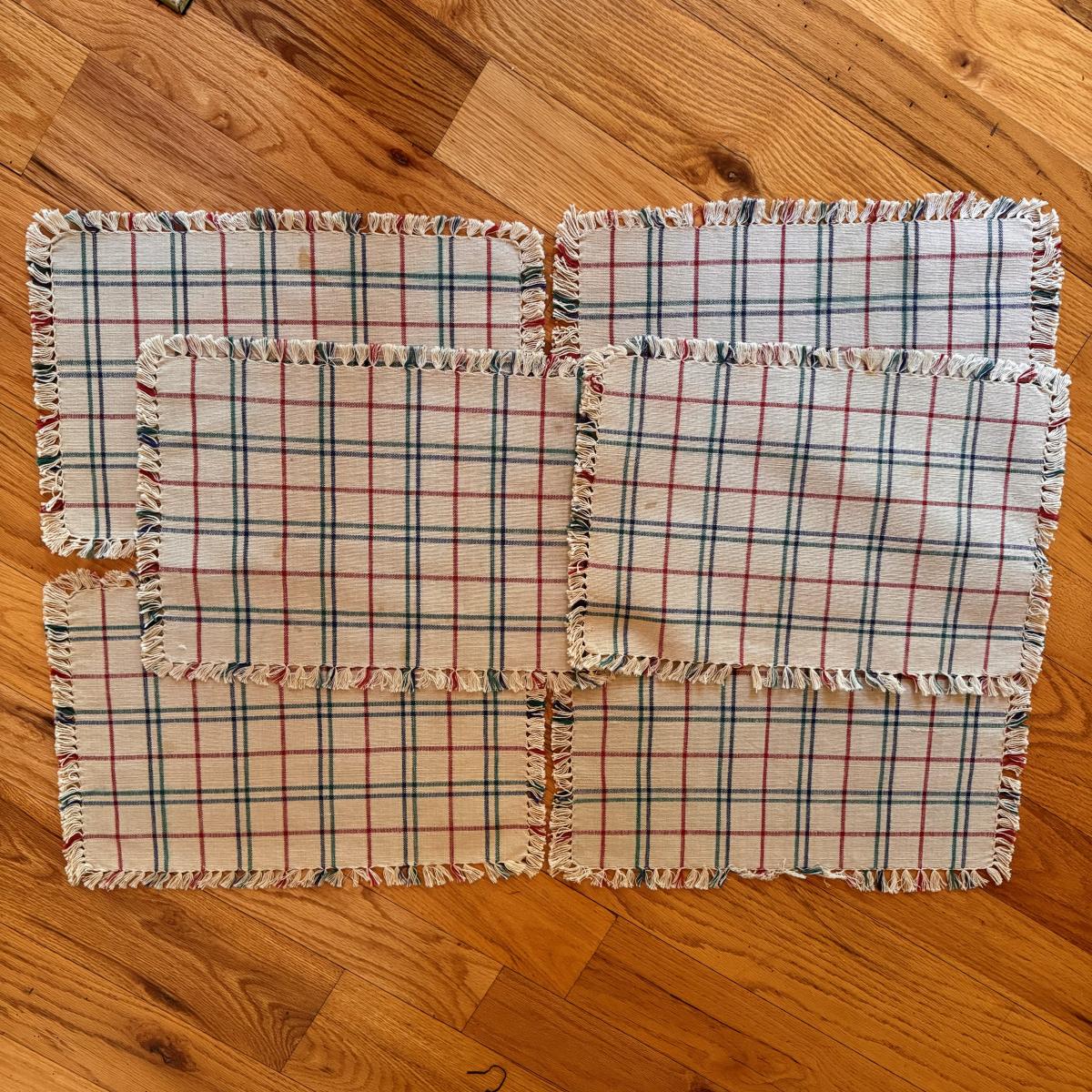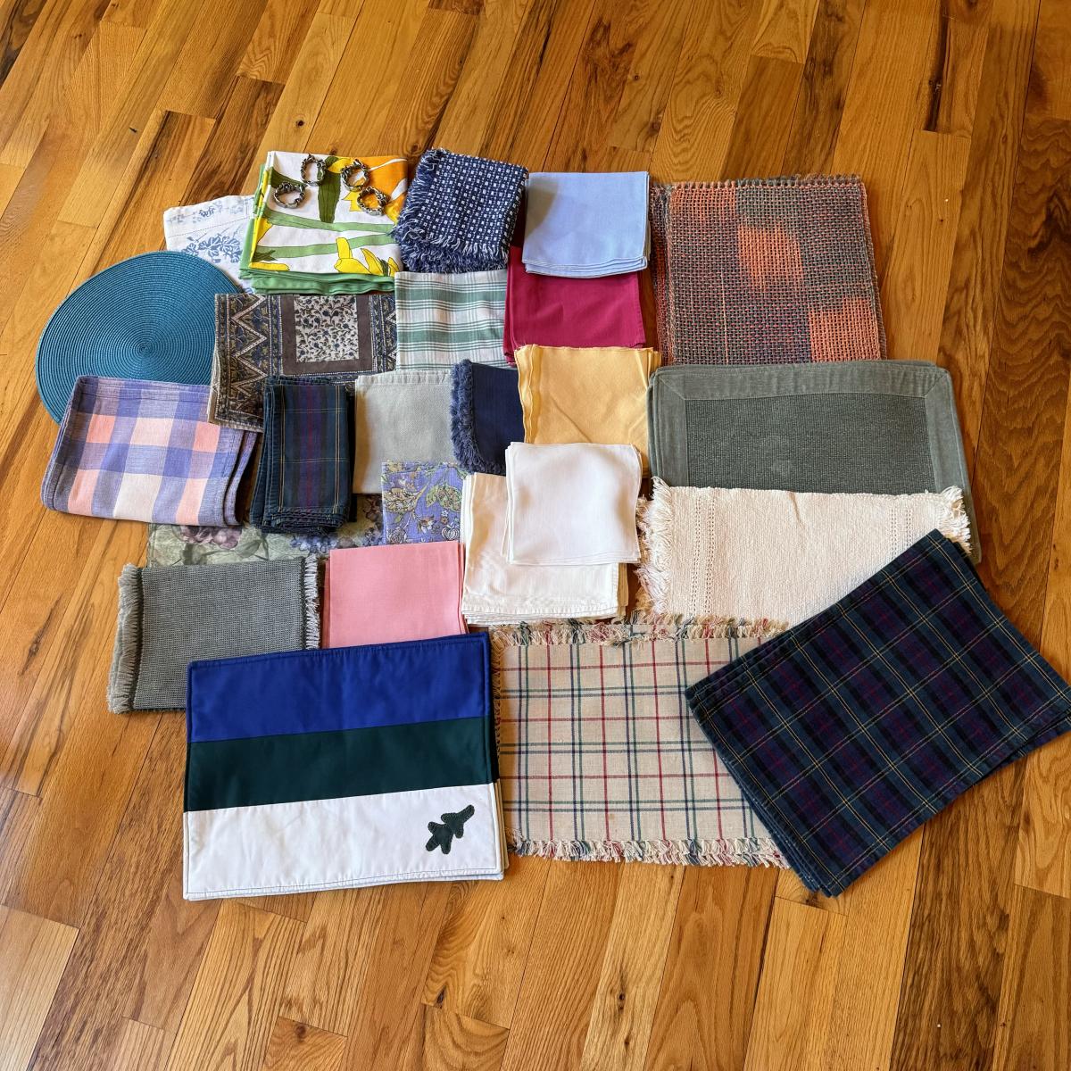 This lot includes six blue, purple, and green placemats, six white with red and green stripes placemats, five white placemats with green stripes at the end, four grey/blue placemats, five purple and red placemats, four white, green, and blue striped placemats, four blue and purple placemats, one blue table runner, several linen napkins in various colors, four floral placemats, one floral tablecloth, and so much more. The floral table cloth with the green trim is a square that measures 41” on all sides. There are four pewter napkin rings in the lot. Please note there are a few stains on some of the placemats - see pictures included. Shipping available.