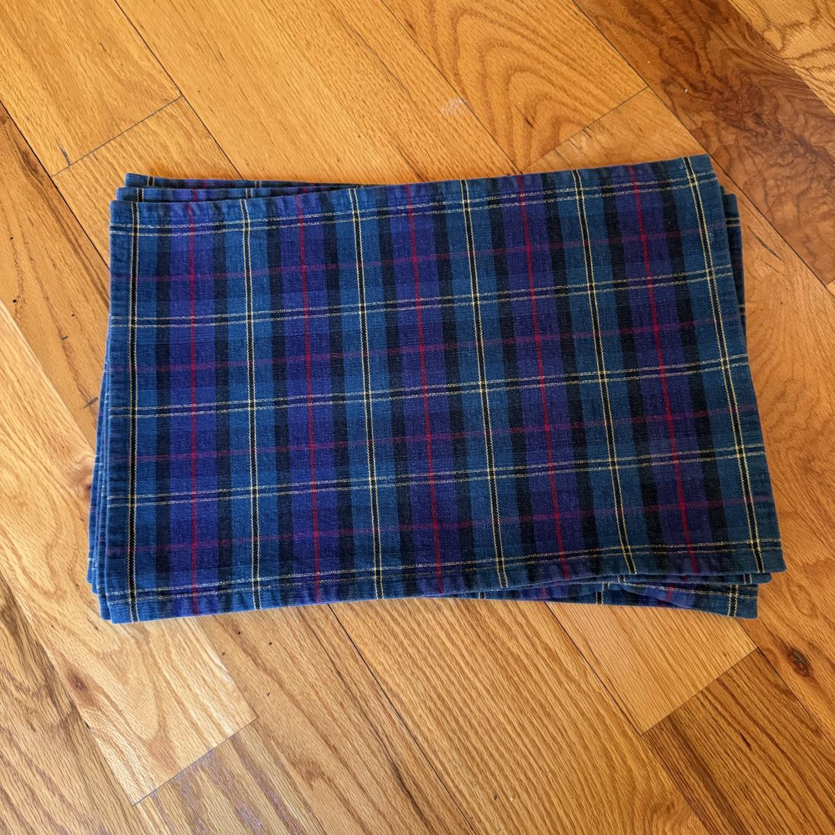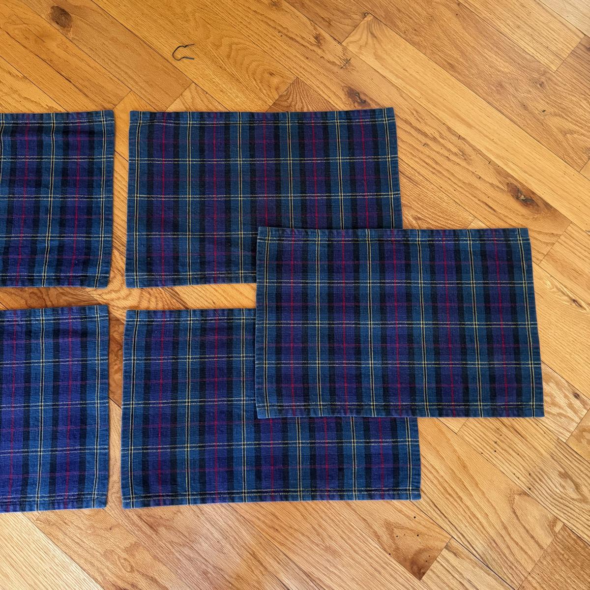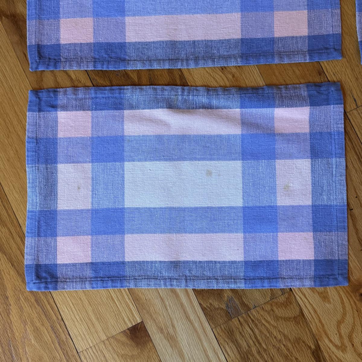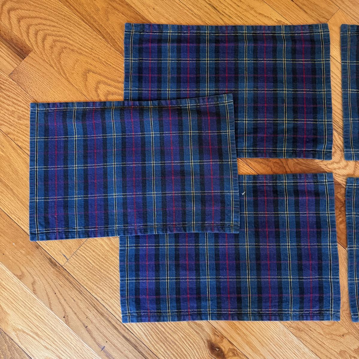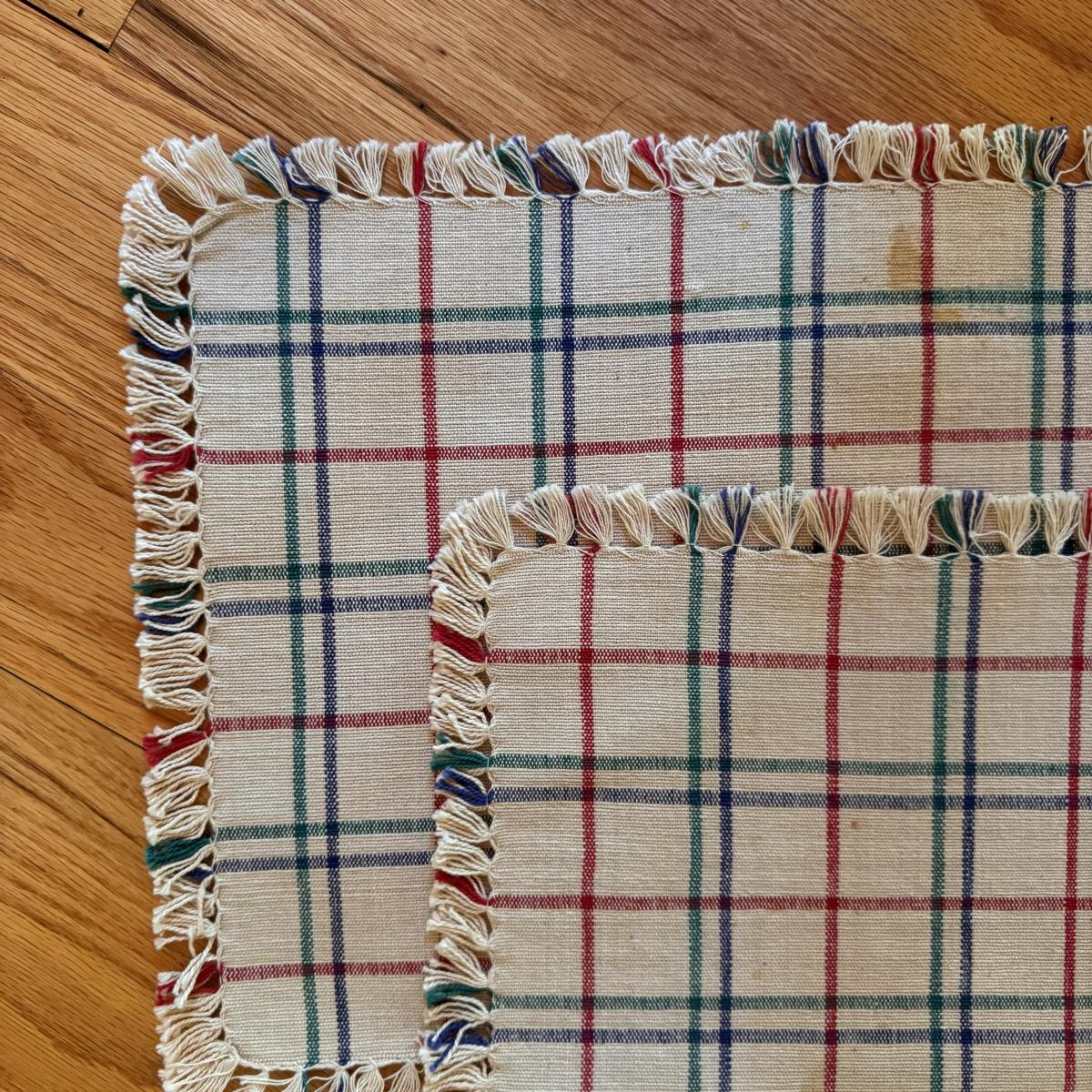 This lot includes six blue, purple, and green placemats, six white with red and green stripes placemats, five white placemats with green stripes at the end, four grey/blue placemats, five purple and red placemats, four white, green, and blue striped placemats, four blue and purple placemats, one blue table runner, several linen napkins in various colors, four floral placemats, one floral tablecloth, and so much more. The floral table cloth with the green trim is a square that measures 41” on all sides. There are four pewter napkin rings in the lot. Please note there are a few stains on some of the placemats - see pictures included. Shipping available.