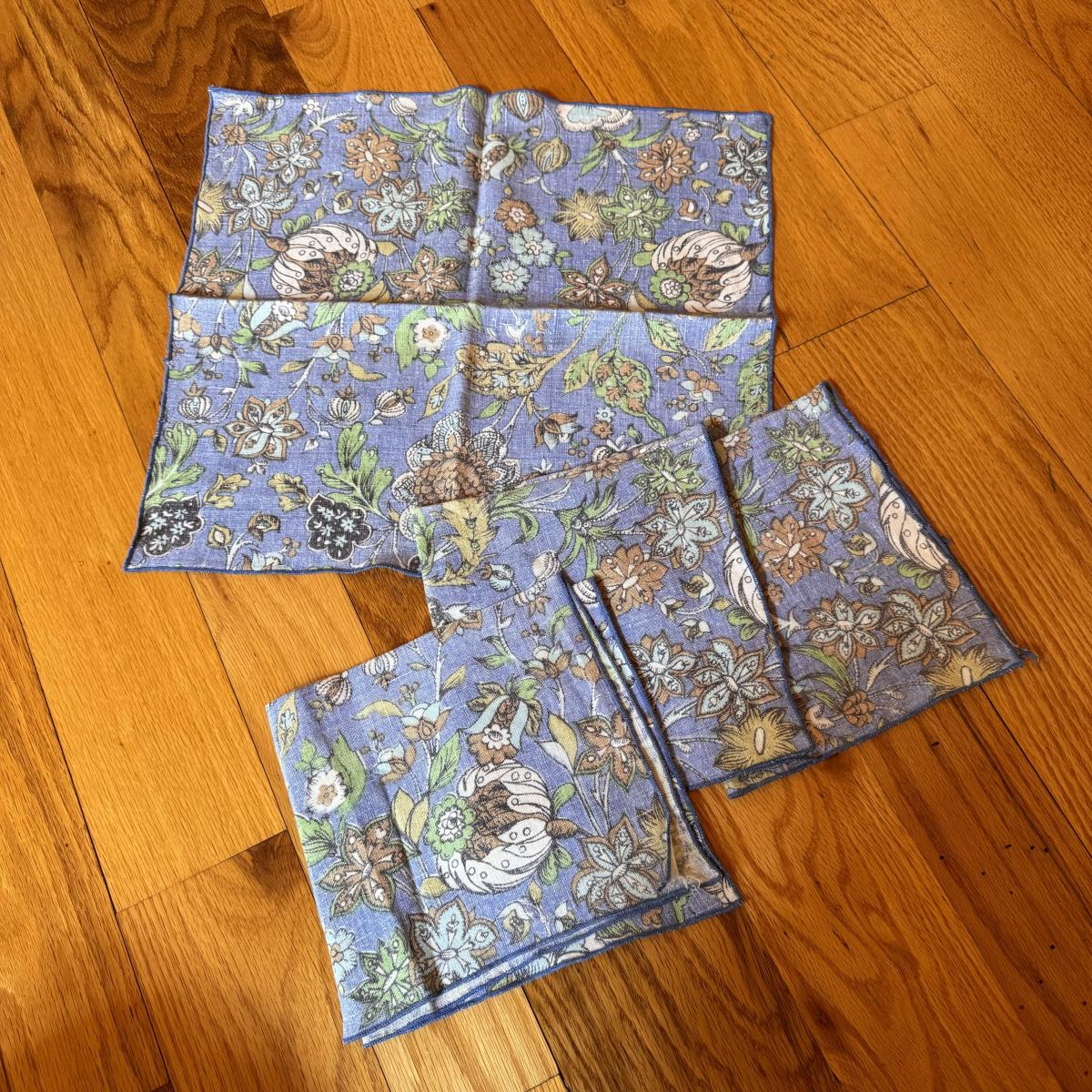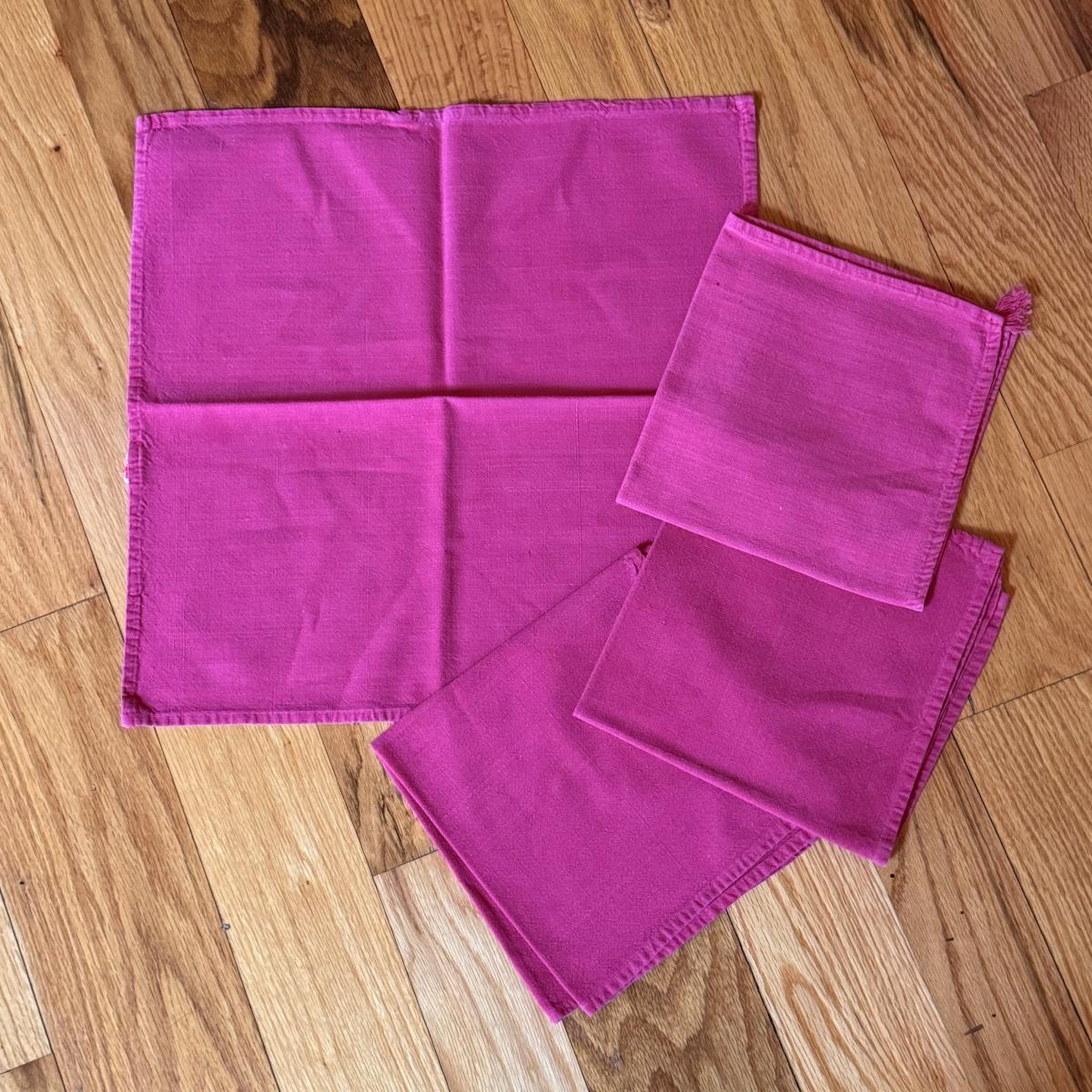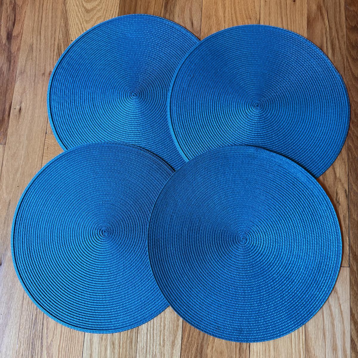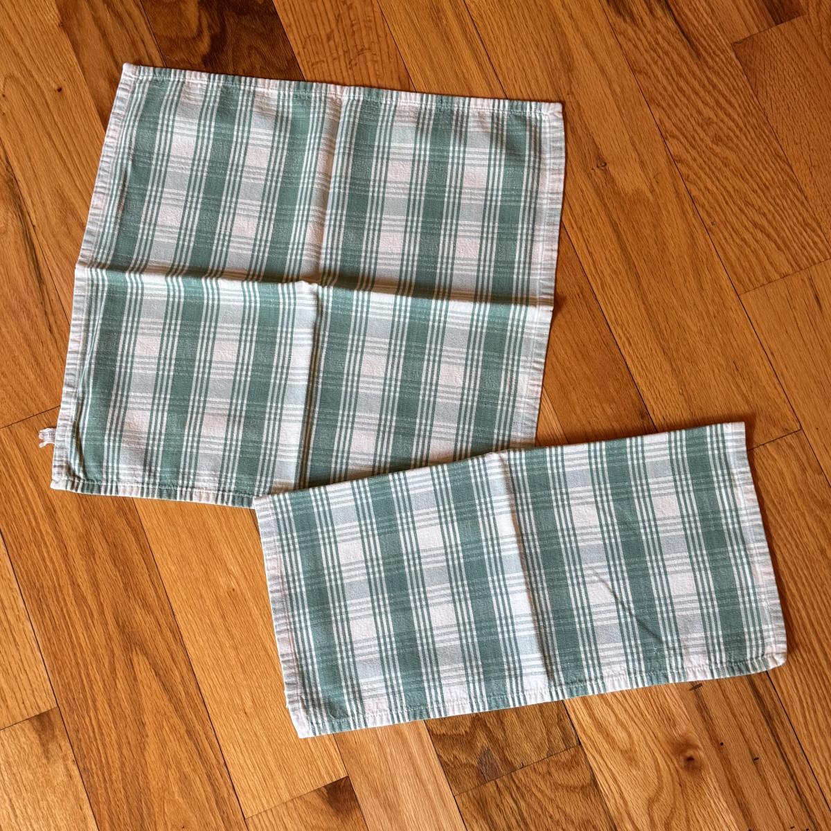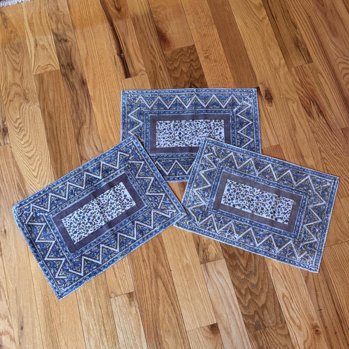 This lot includes six blue, purple, and green placemats, six white with red and green stripes placemats, five white placemats with green stripes at the end, four grey/blue placemats, five purple and red placemats, four white, green, and blue striped placemats, four blue and purple placemats, one blue table runner, several linen napkins in various colors, four floral placemats, one floral tablecloth, and so much more. The floral table cloth with the green trim is a square that measures 41” on all sides. There are four pewter napkin rings in the lot. Please note there are a few stains on some of the placemats - see pictures included. Shipping available.