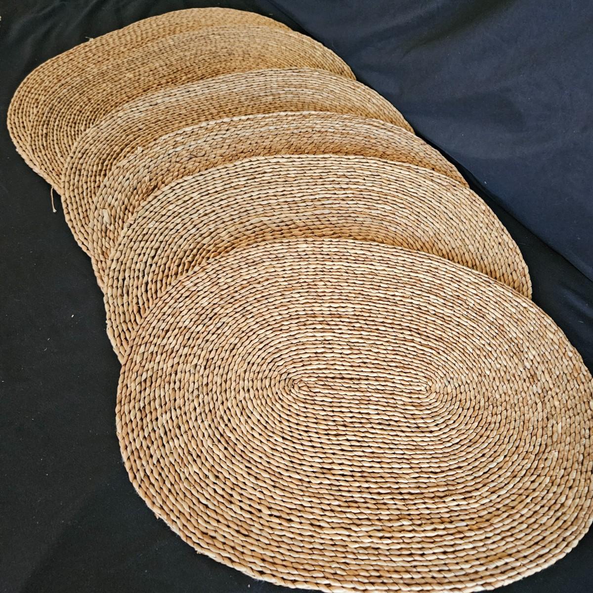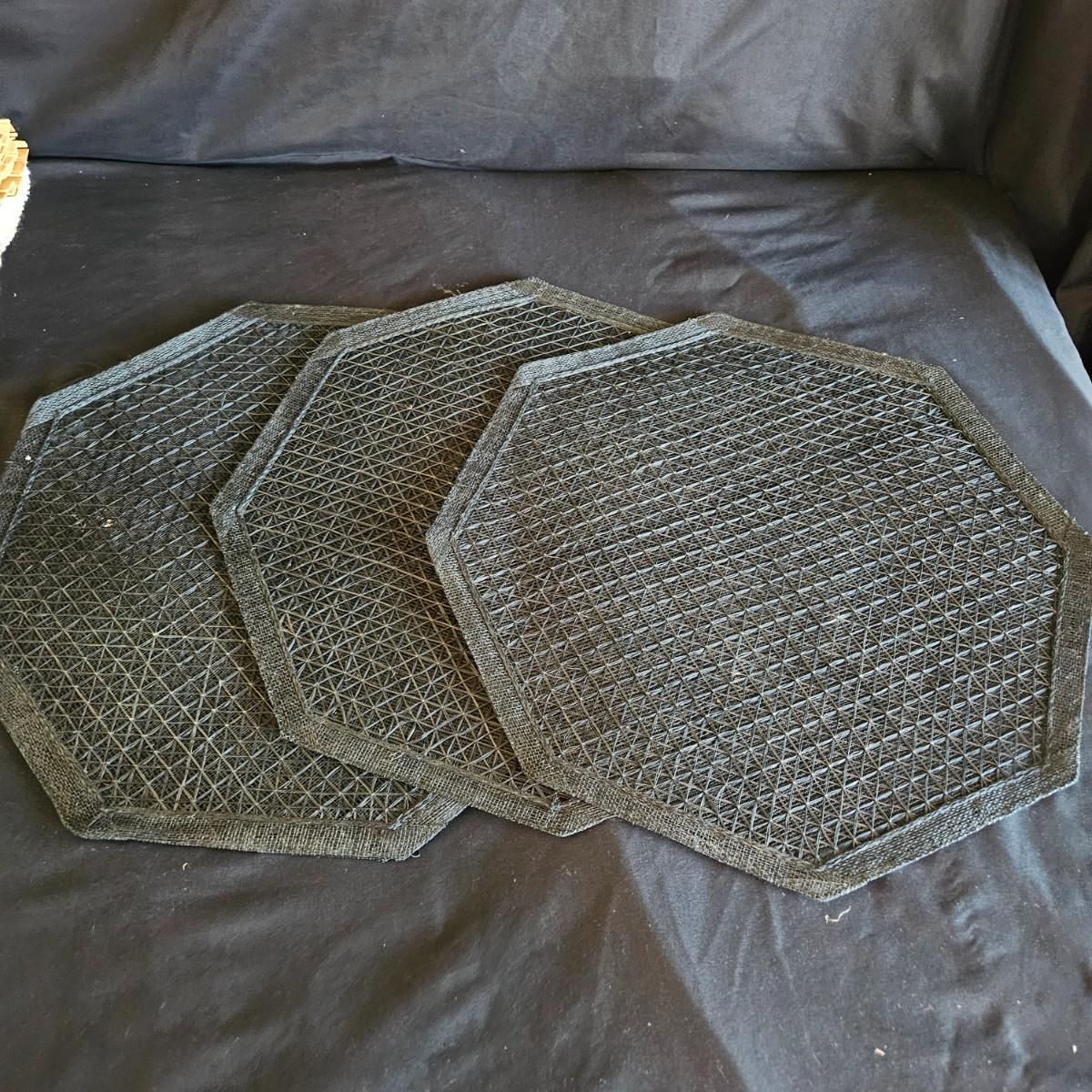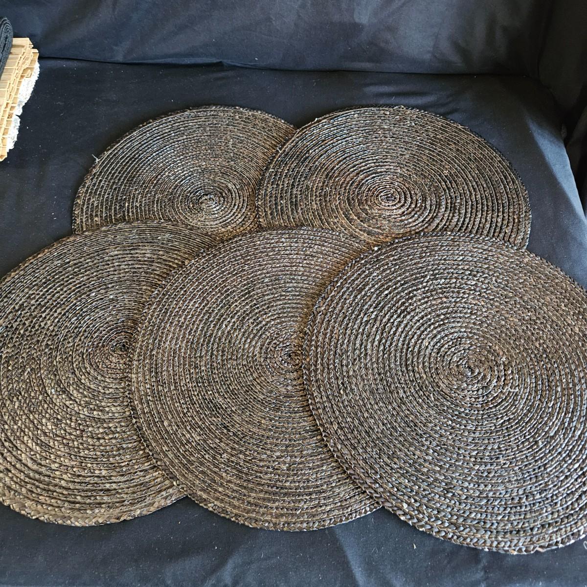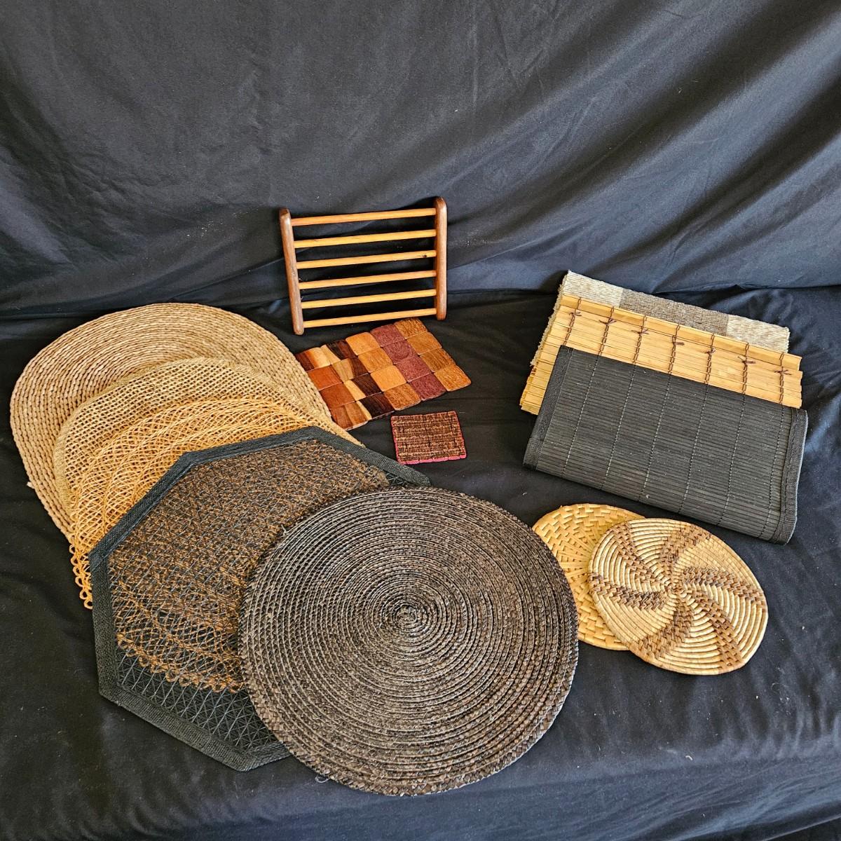 An assortment of placemats, table runners and trivets in a variety of styles and materials. The average size of the table runners is 72" x 14" and they are linen and bamboo. Also includes a variety of placemats, some are woven rush and grass, linen and fabric. The trivets are made of wood and woven rush. Shipping available