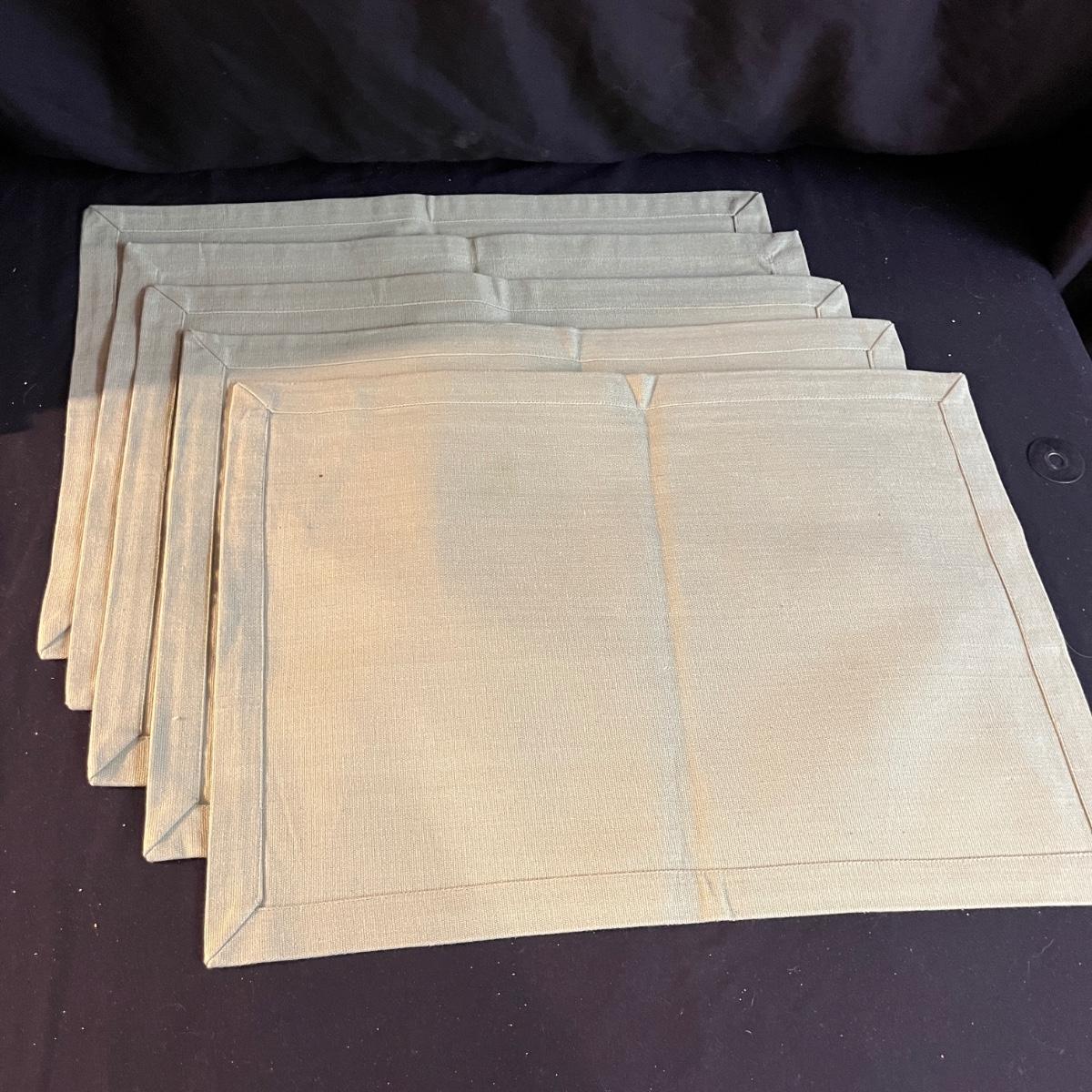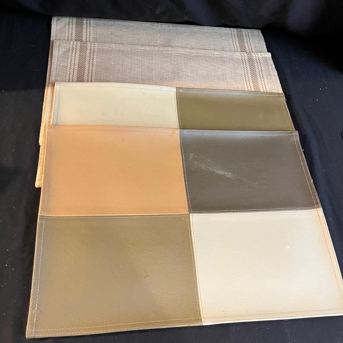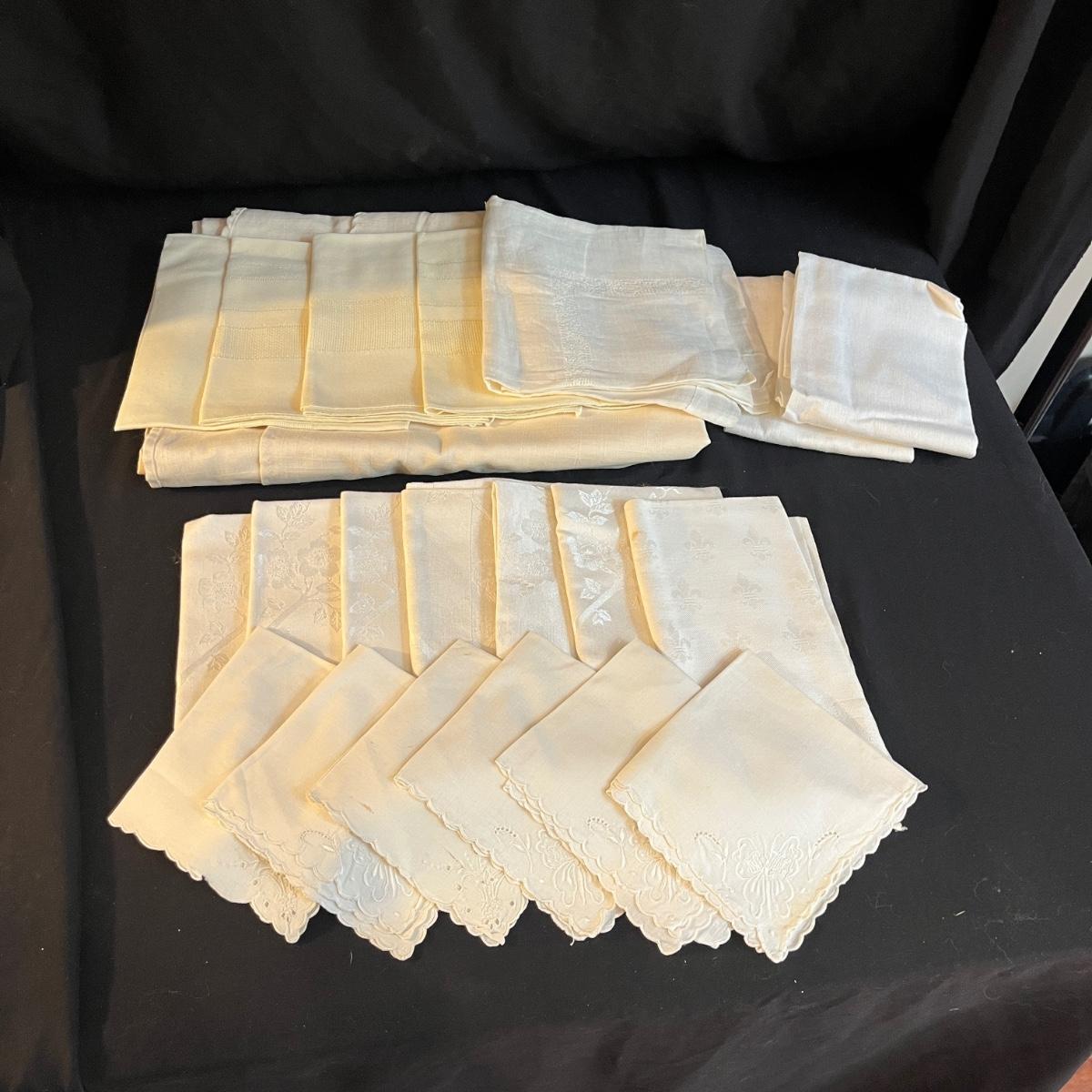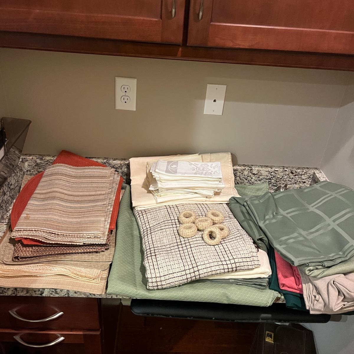 Lot includes a large selection of fabric placemats, linens and a variety of tablecloths in a selection of colors. Tablecloths are displayed on a queen bed that is not included. Largest tablecloth measures 86”D.