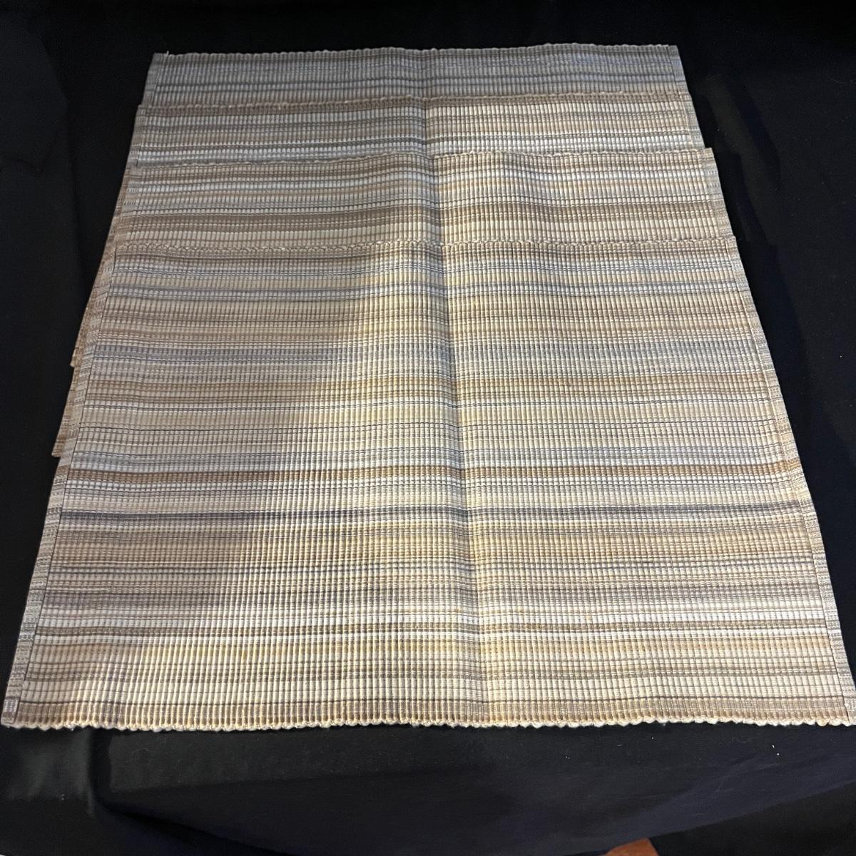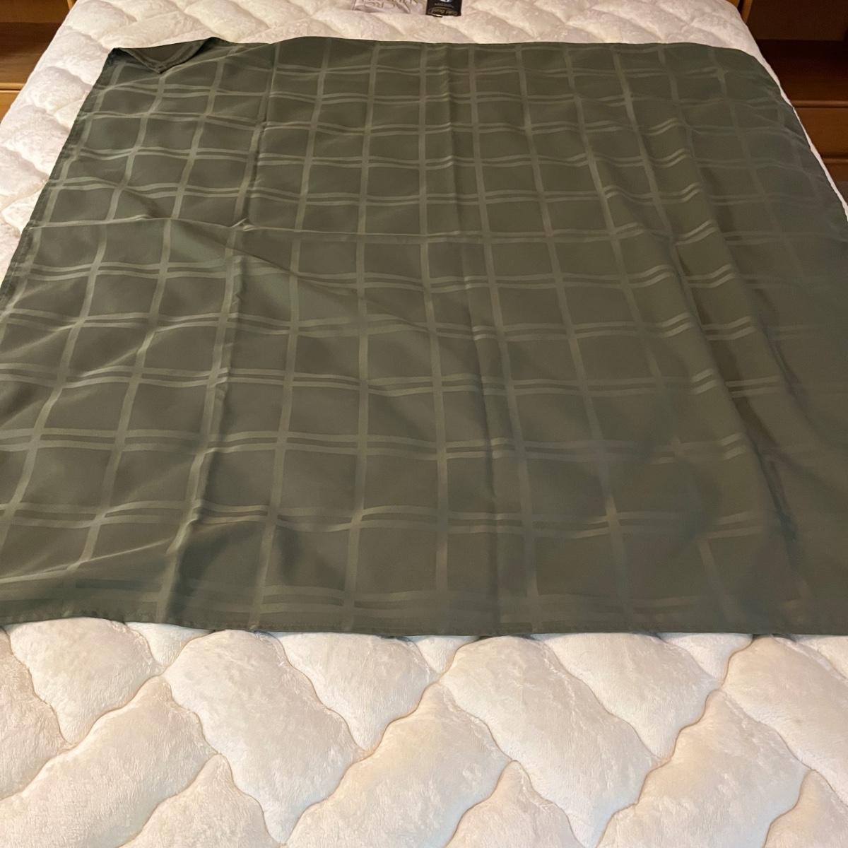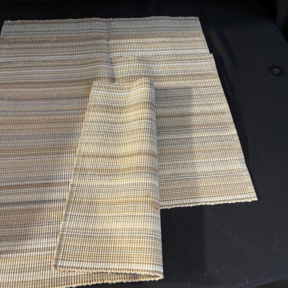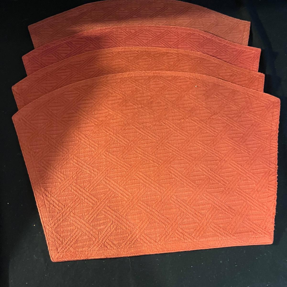 Lot includes a large selection of fabric placemats, linens and a variety of tablecloths in a selection of colors. Tablecloths are displayed on a queen bed that is not included. Largest tablecloth measures 86”D.