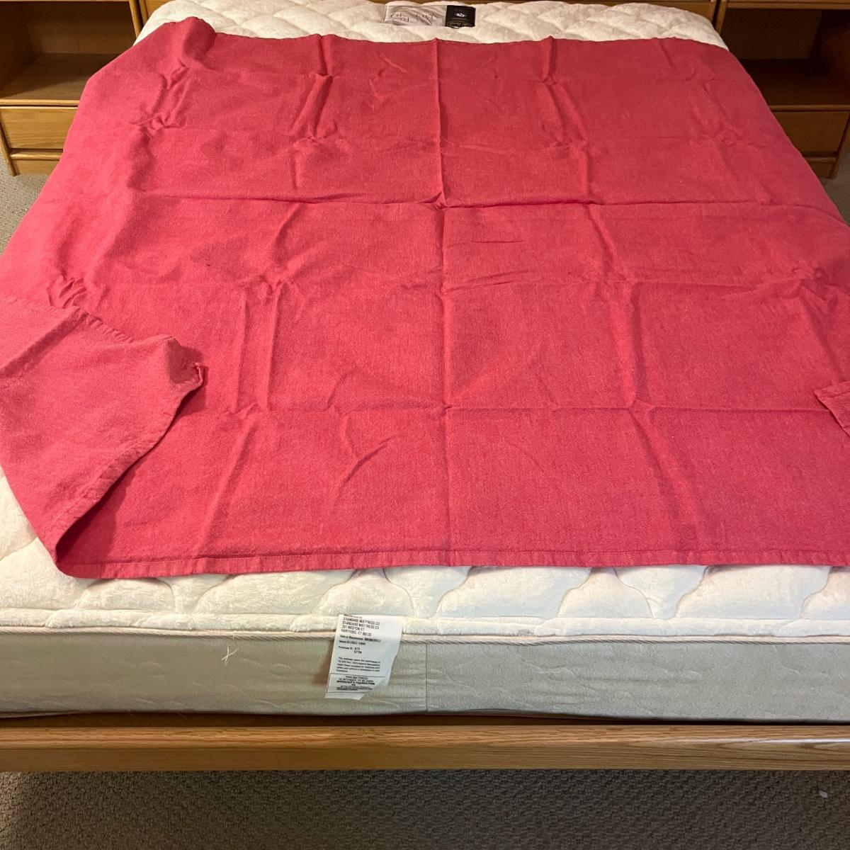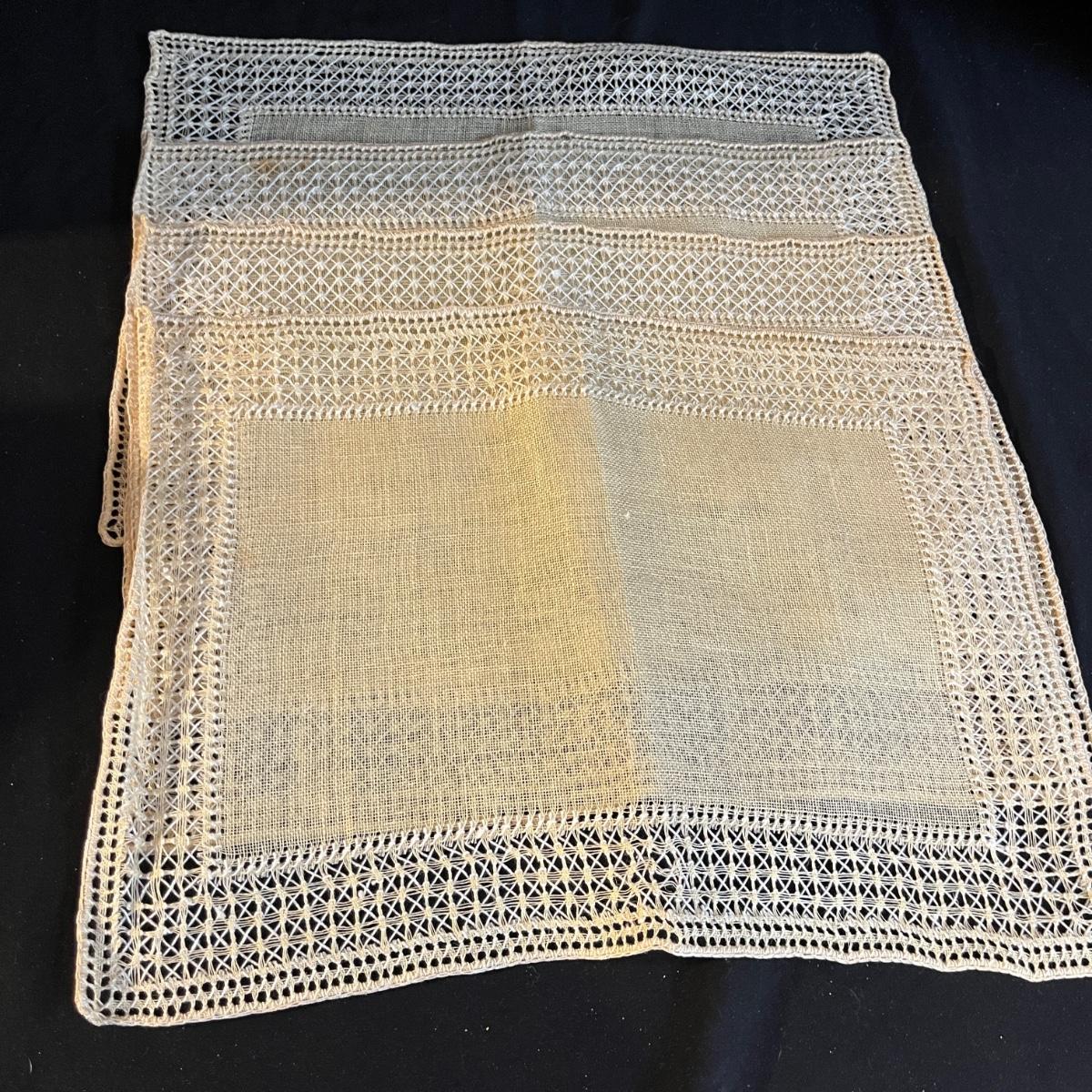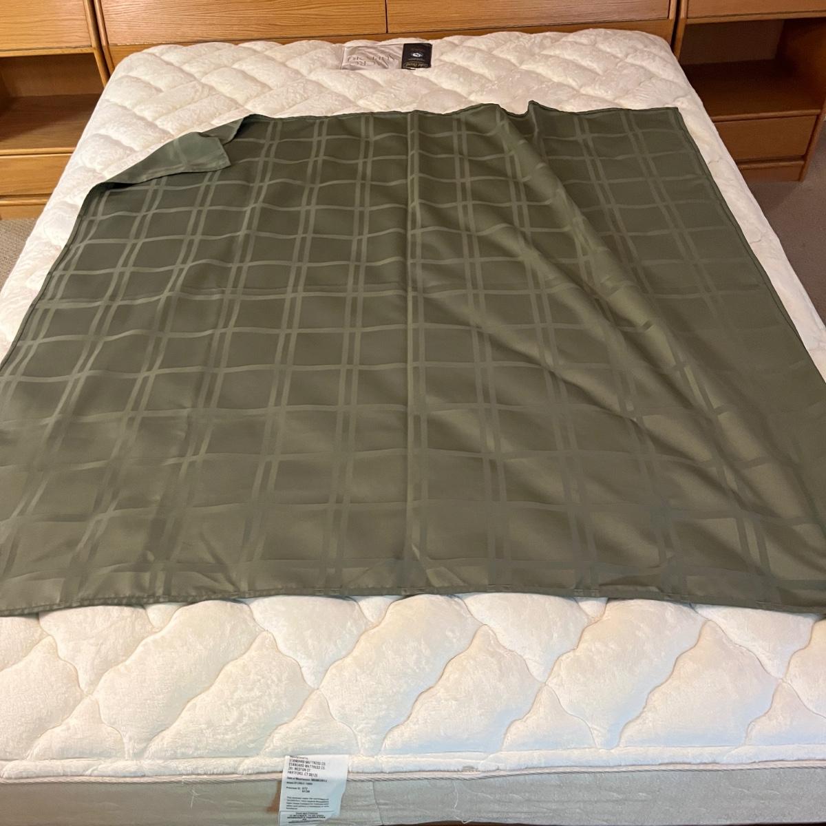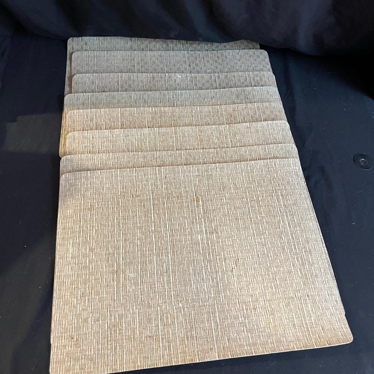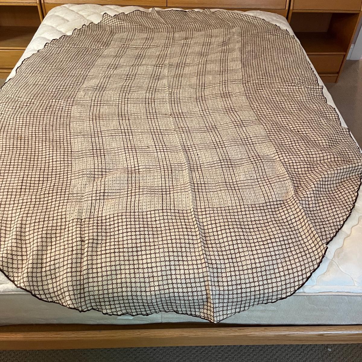 Lot includes a large selection of fabric placemats, linens and a variety of tablecloths in a selection of colors. Tablecloths are displayed on a queen bed that is not included. Largest tablecloth measures 86”D.