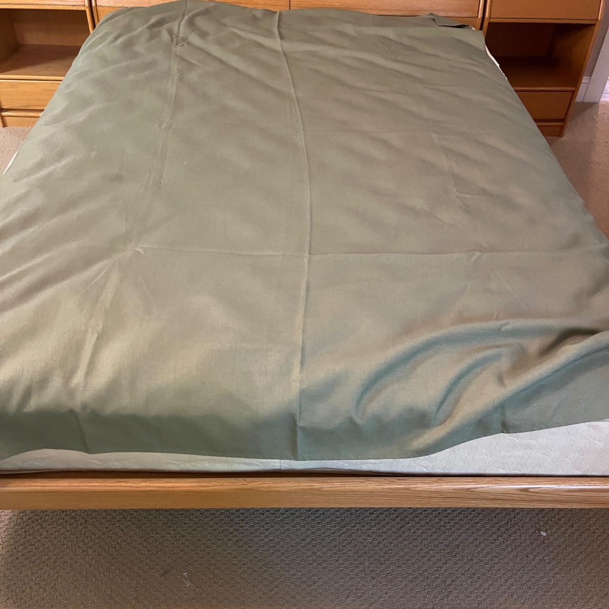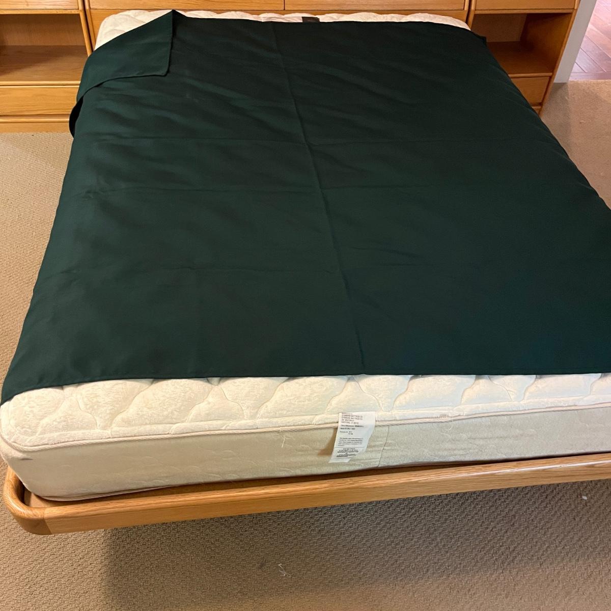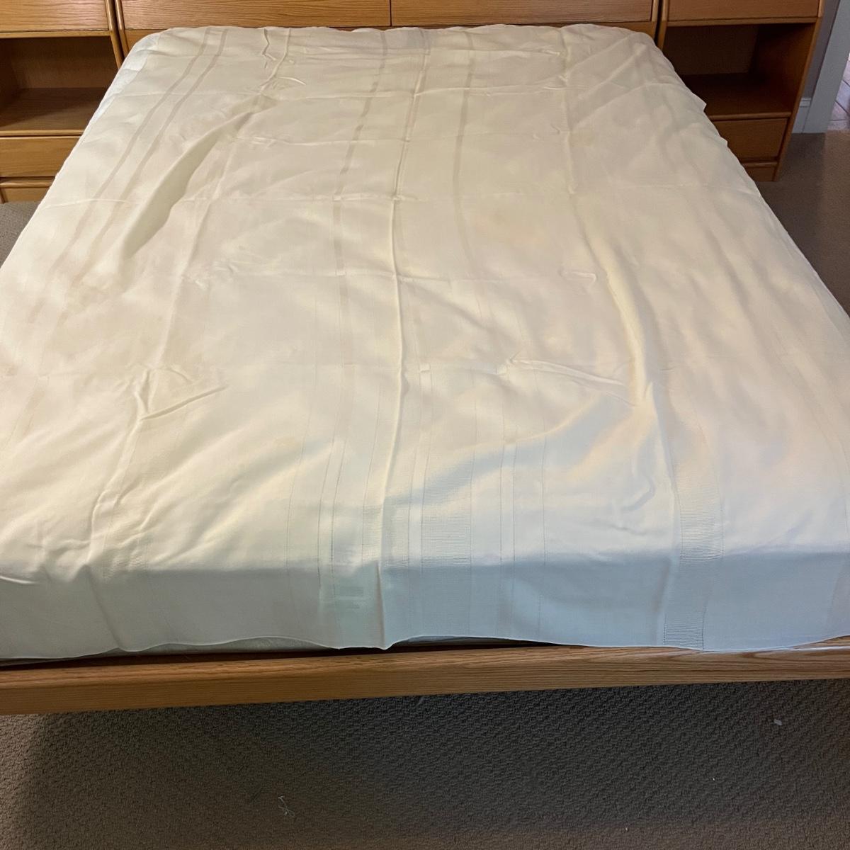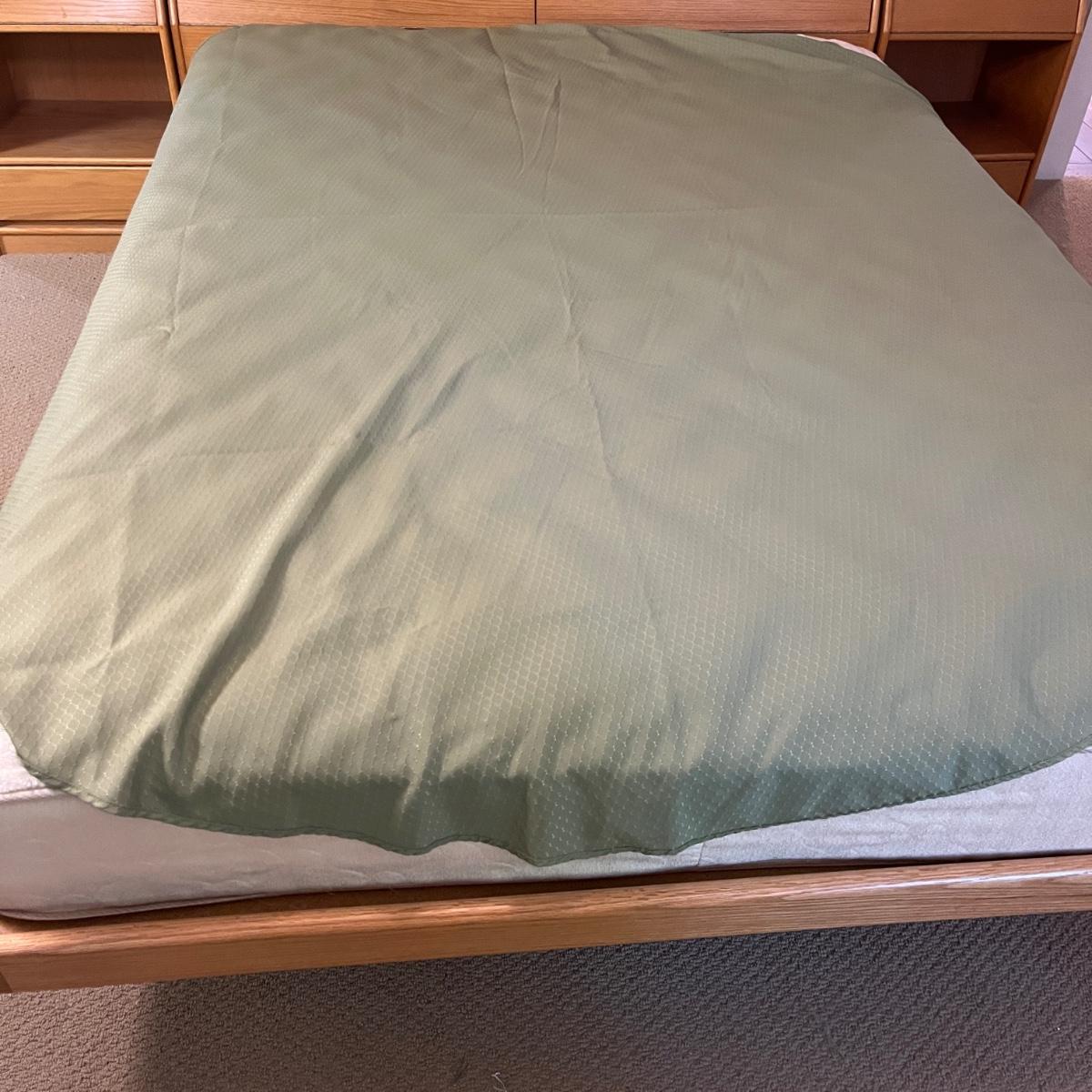 Lot includes a large selection of fabric placemats, linens and a variety of tablecloths in a selection of colors. Tablecloths are displayed on a queen bed that is not included. Largest tablecloth measures 86”D.