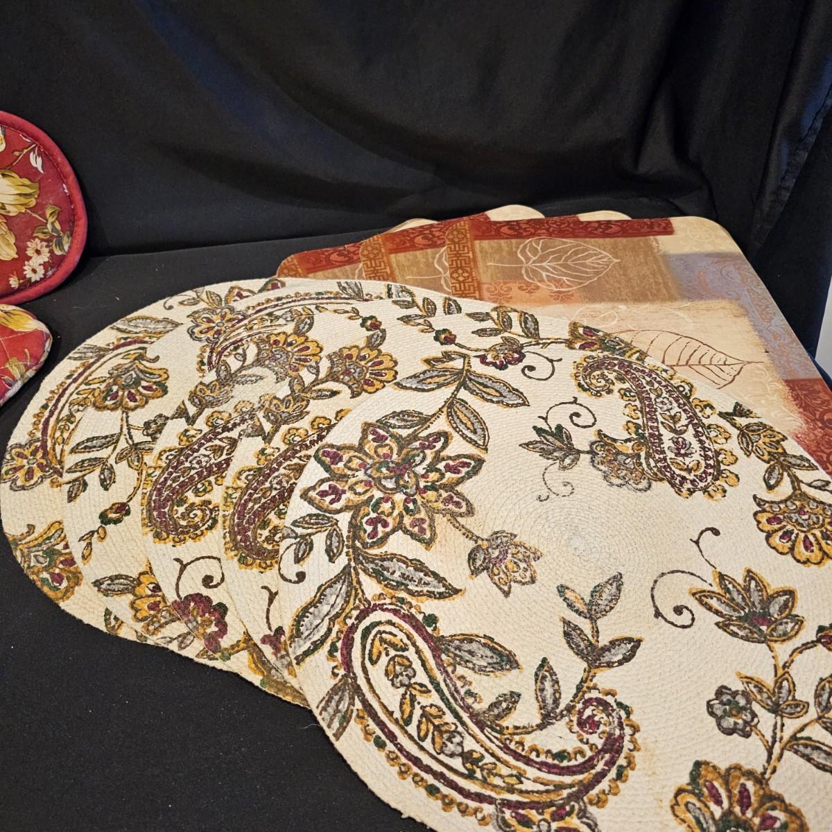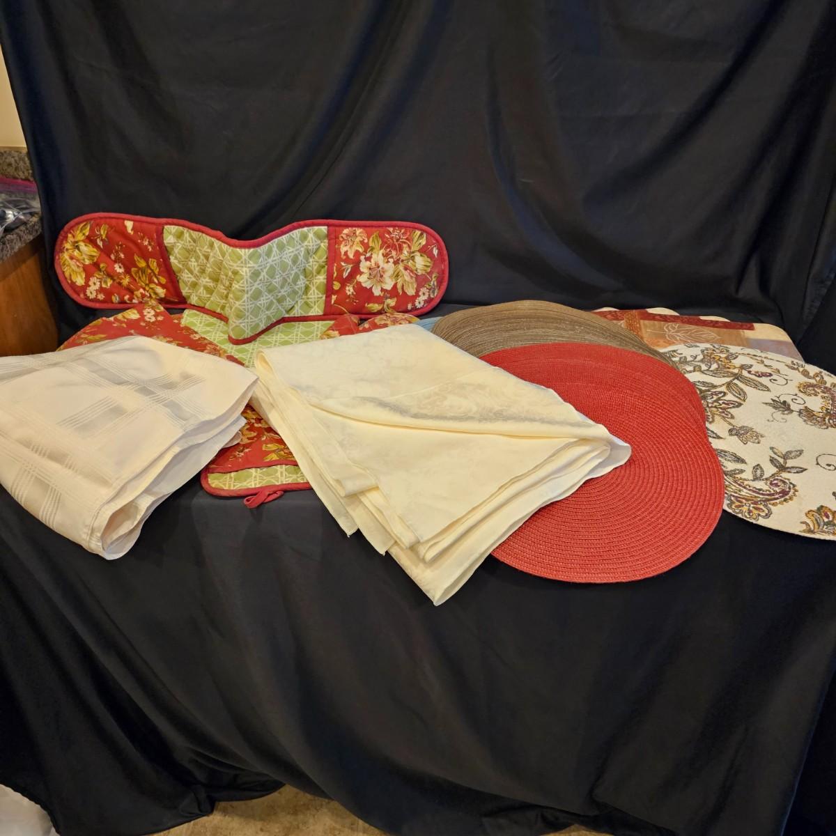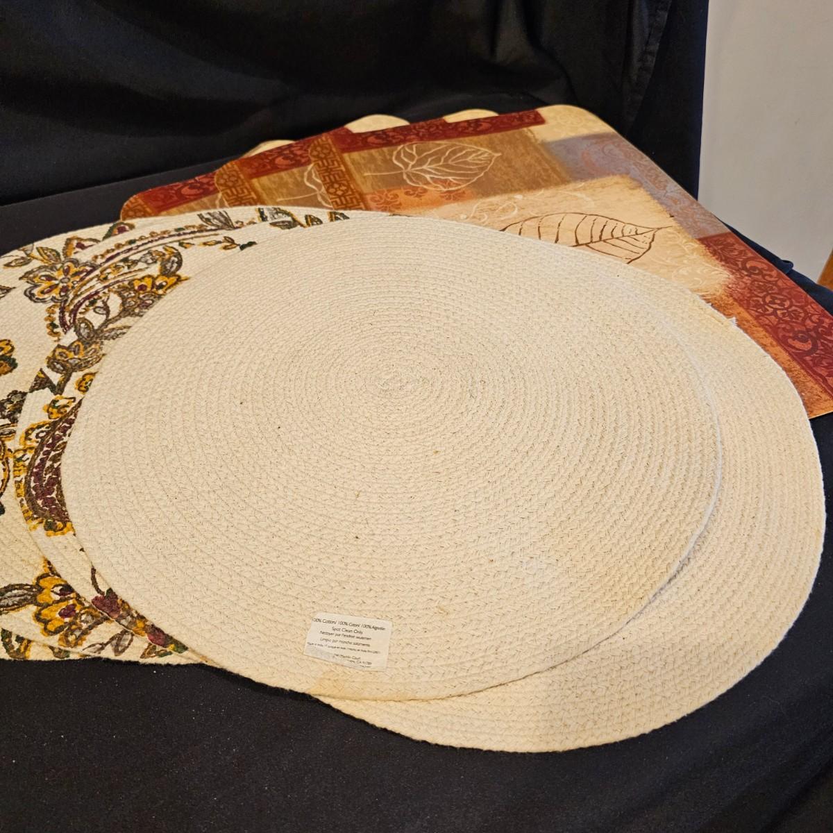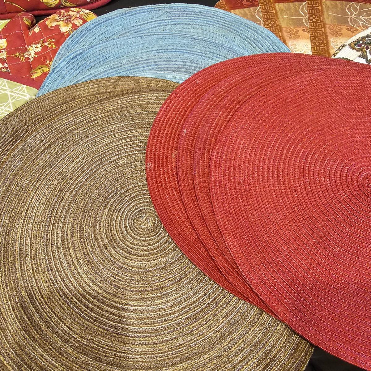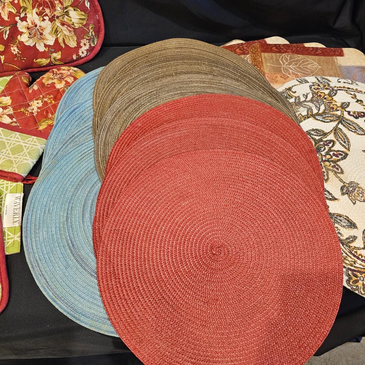 Several different styles and shapes of placemats. Twelve solid color blue, red and brown are 14.5" dia. Five round cotton flower pattern are also 14.5" dia. One set of matching rectangular mats that are reversible, 11" x 18". Also includes hot pad, hot mitts. Four rectangular leaf pattern placemats, 11"x 17". And two ivory colored tablecloths, criss-cross design is 56" x 96" and the floral pattern is 60" x 102". See photos for details. Shipping available.