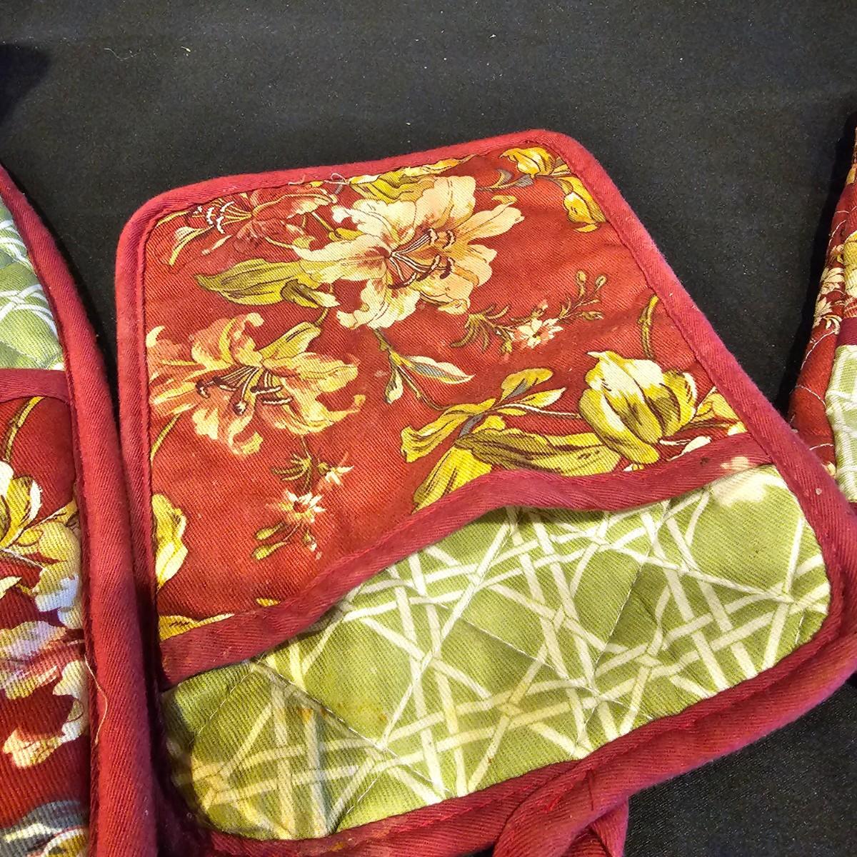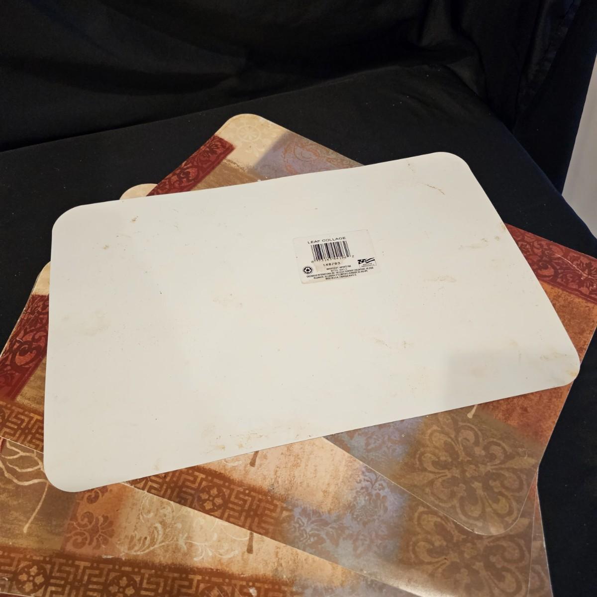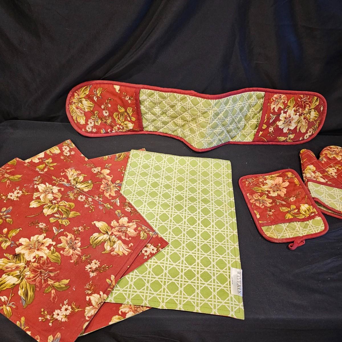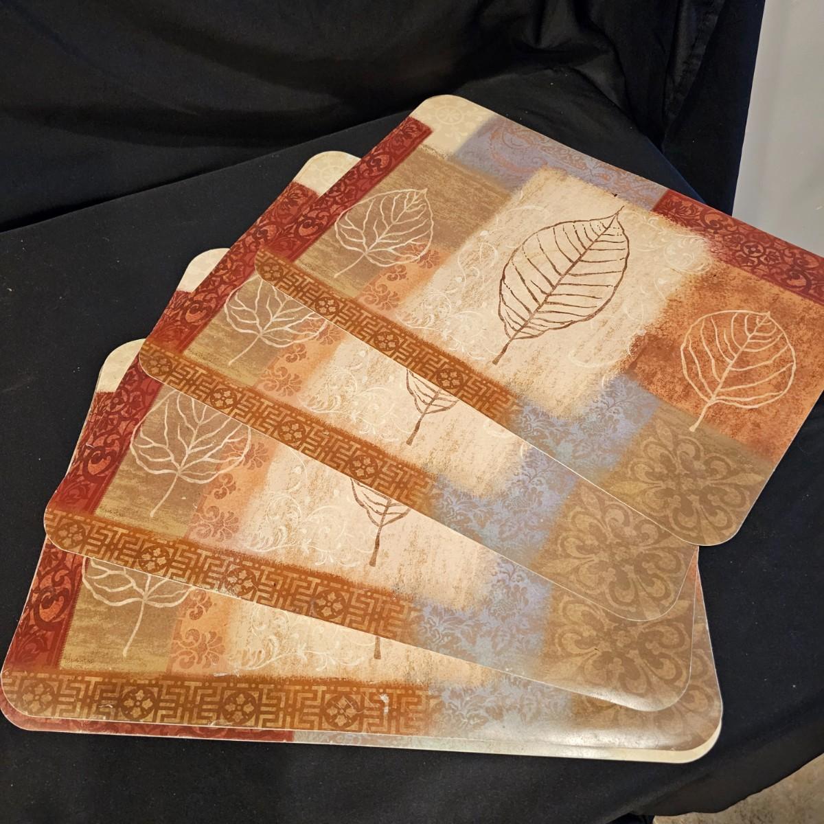 Several different styles and shapes of placemats. Twelve solid color blue, red and brown are 14.5" dia. Five round cotton flower pattern are also 14.5" dia. One set of matching rectangular mats that are reversible, 11" x 18". Also includes hot pad, hot mitts. Four rectangular leaf pattern placemats, 11"x 17". And two ivory colored tablecloths, criss-cross design is 56" x 96" and the floral pattern is 60" x 102". See photos for details. Shipping available.
