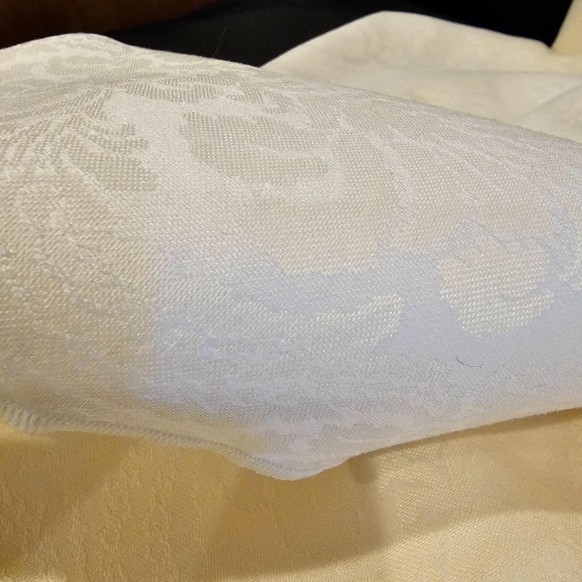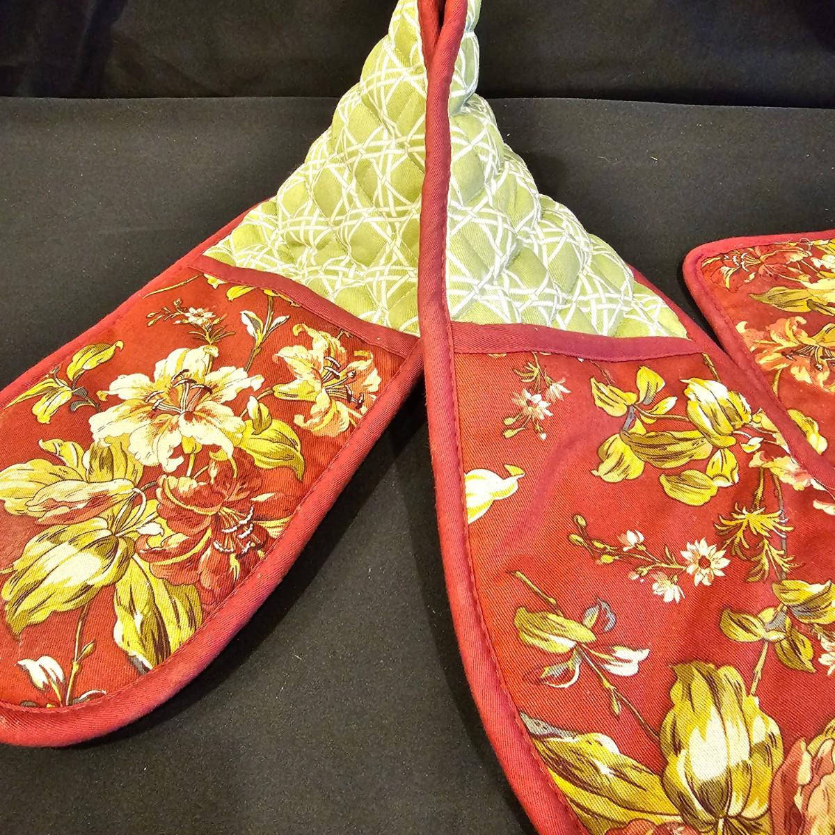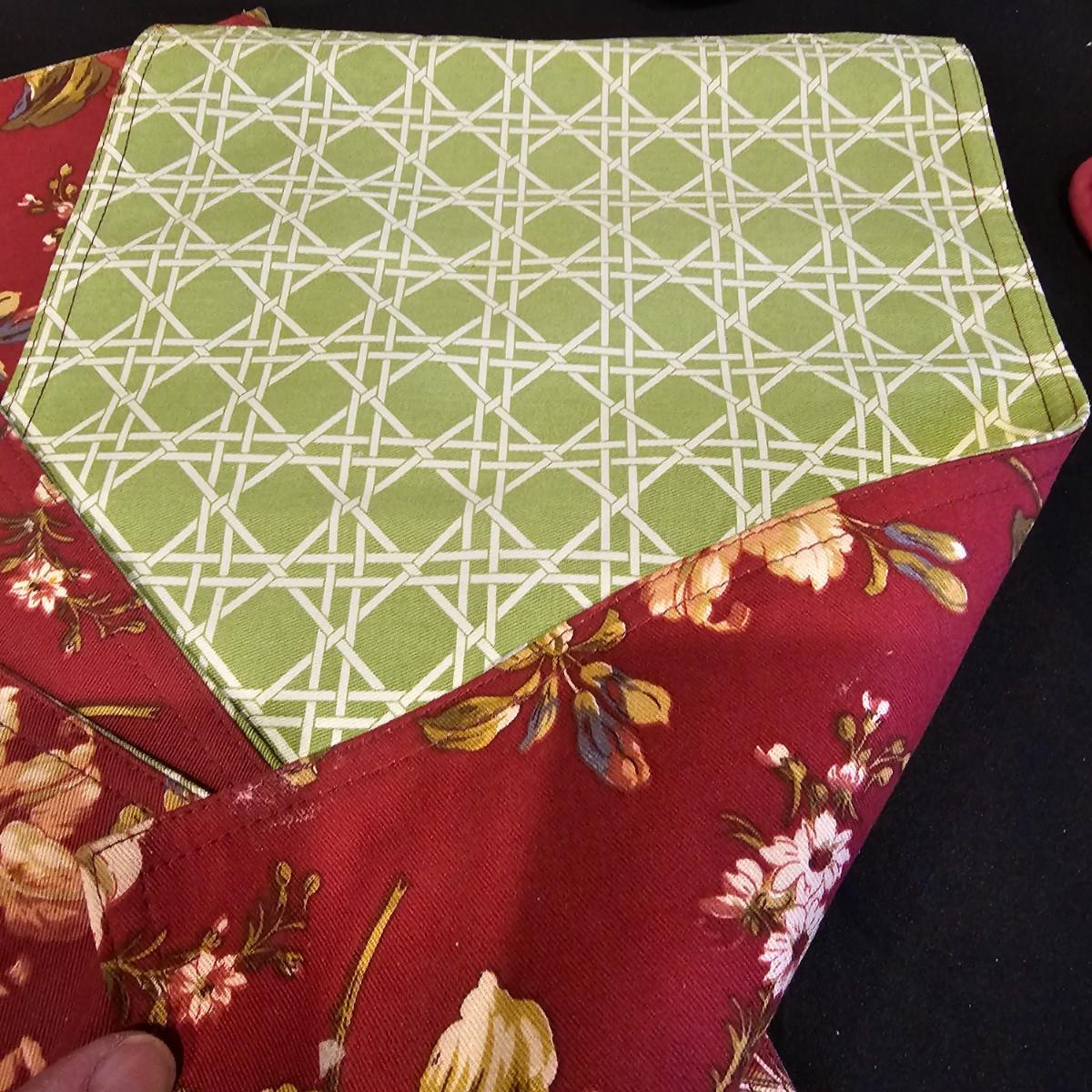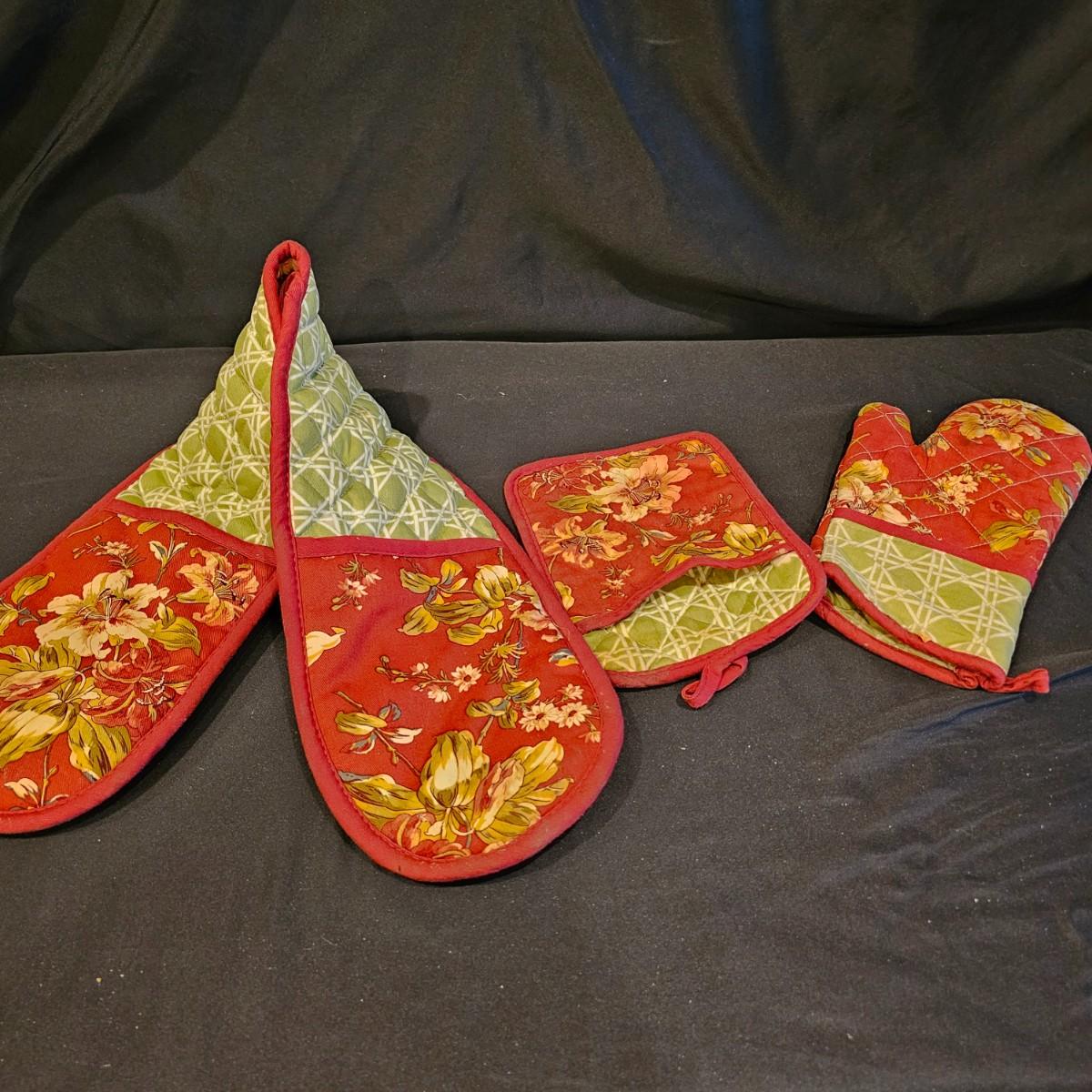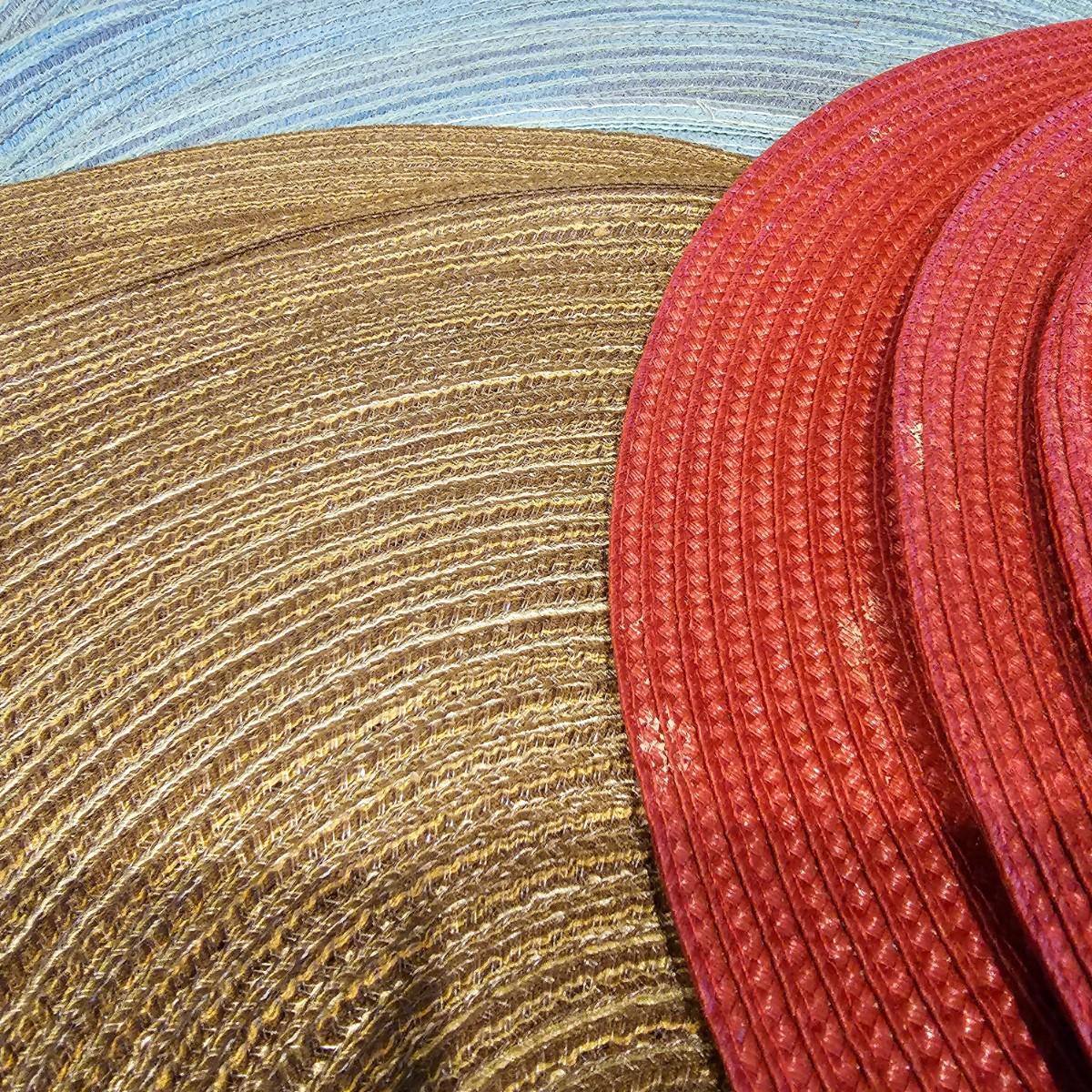 Several different styles and shapes of placemats. Twelve solid color blue, red and brown are 14.5" dia. Five round cotton flower pattern are also 14.5" dia. One set of matching rectangular mats that are reversible, 11" x 18". Also includes hot pad, hot mitts. Four rectangular leaf pattern placemats, 11"x 17". And two ivory colored tablecloths, criss-cross design is 56" x 96" and the floral pattern is 60" x 102". See photos for details. Shipping available.