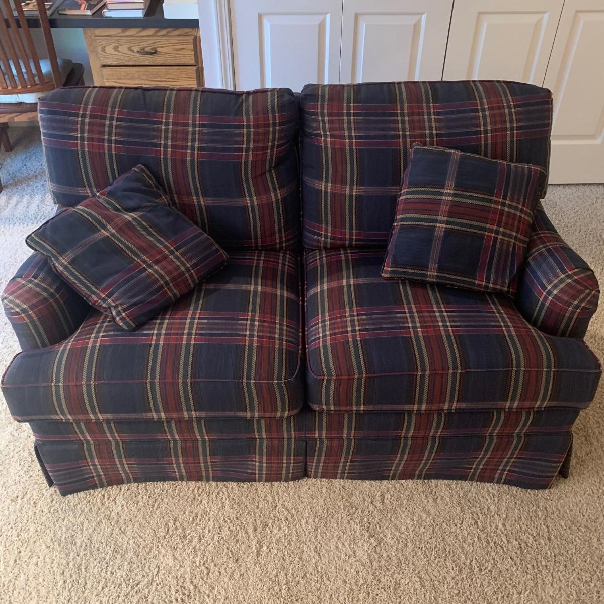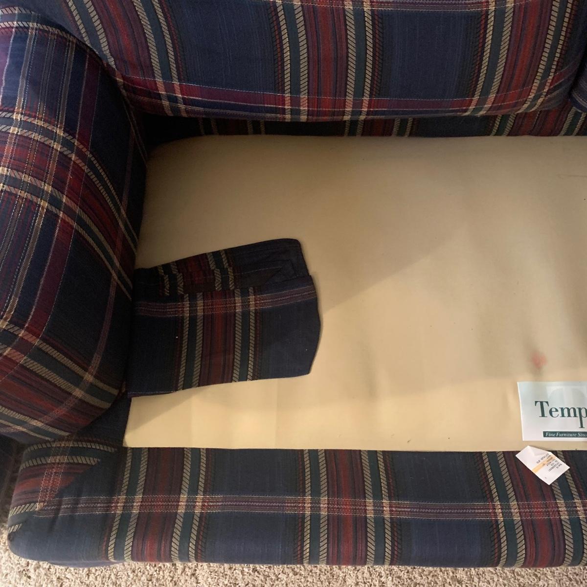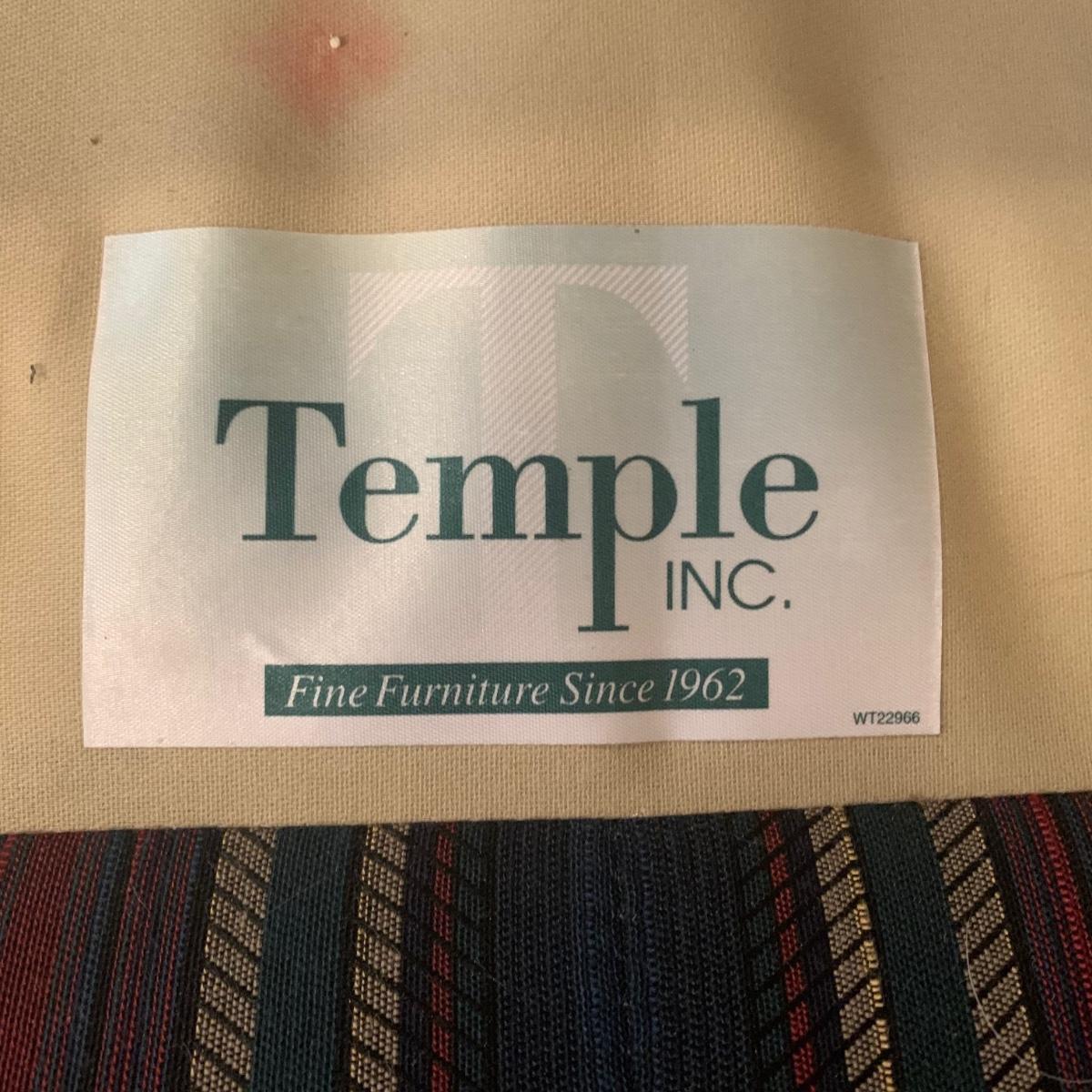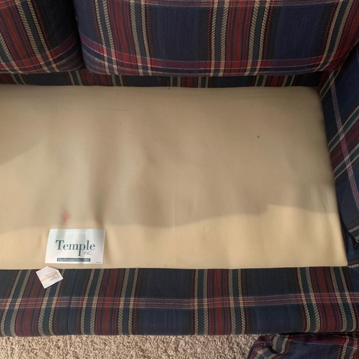 Plaid cloth loveseat by Temple. Loveseat has two cushions and two matching throw pillows. Loveseat measures approximately, 58” x 34” x 35”H with a seat height of 19”H.