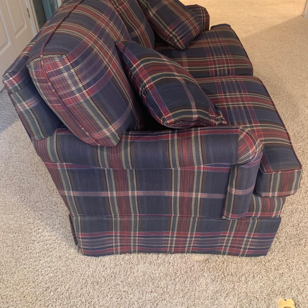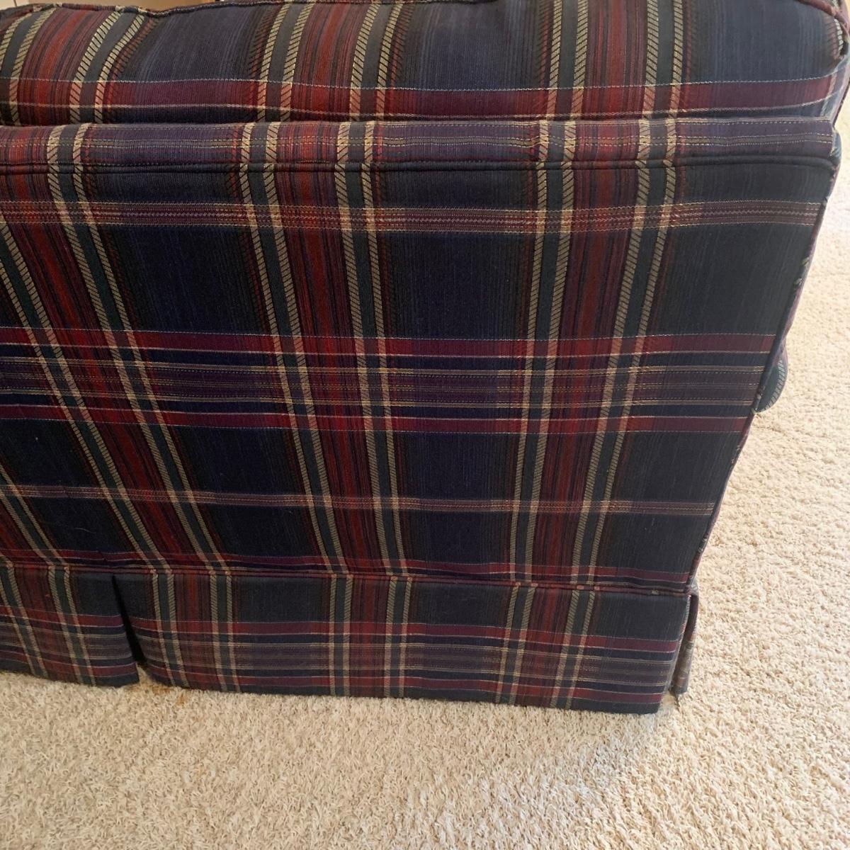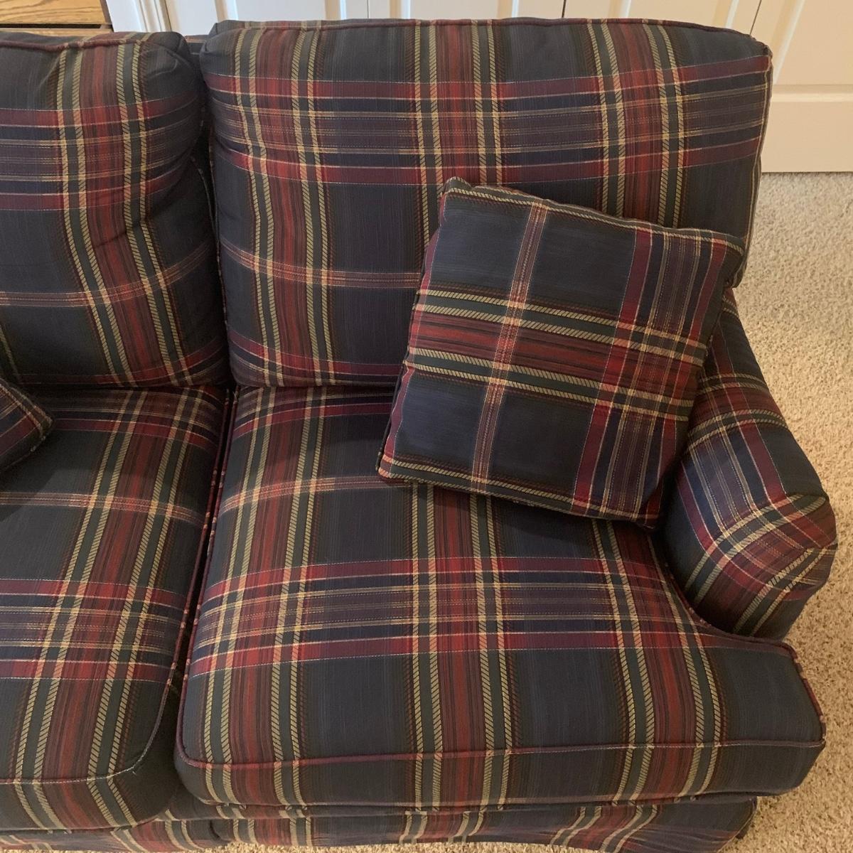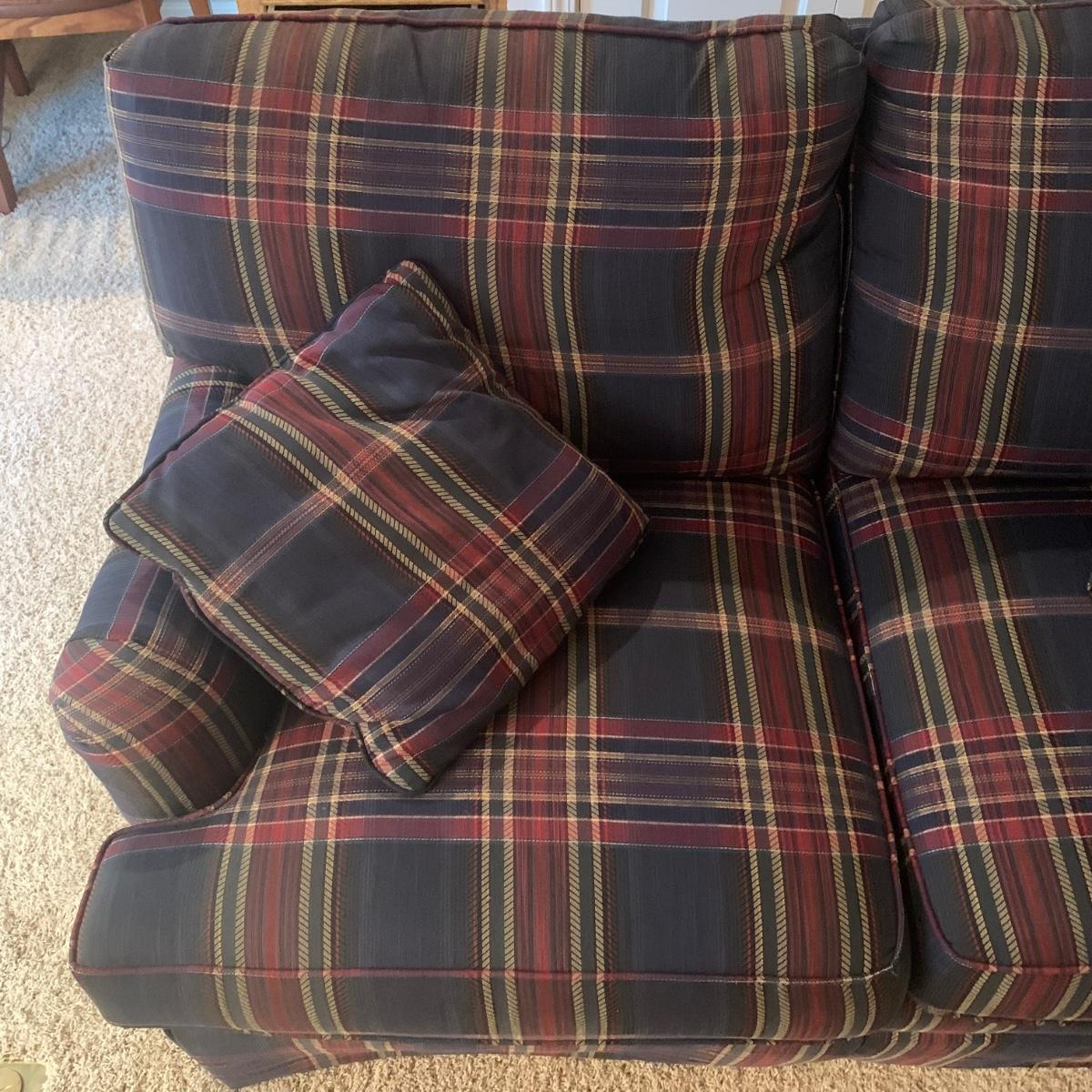 Plaid cloth loveseat by Temple. Loveseat has two cushions and two matching throw pillows. Loveseat measures approximately, 58” x 34” x 35”H with a seat height of 19”H.