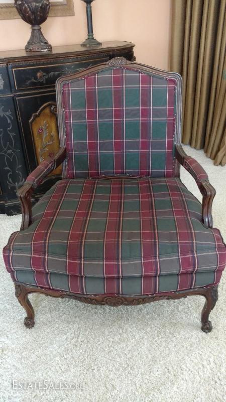 Red and muted green plaid upholstered arm chair. Cabriole legs, ornamental woodwork.