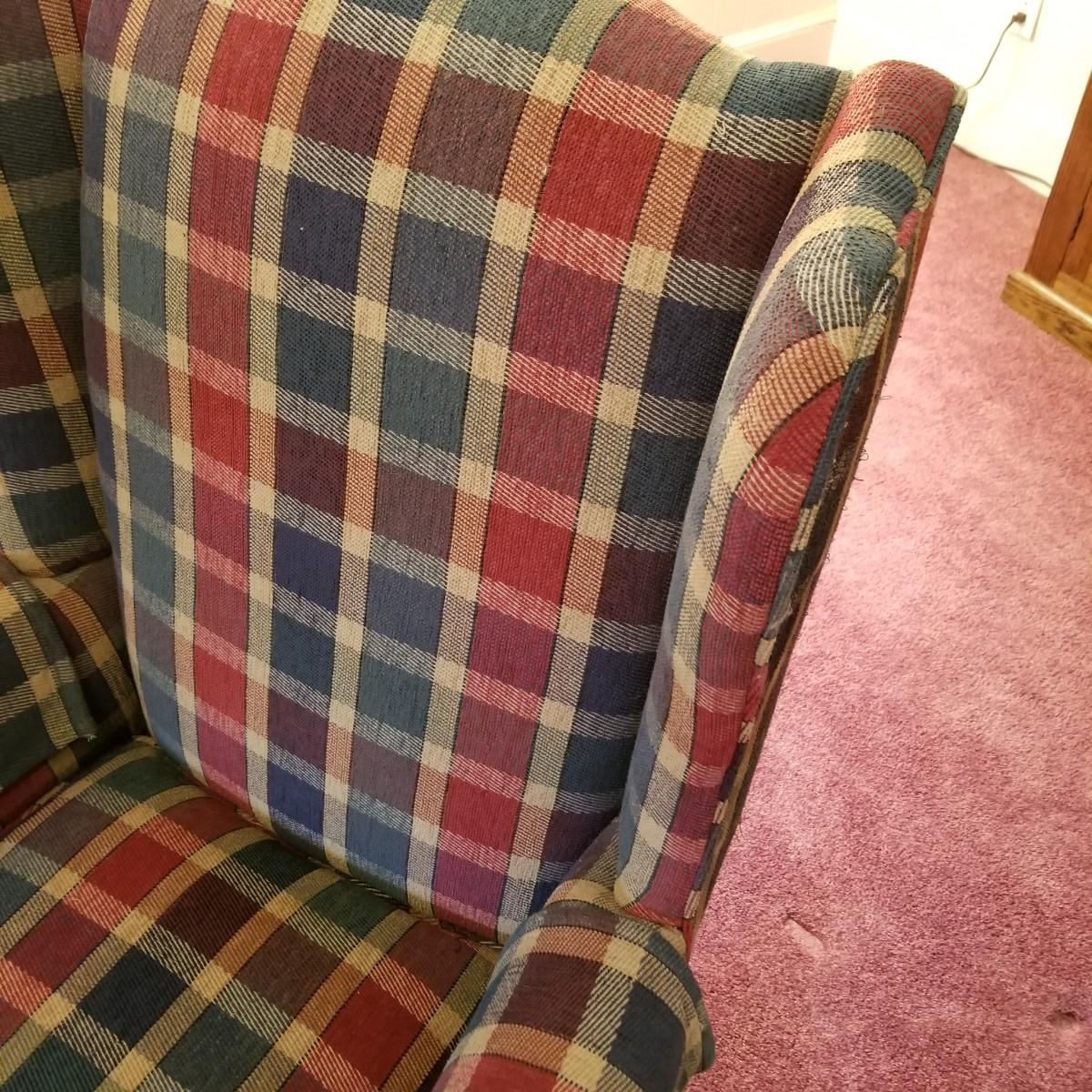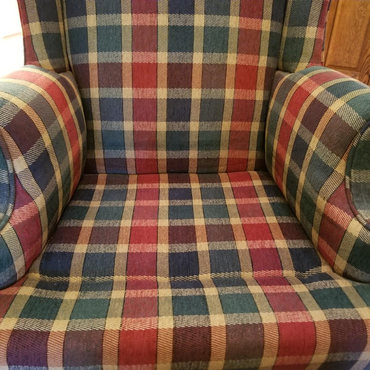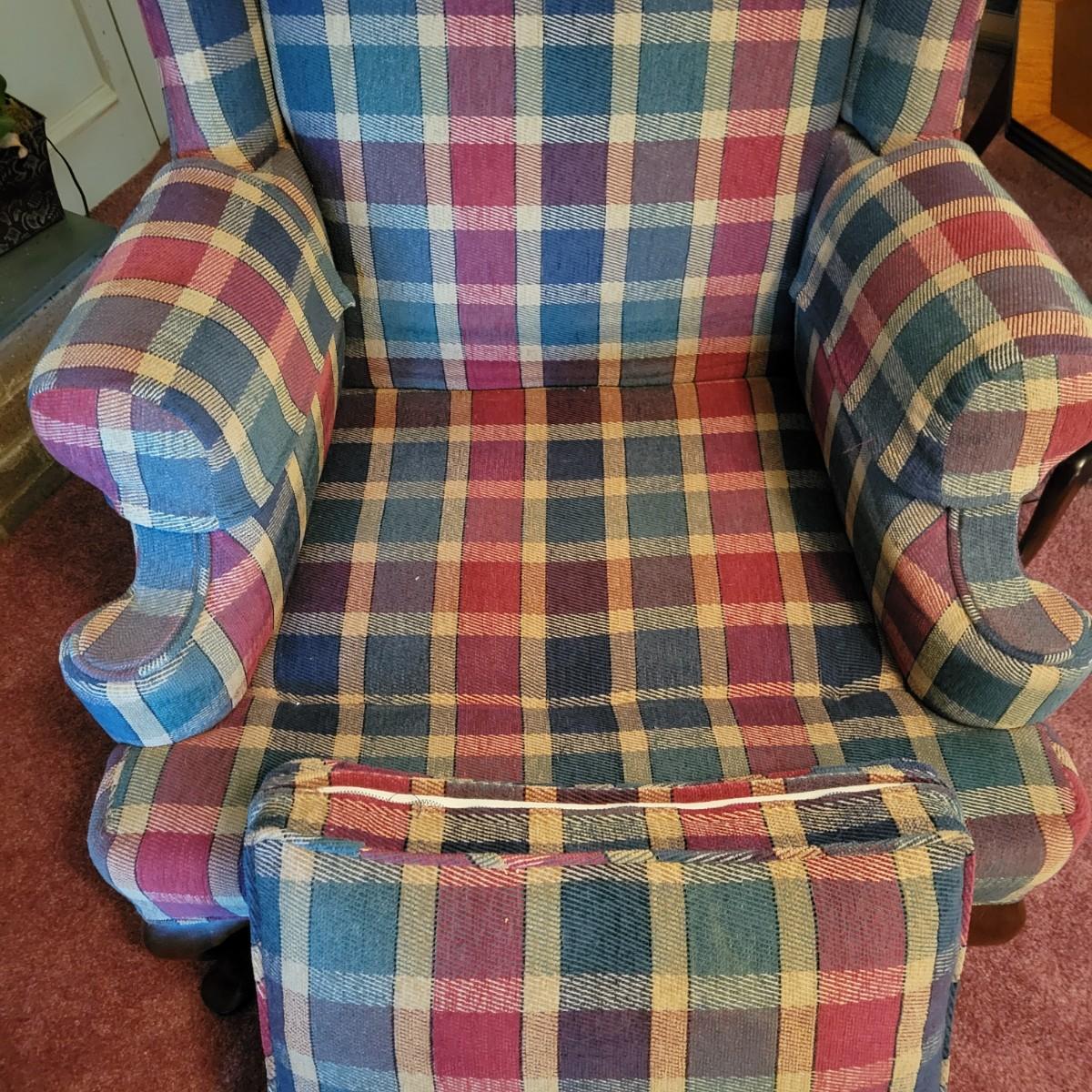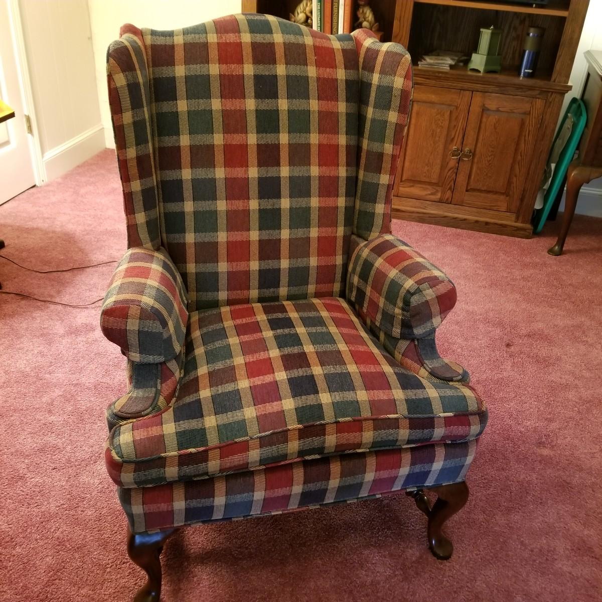 Red and green plaid high wingback armchair with matching arm covers. Wooden legs and under support. This piece measures 31" x 33" x 43" with seat height of 18". Some minor fraying on back edges but shows overall normal wear, in good condition. See photos for details. Local pickup only. The winning bidder should bring help to move as chair is in lower level of home.