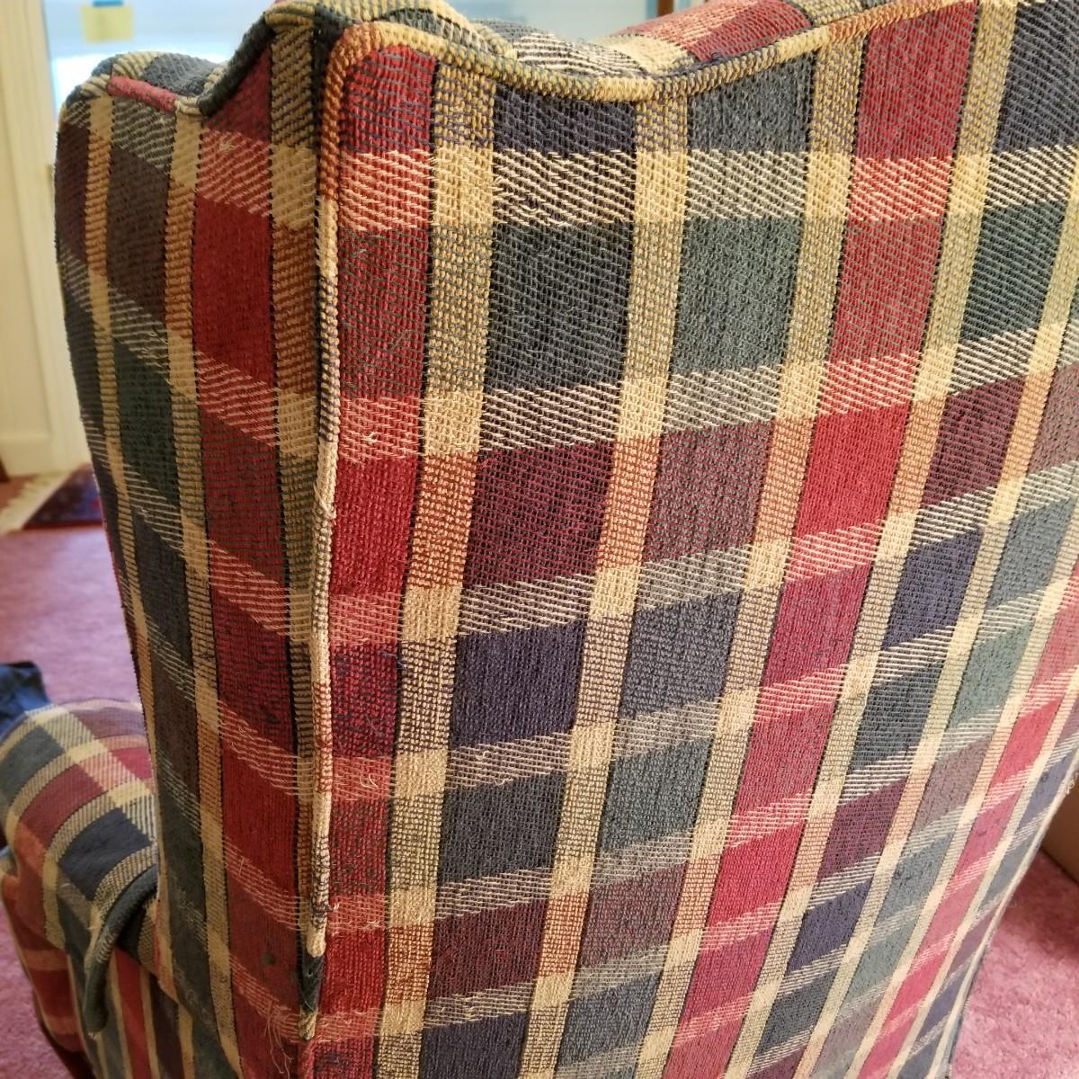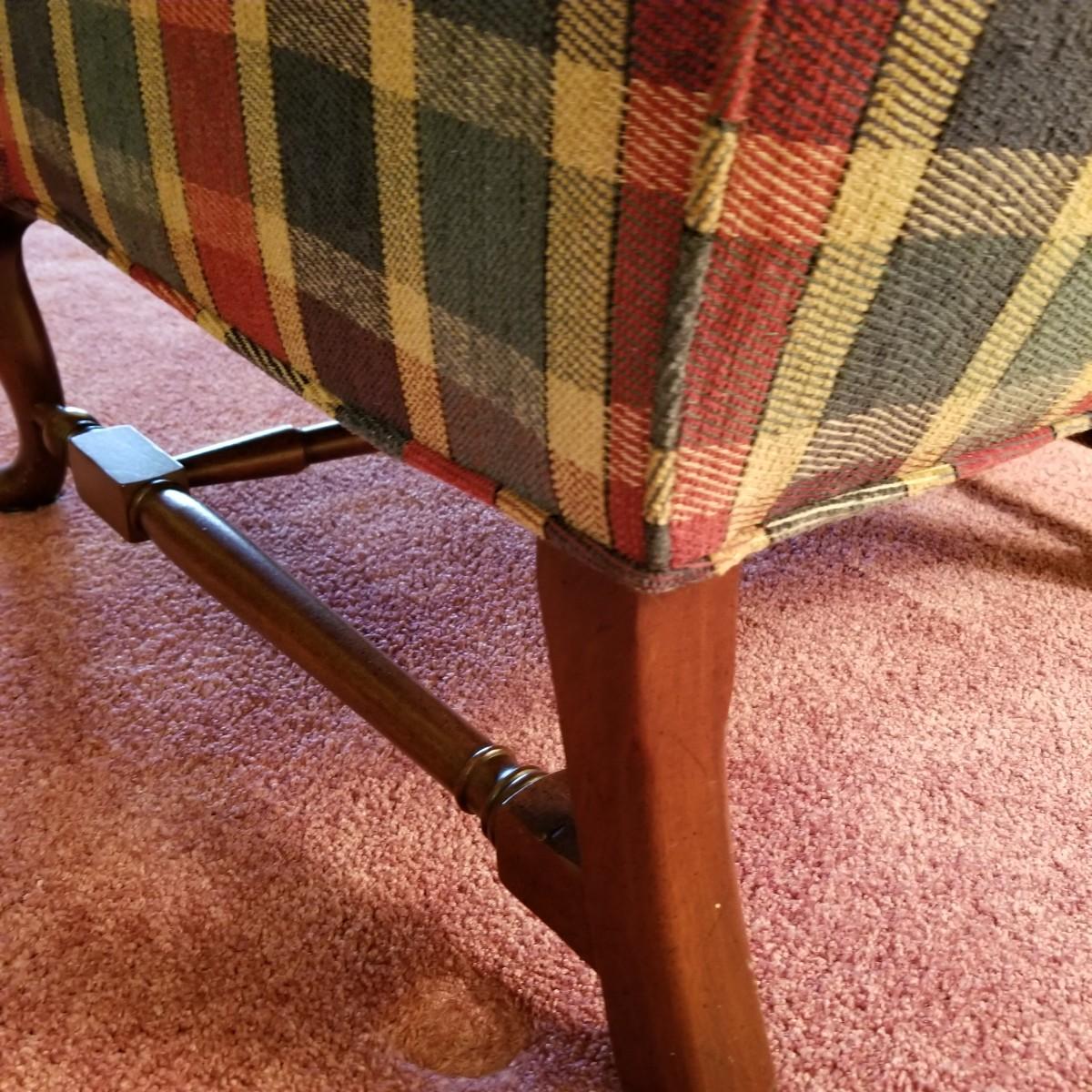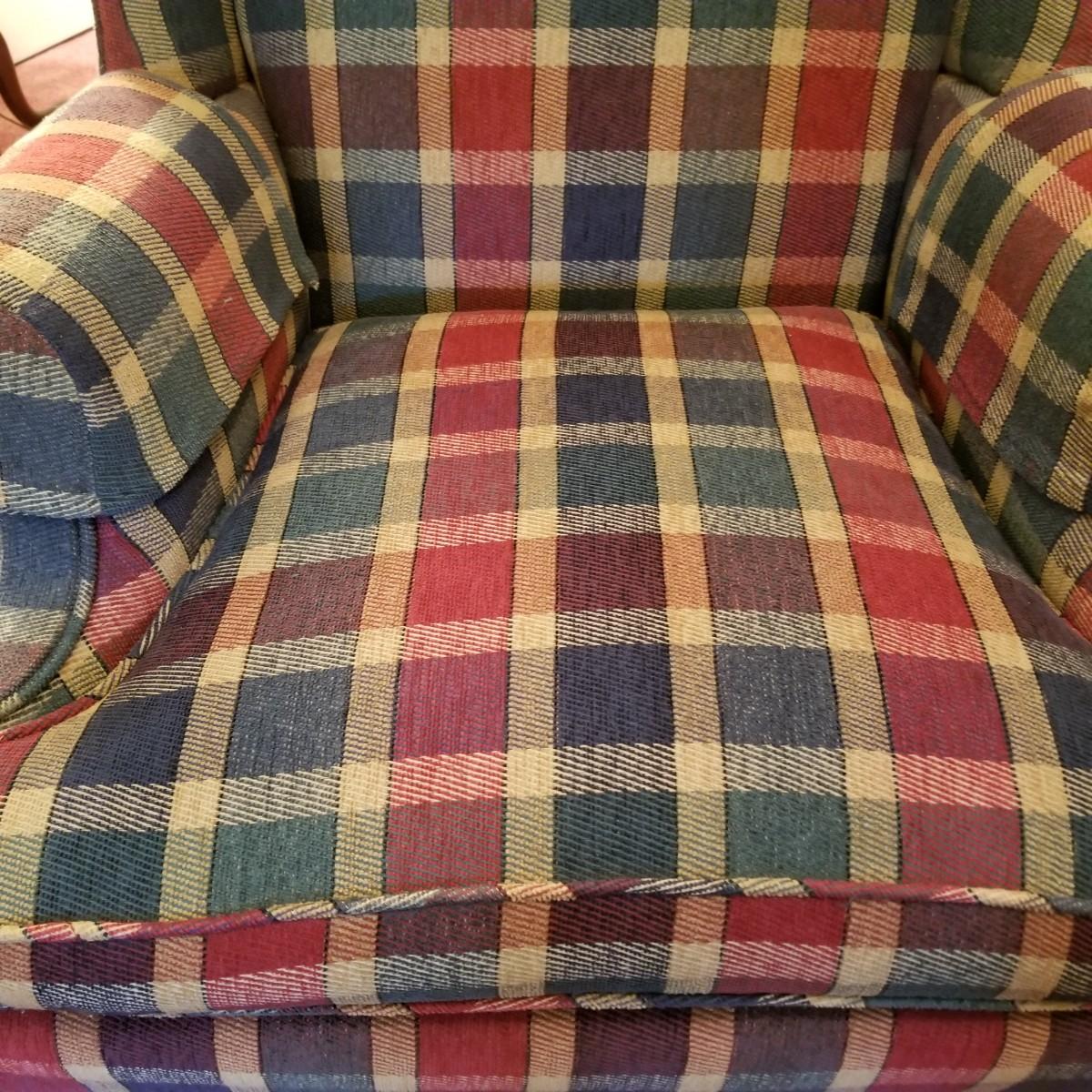 Red and green plaid high wingback armchair with matching arm covers. Wooden legs and under support. This piece measures 31" x 33" x 43" with seat height of 18". Some minor fraying on back edges but shows overall normal wear, in good condition. See photos for details. Local pickup only. The winning bidder should bring help to move as chair is in lower level of home.