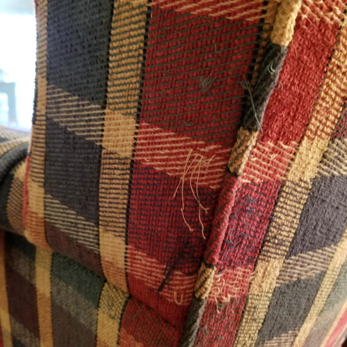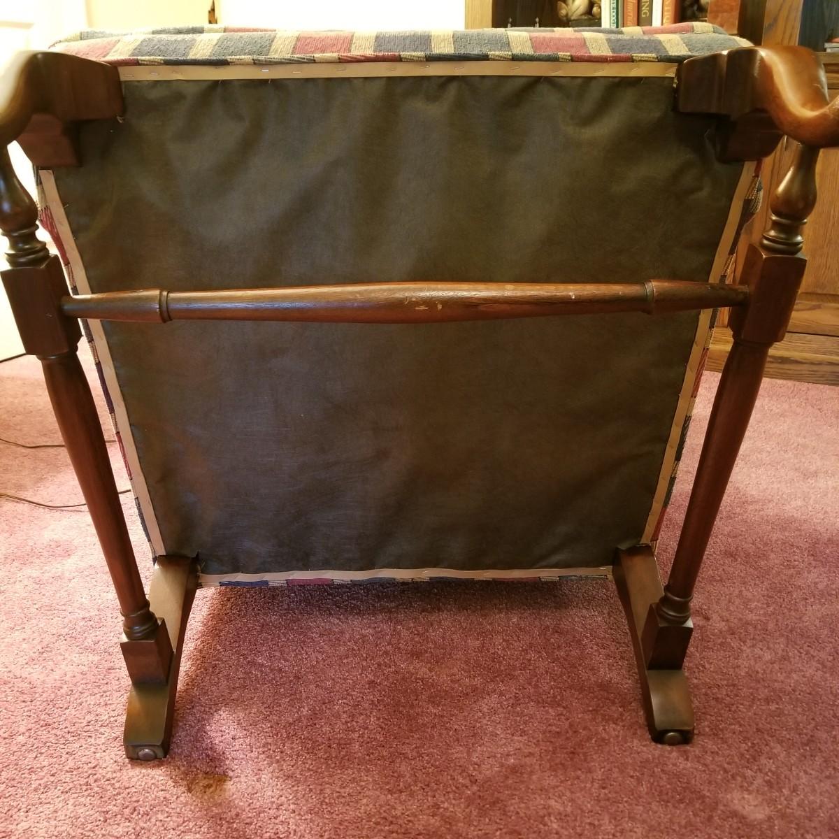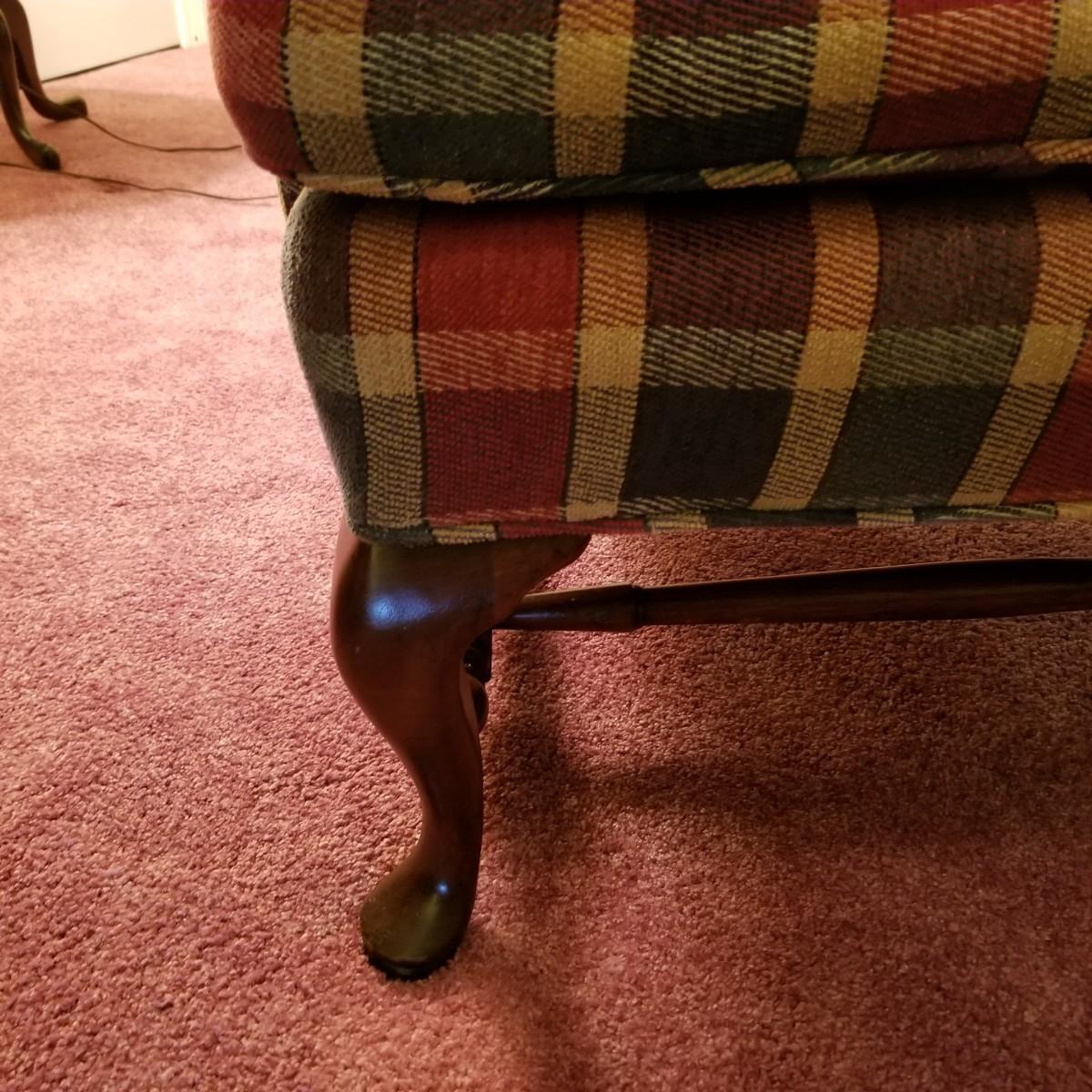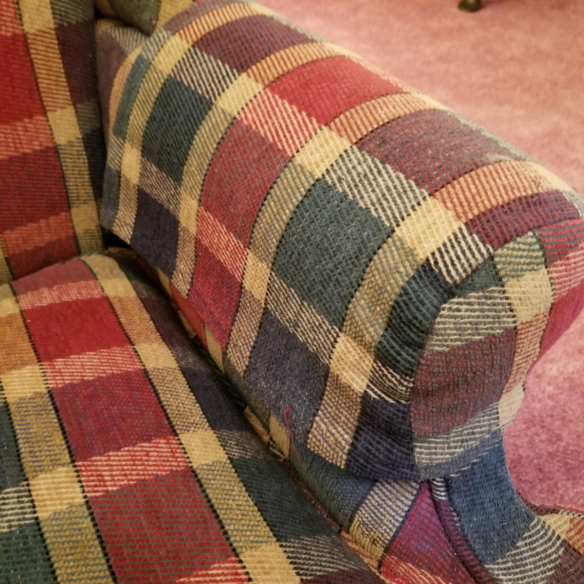 Red and green plaid high wingback armchair with matching arm covers. Wooden legs and under support. This piece measures 31" x 33" x 43" with seat height of 18". Some minor fraying on back edges but shows overall normal wear, in good condition. See photos for details. Local pickup only. The winning bidder should bring help to move as chair is in lower level of home.