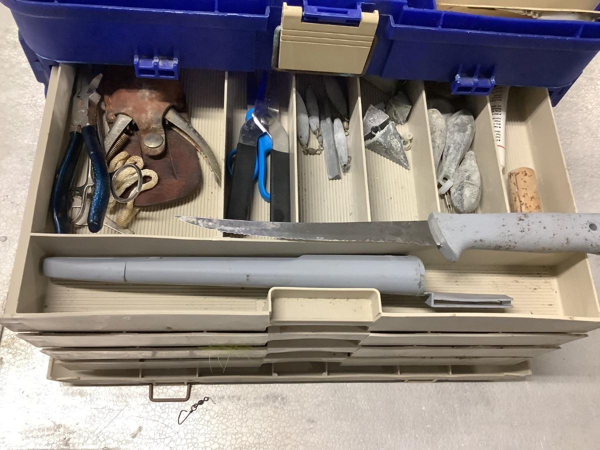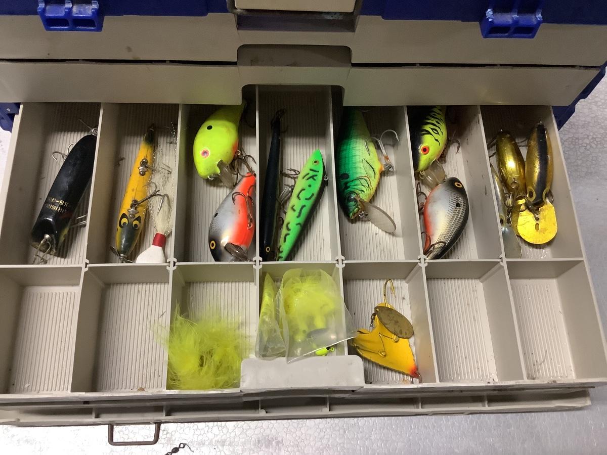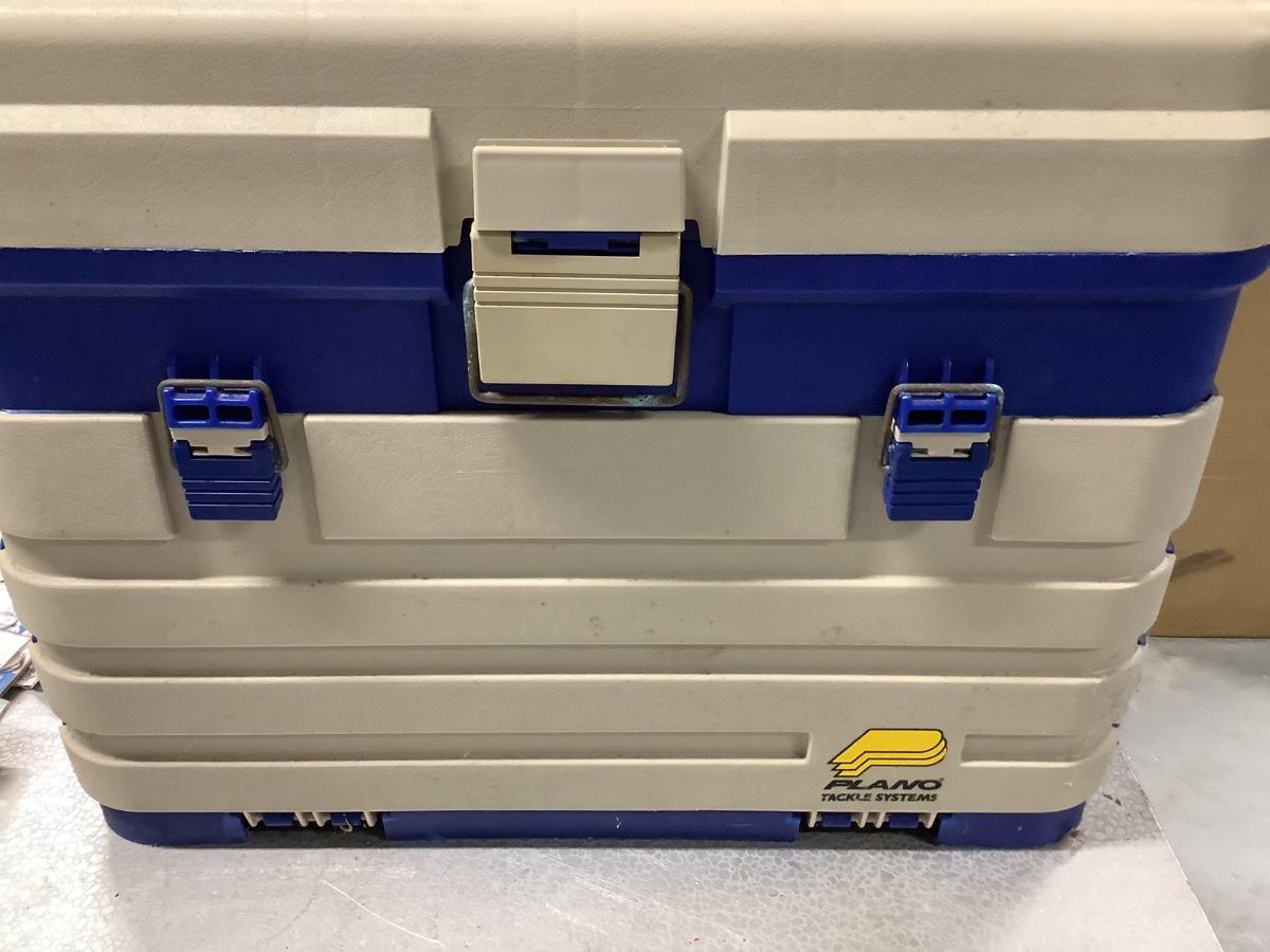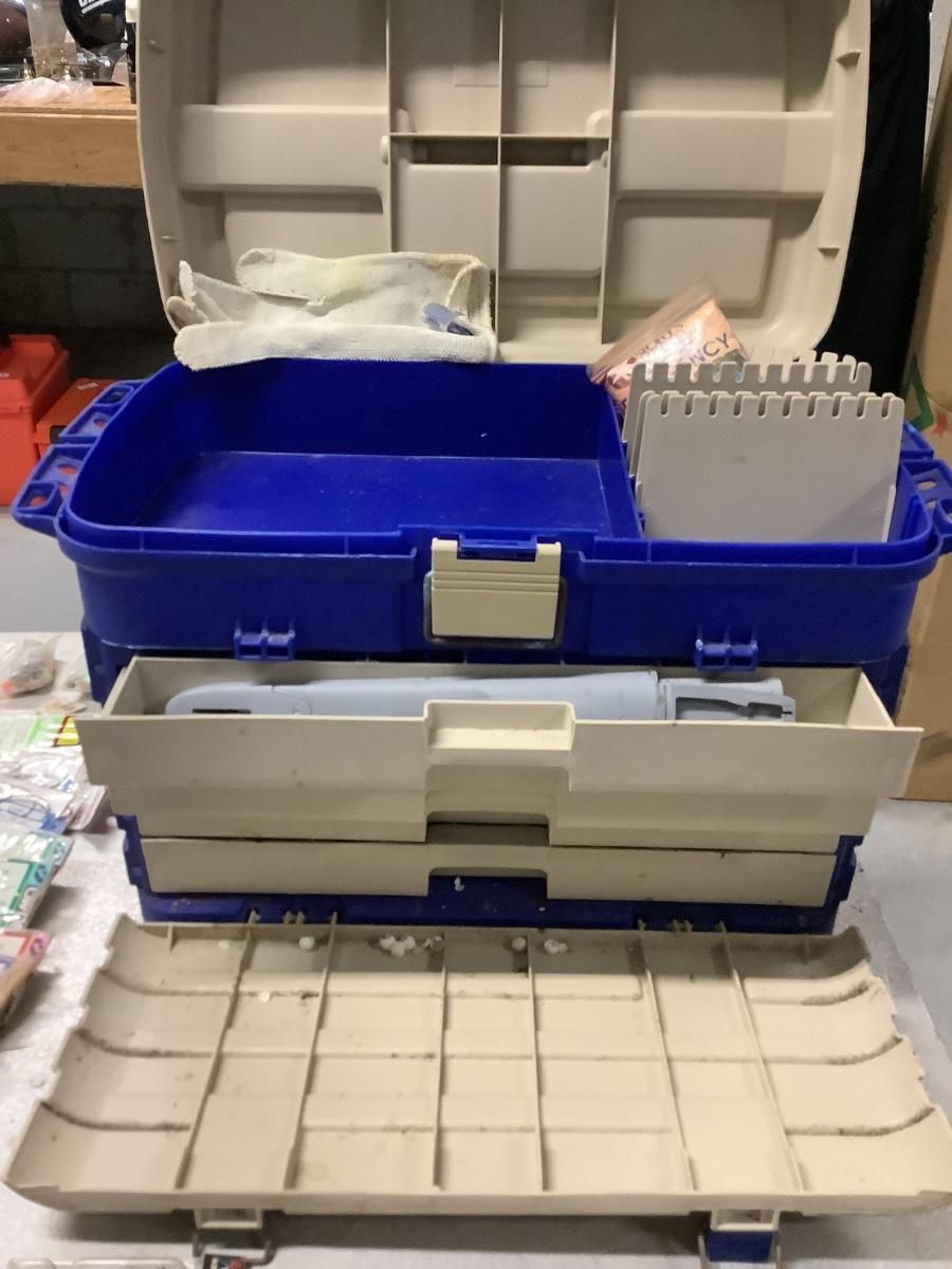 Plano beige/blue tackle box, 4 drawers, extensive lure collection