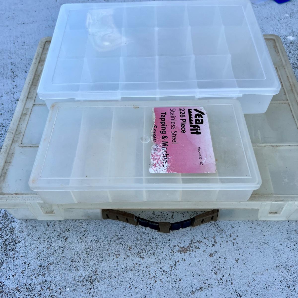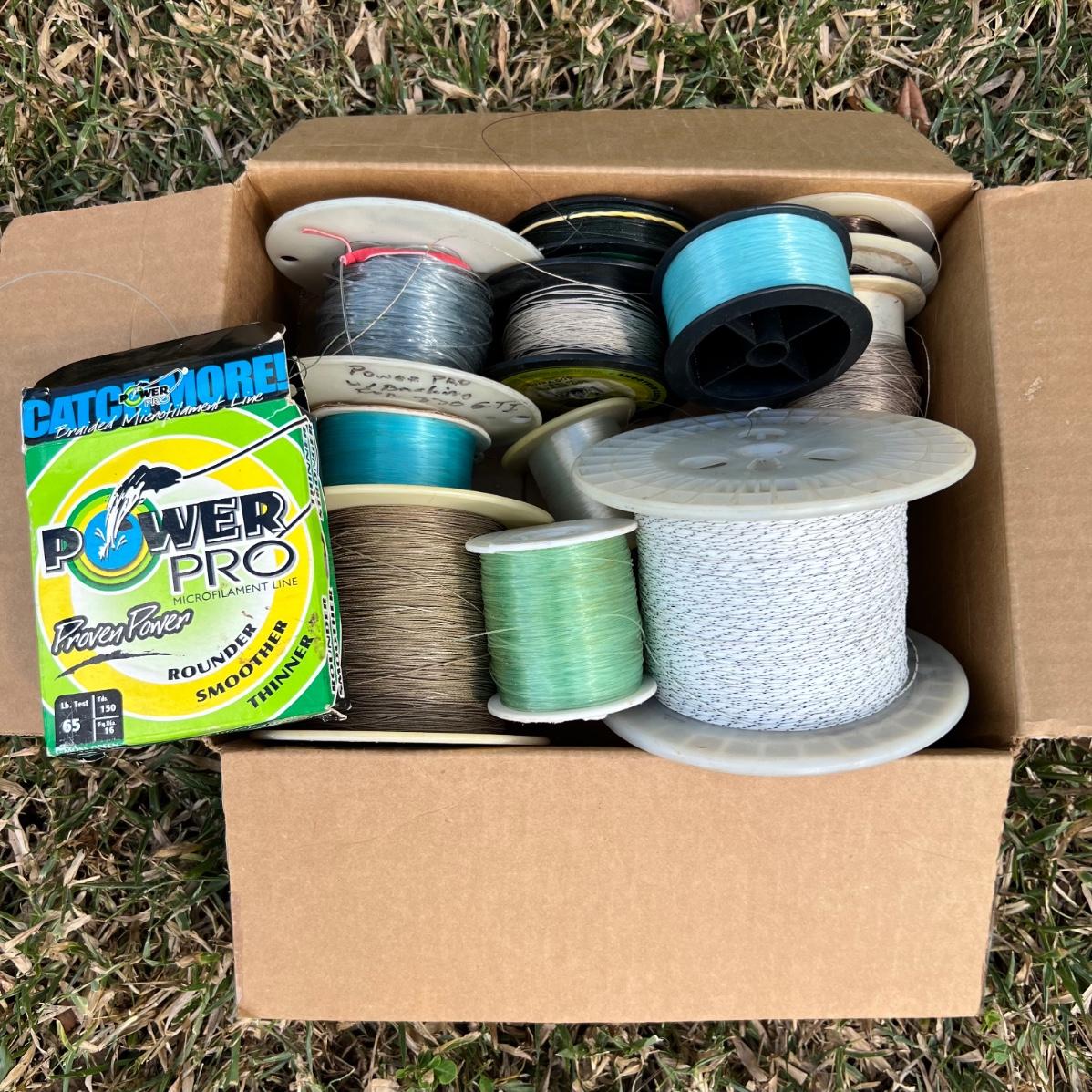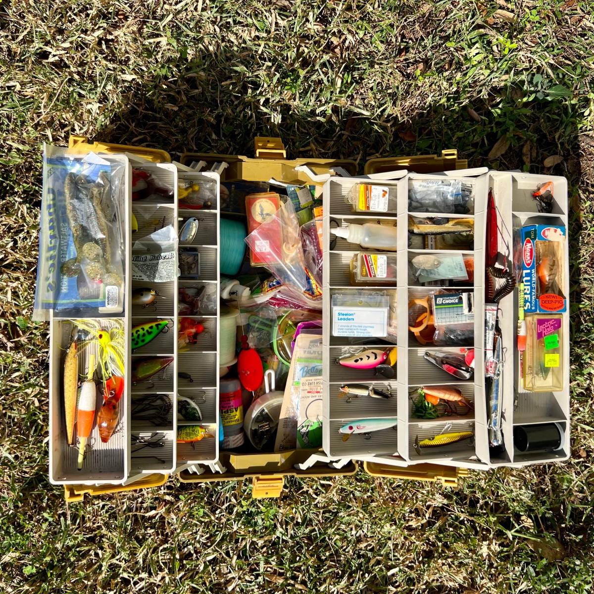 Lot includes a Plano 36 compartment tackle box filled with an assortment of lures, three tackle organizers, a line organizer, and a box filled with a variety of line.