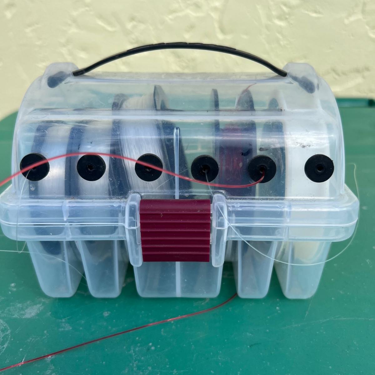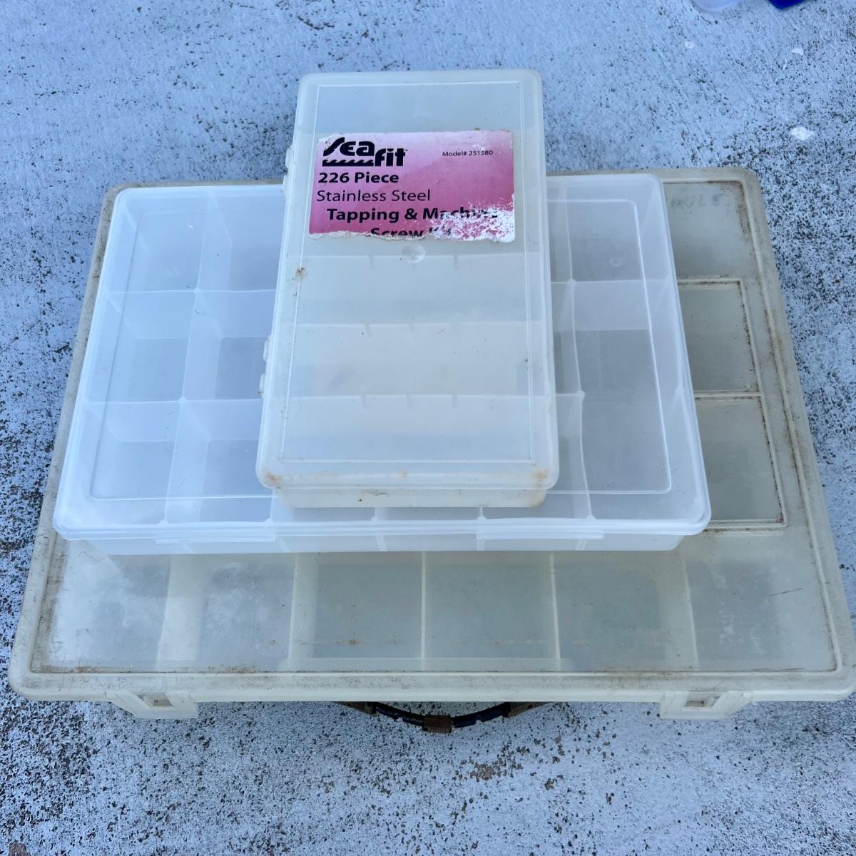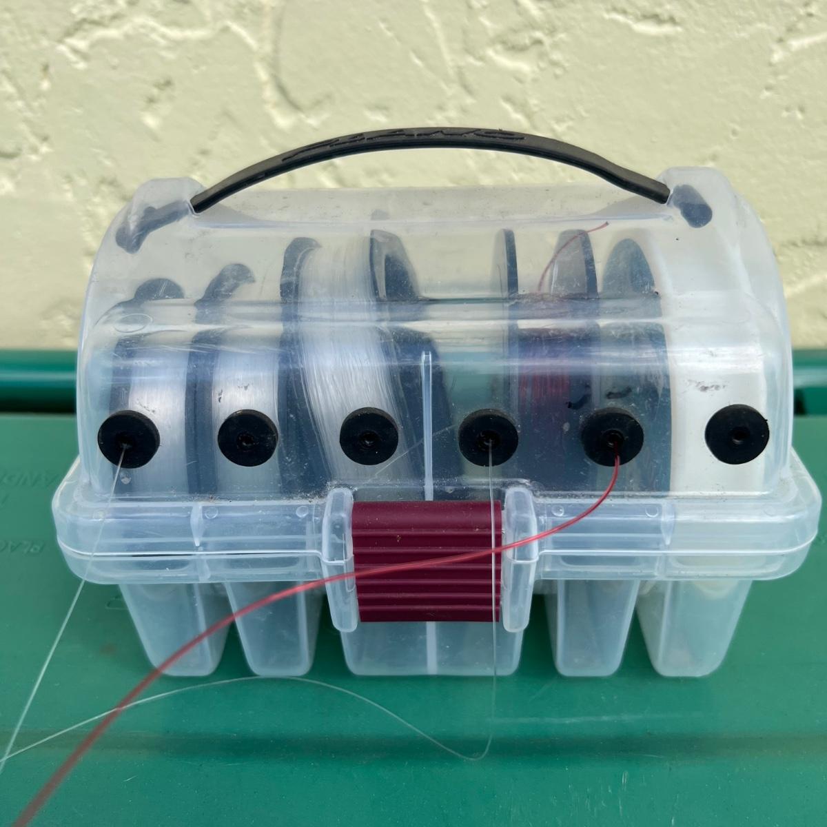 Lot includes a Plano 36 compartment tackle box filled with an assortment of lures, three tackle organizers, a line organizer, and a box filled with a variety of line.