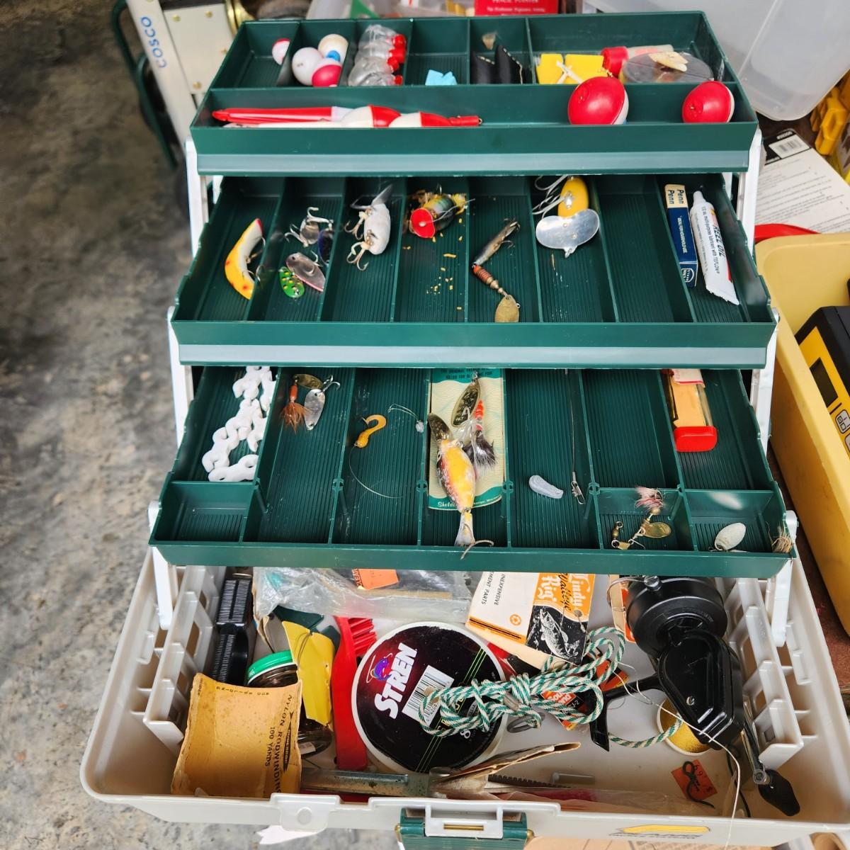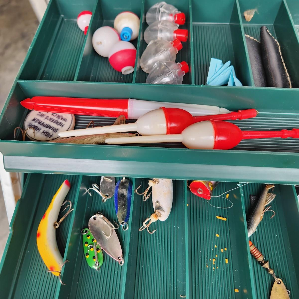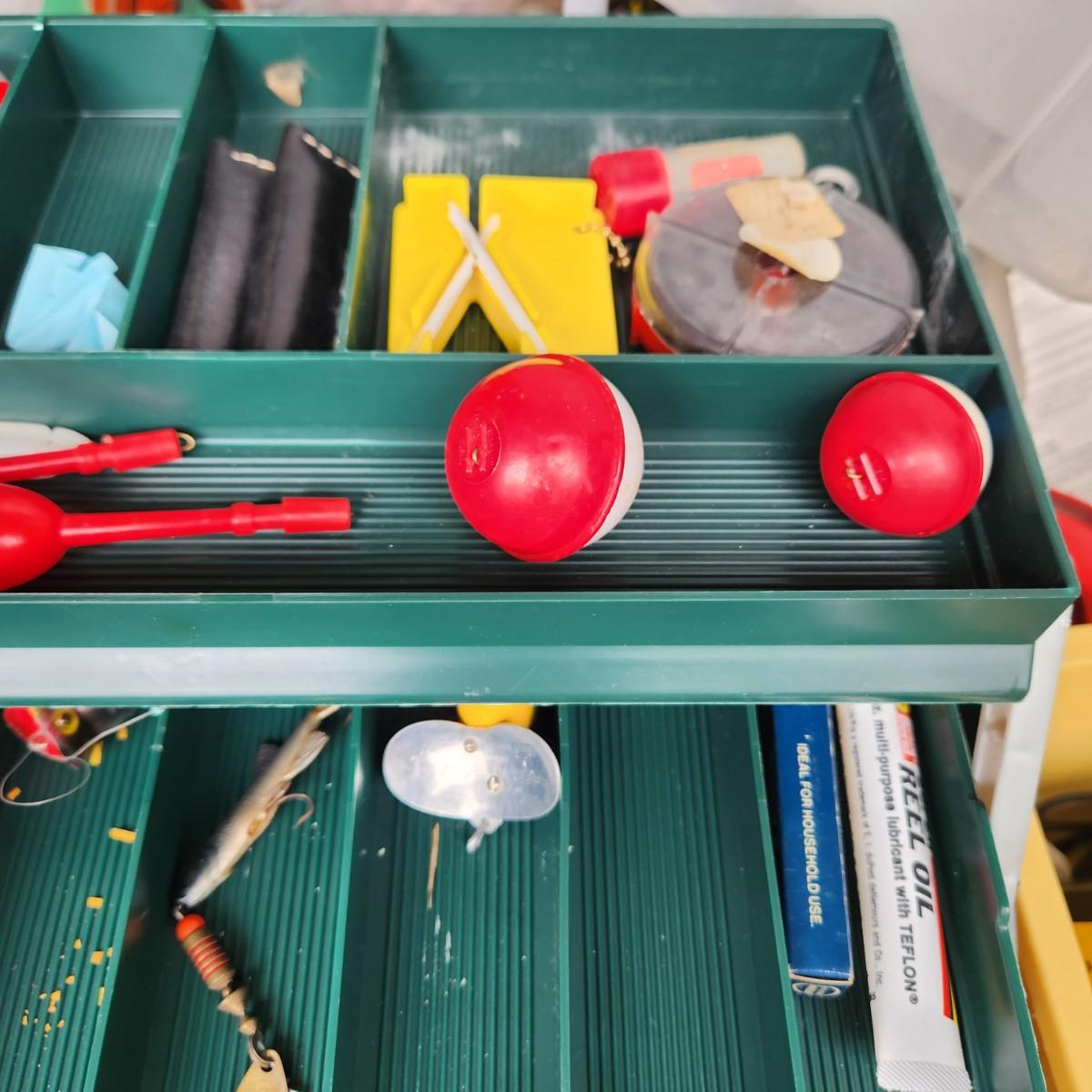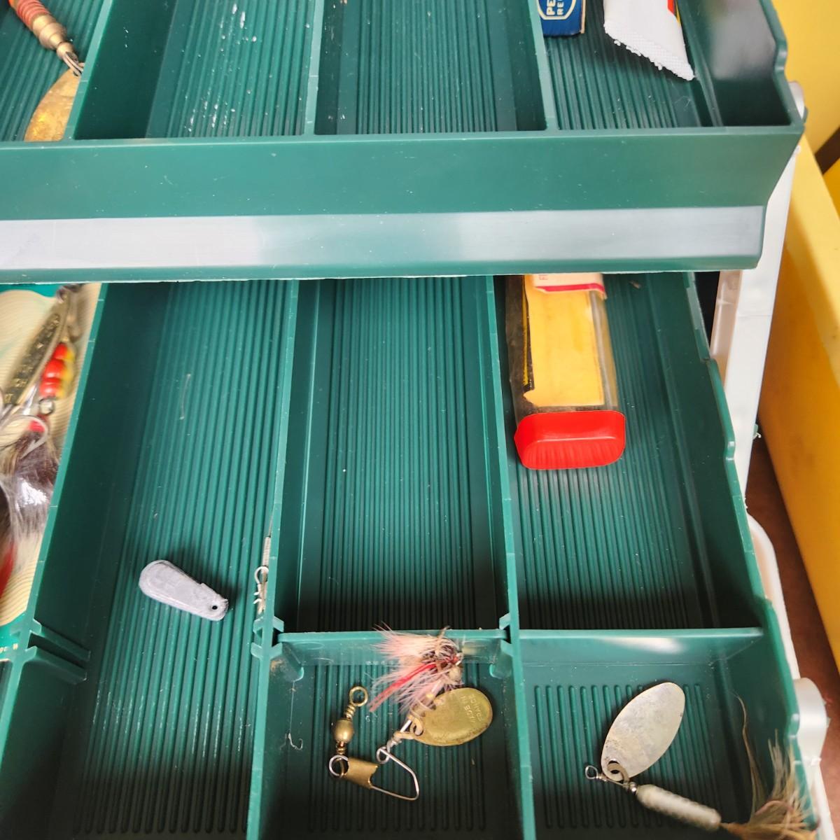 Plano Fishing Tackle Box with Contents Lures, Spinners, Bobbers