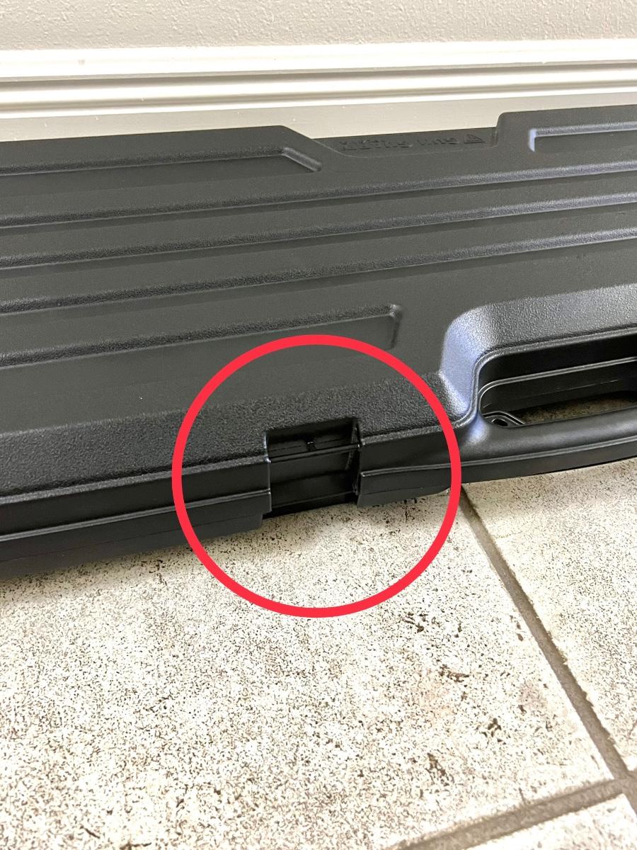 There are 4 clips that lock the case, however, 1 clip missing/broken, see photos ~ 4” H x 16” W x 51.5” L