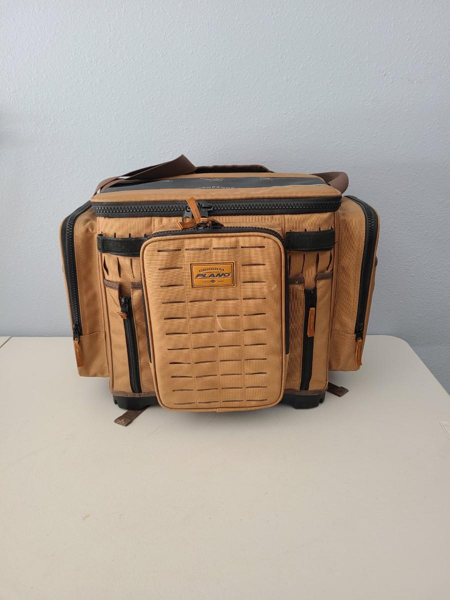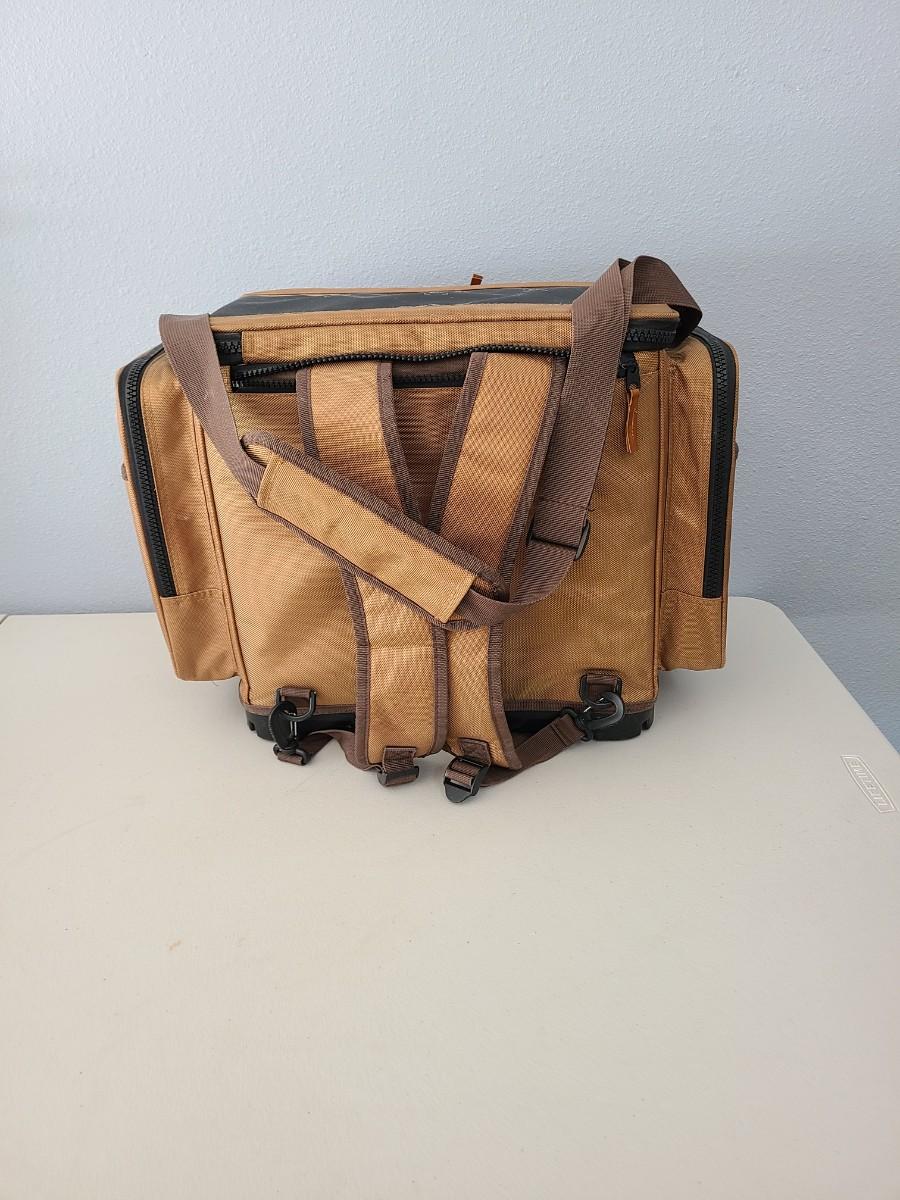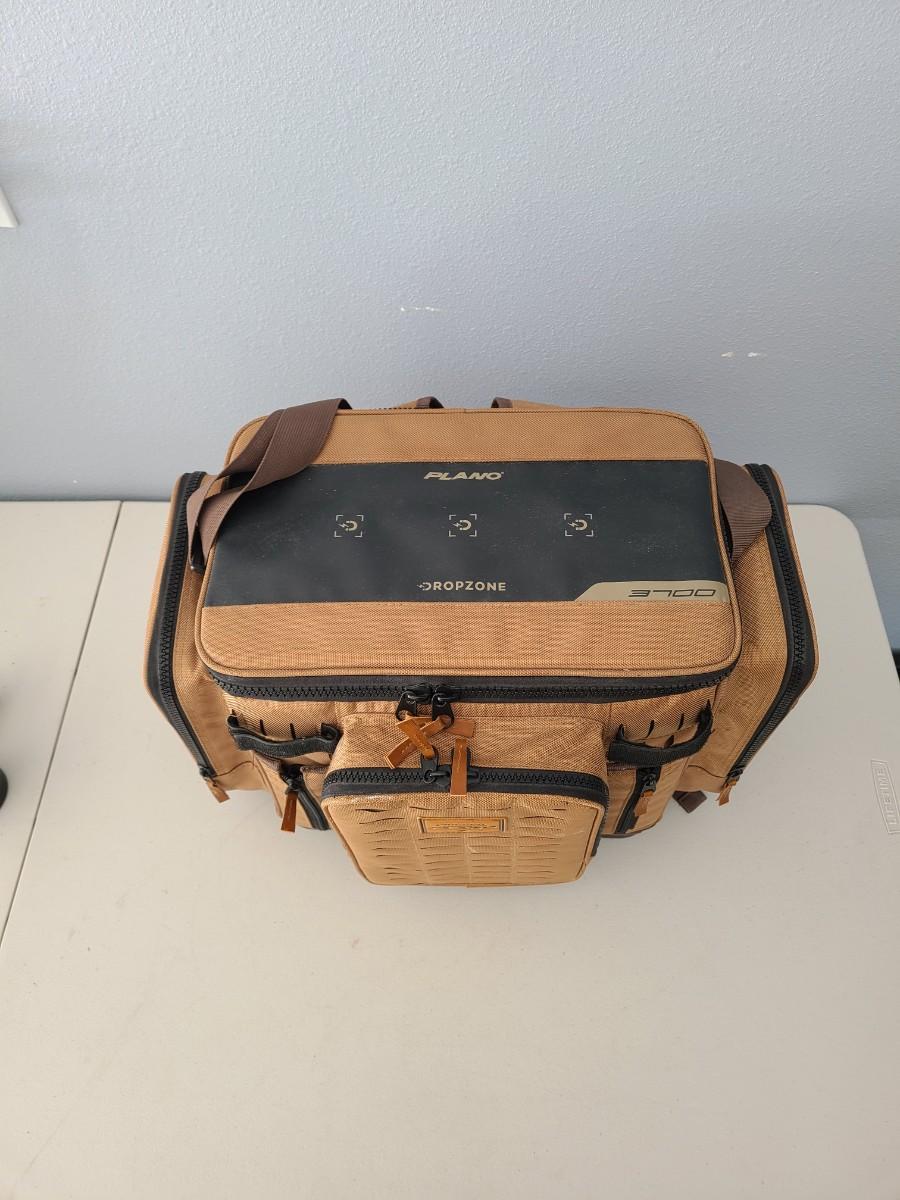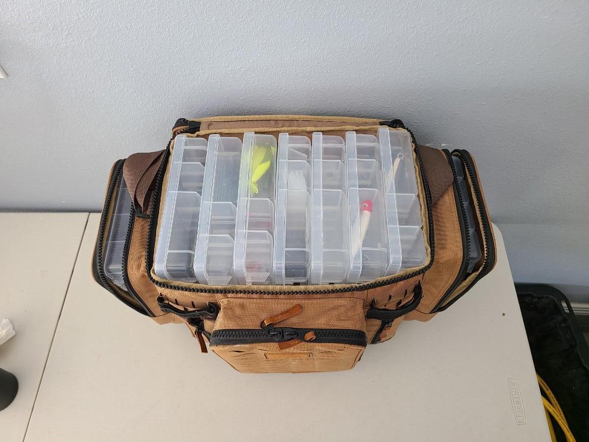 Bag is 20" in Length, 14 1/2" Height and 14" in Depth. Very Nice lightly used bag. Comes with a little bit of hooks and lures.