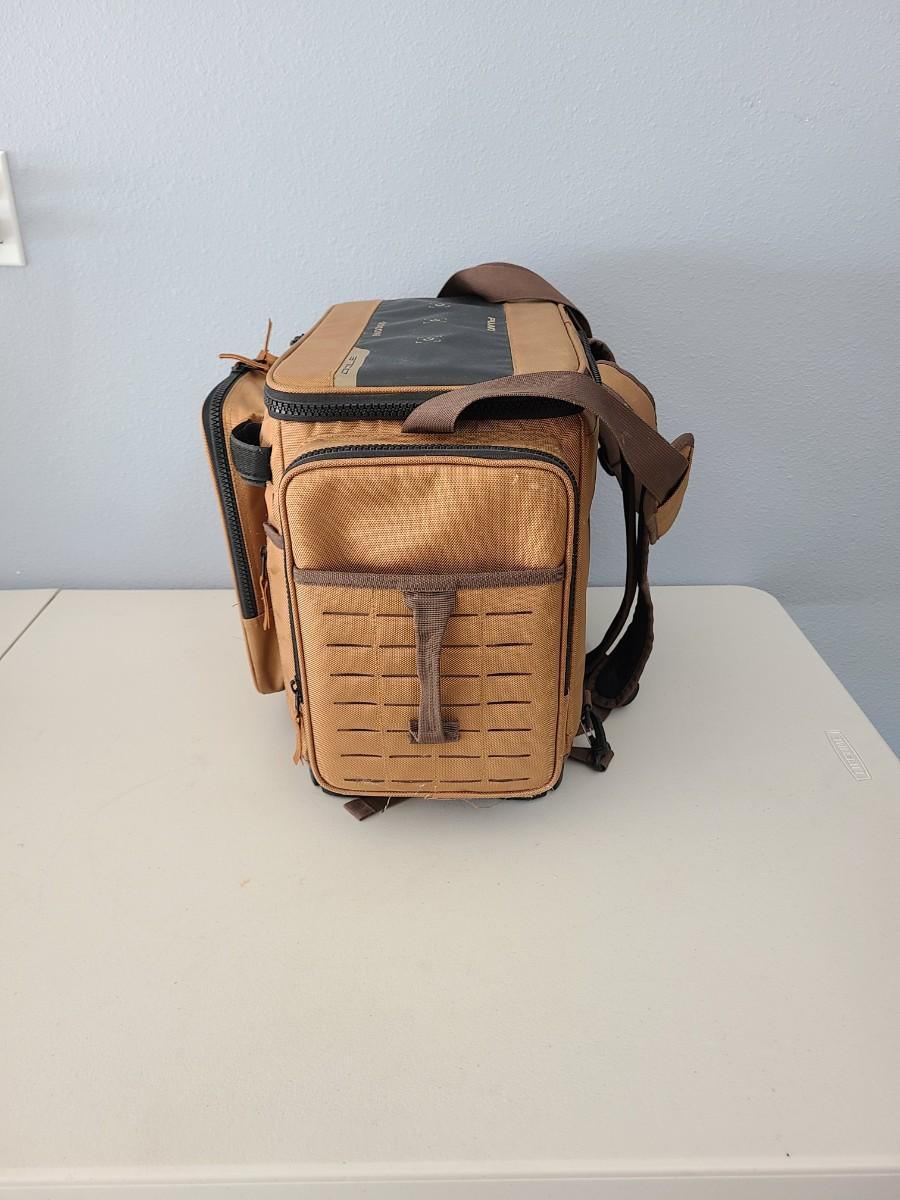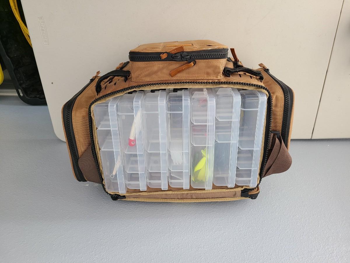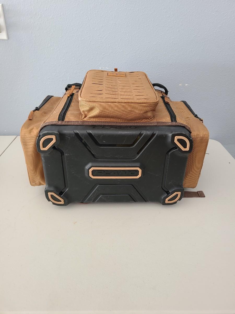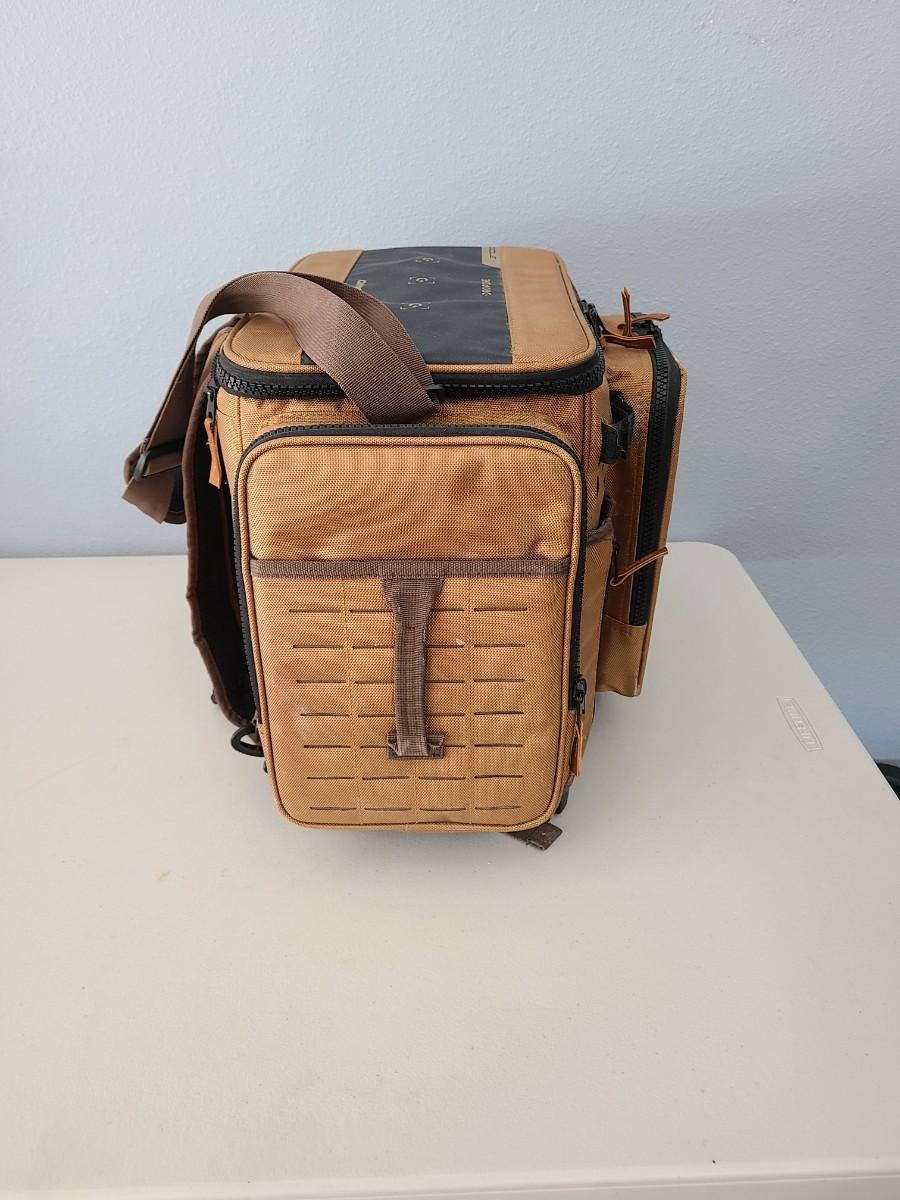 Bag is 20" in Length, 14 1/2" Height and 14" in Depth. Very Nice lightly used bag. Comes with a little bit of hooks and lures.