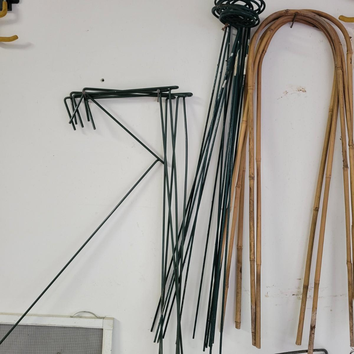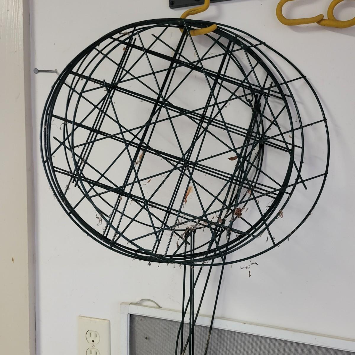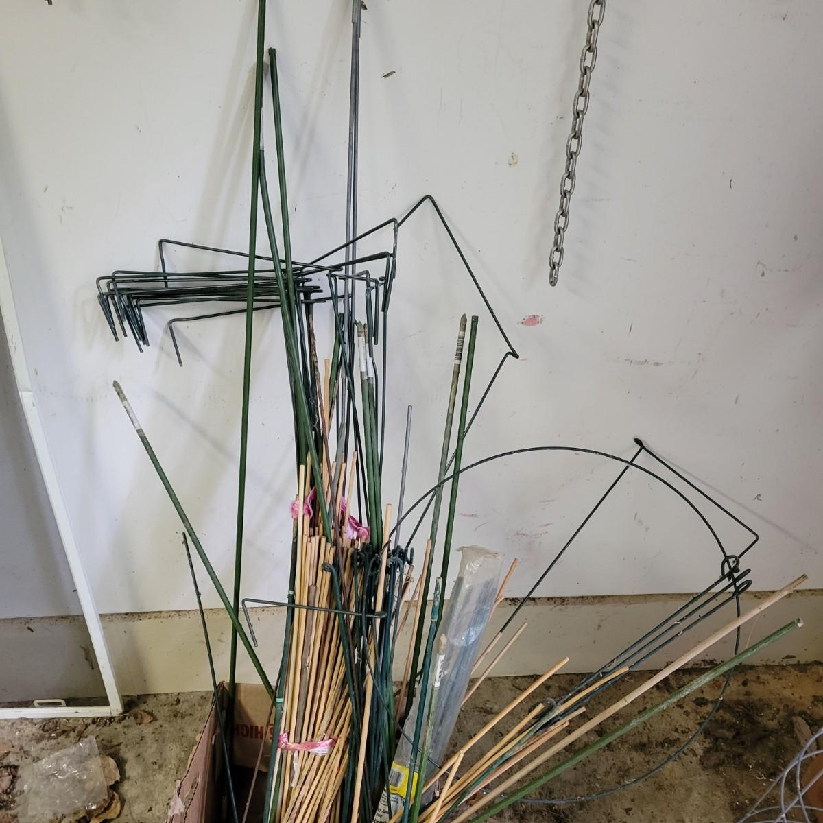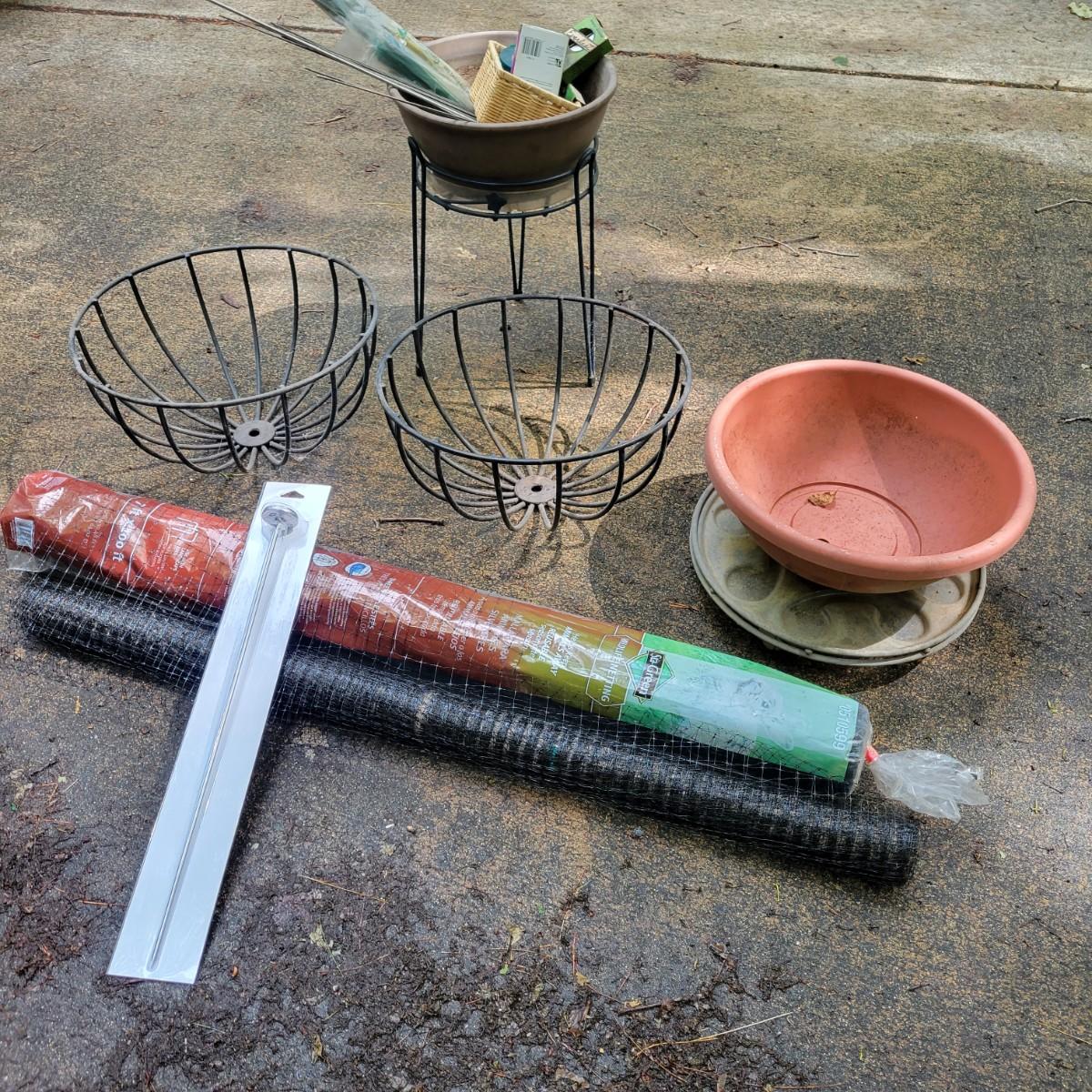 A large assortment of gardening and plant accessories. Included are multiple rolling plant bases, plastic and metal wire pots. Wildlife netting, hanging chains and many plant stakes, supports, hangers and more. See pictures for full inventory. The rolling plant bases measure approximately 14.5"D x 3"H. Local pickup only