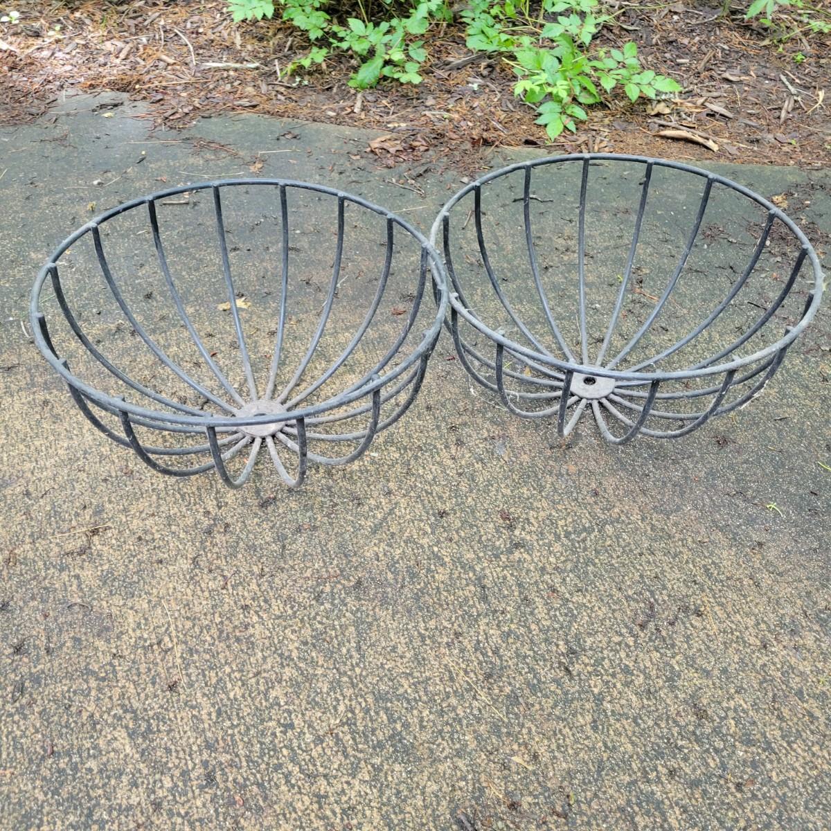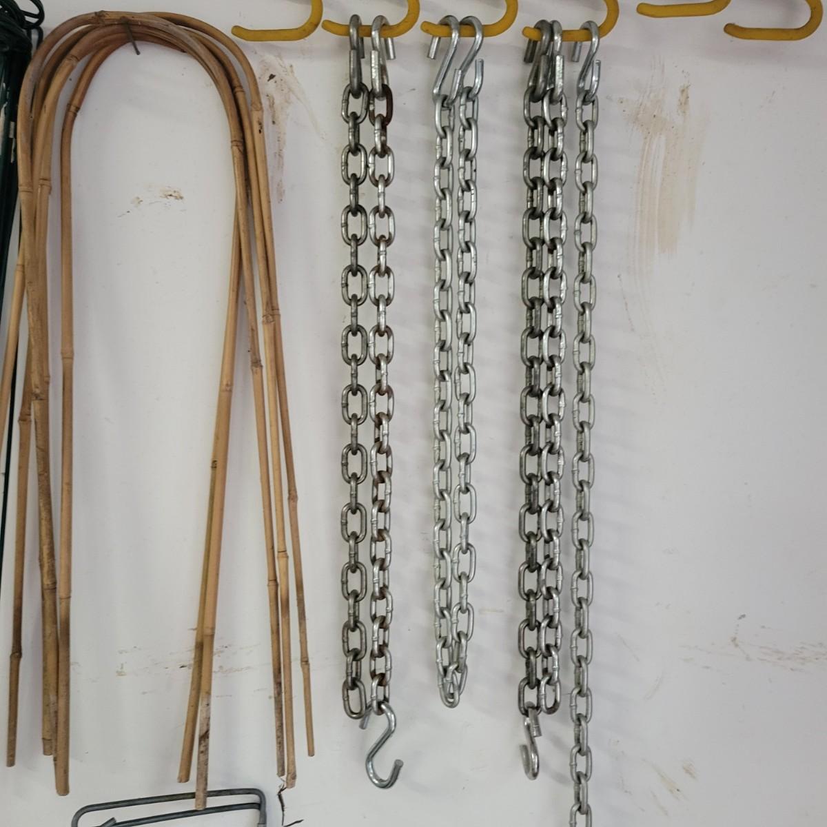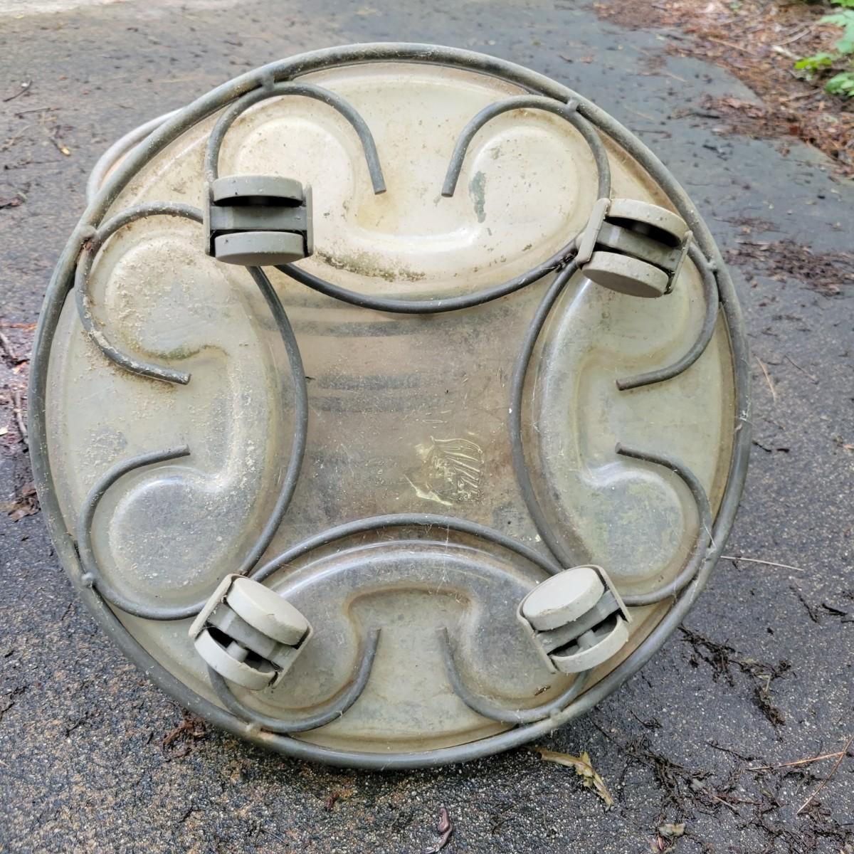 A large assortment of gardening and plant accessories. Included are multiple rolling plant bases, plastic and metal wire pots. Wildlife netting, hanging chains and many plant stakes, supports, hangers and more. See pictures for full inventory. The rolling plant bases measure approximately 14.5"D x 3"H. Local pickup only