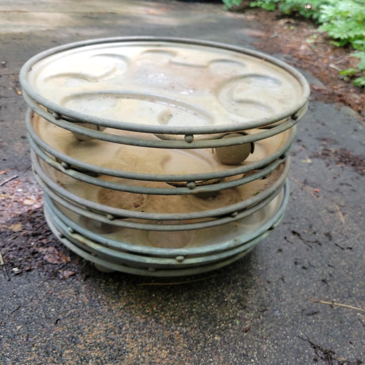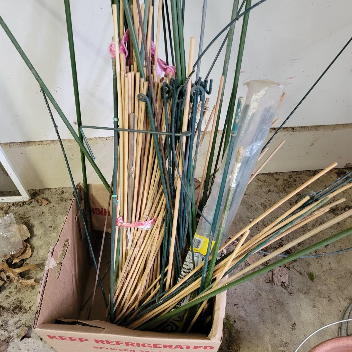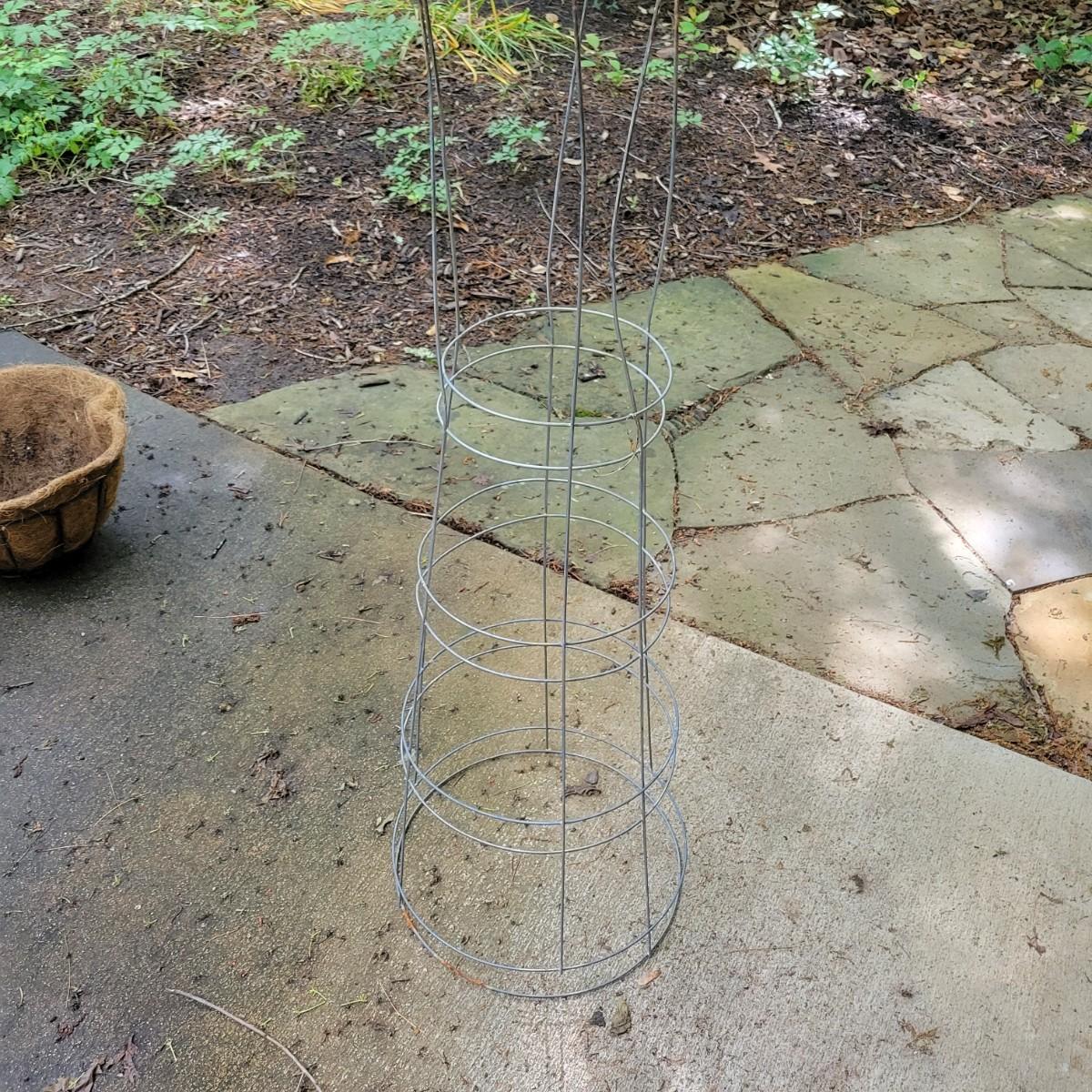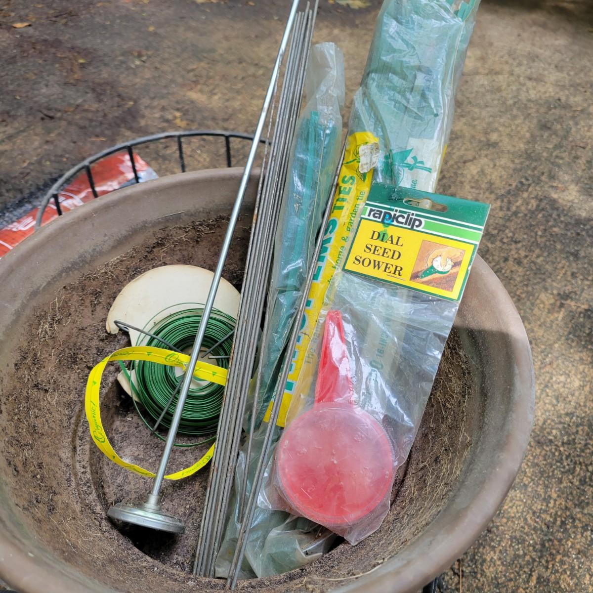 A large assortment of gardening and plant accessories. Included are multiple rolling plant bases, plastic and metal wire pots. Wildlife netting, hanging chains and many plant stakes, supports, hangers and more. See pictures for full inventory. The rolling plant bases measure approximately 14.5"D x 3"H. Local pickup only