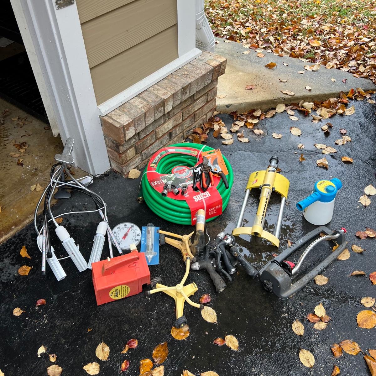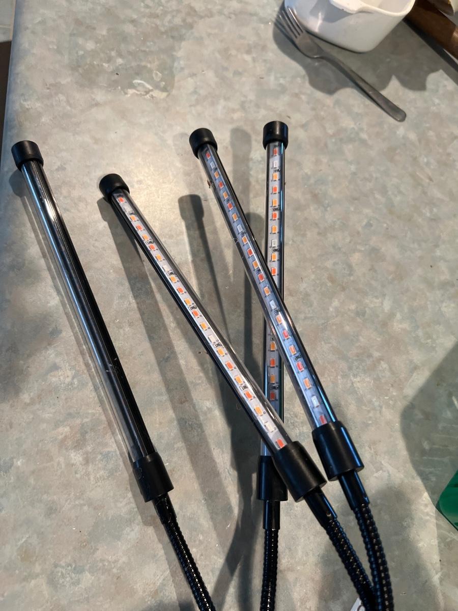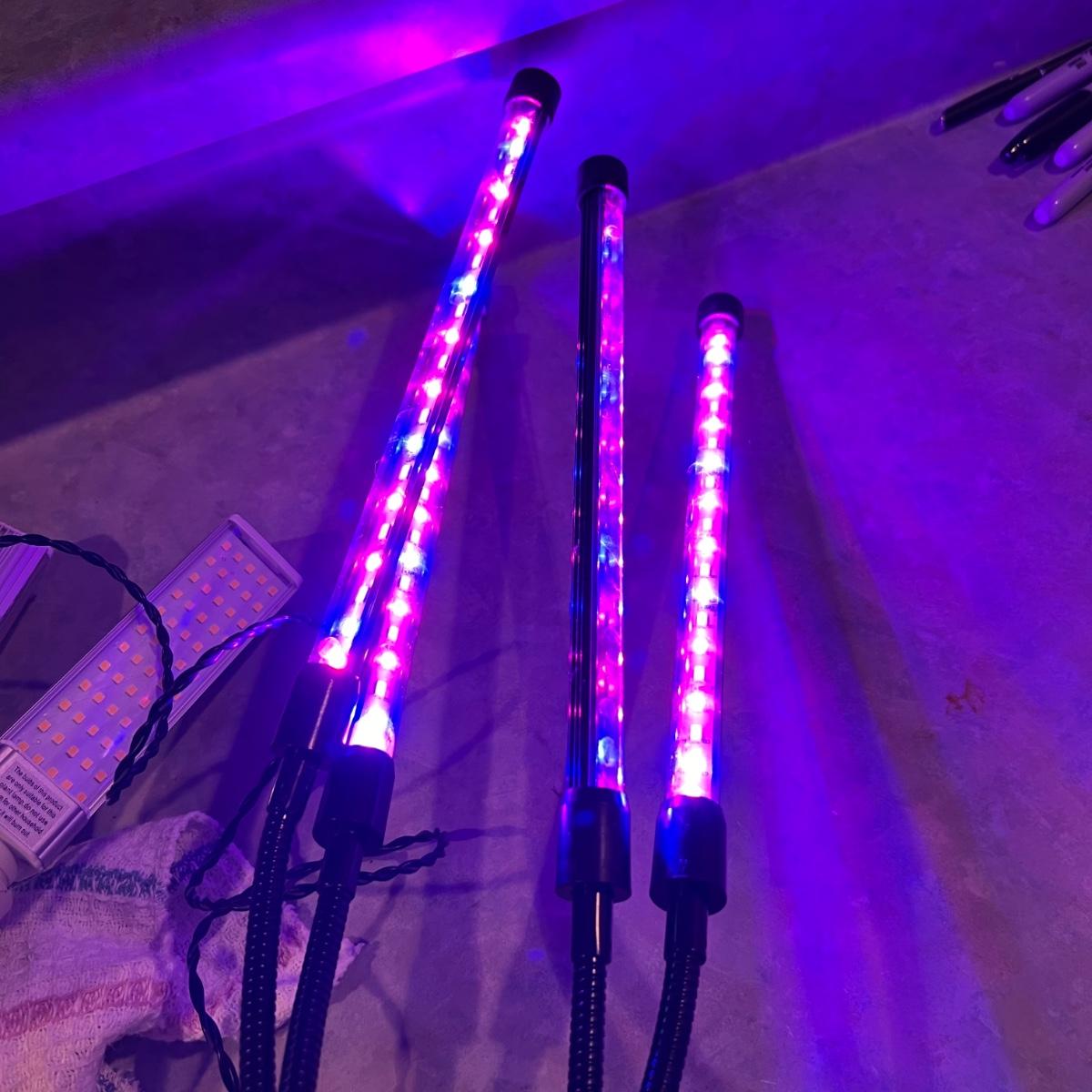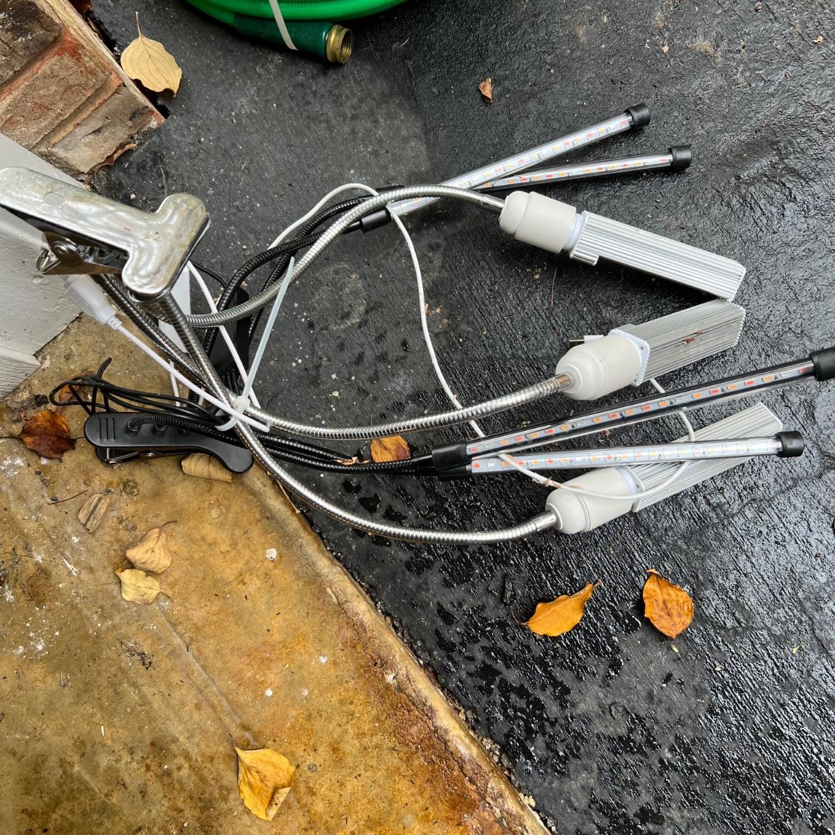An assortment of plant care tools includes a new hose, nozzles, pruners and more. Two sets of grow lights are also included; white set has three lights and a USB plug. The black set has four lights that appear to be blue/red grow lights. Both lights powered on when plugged in.