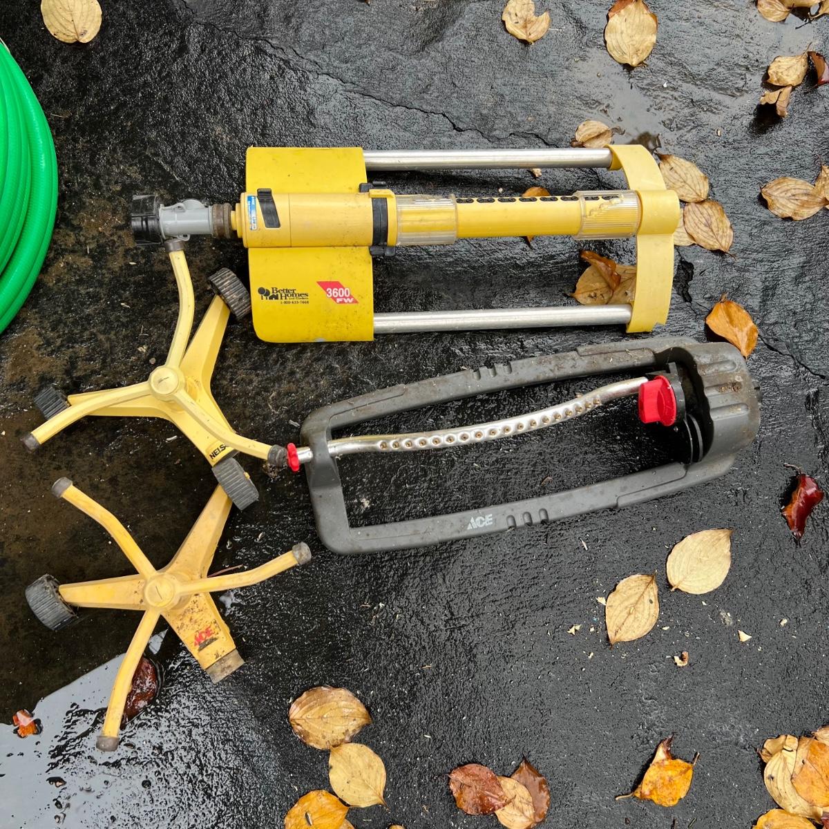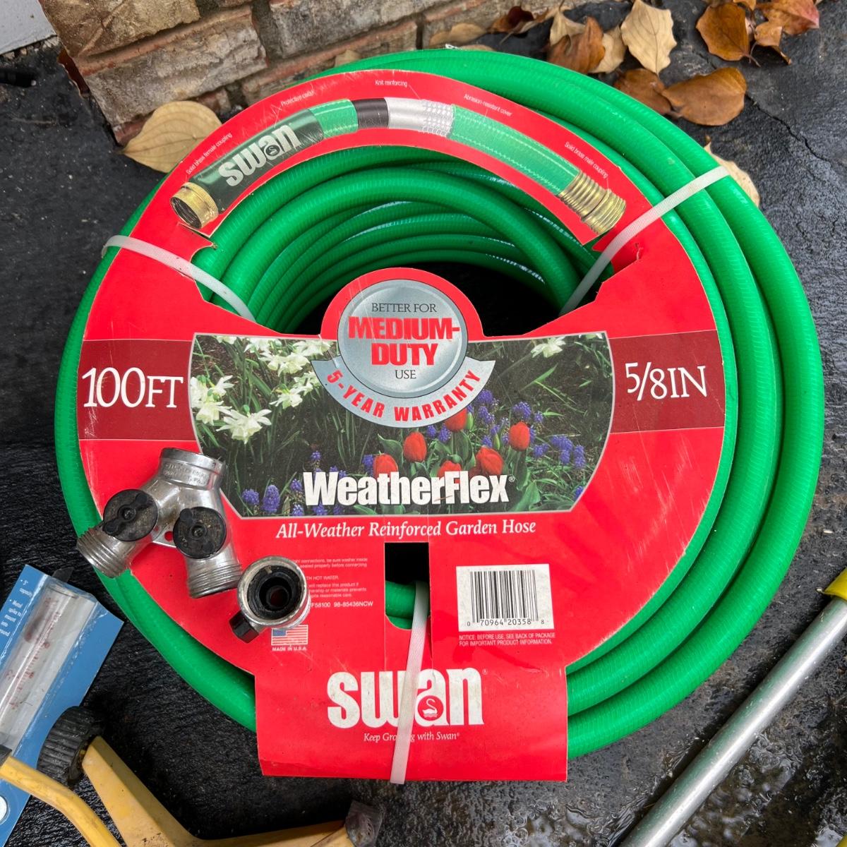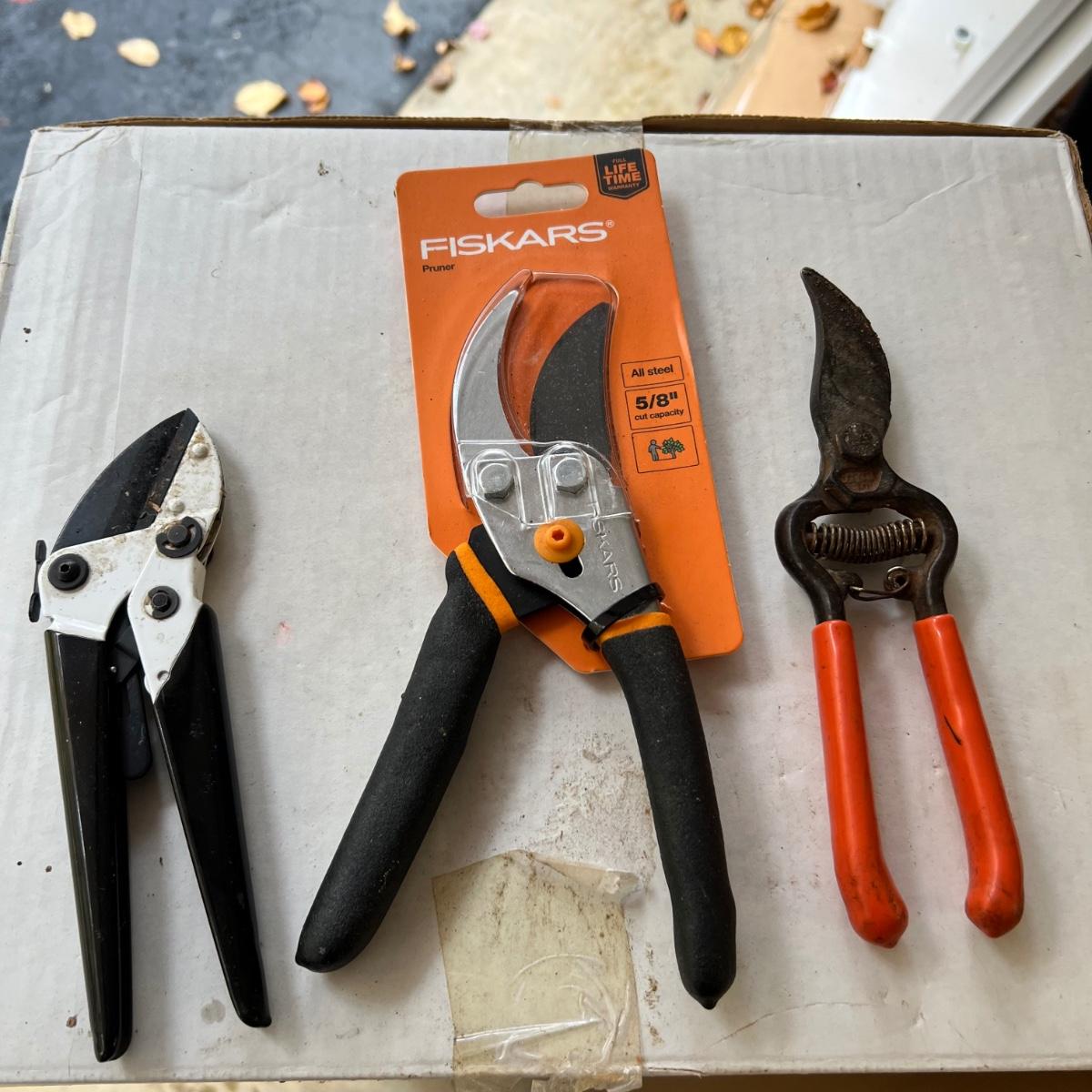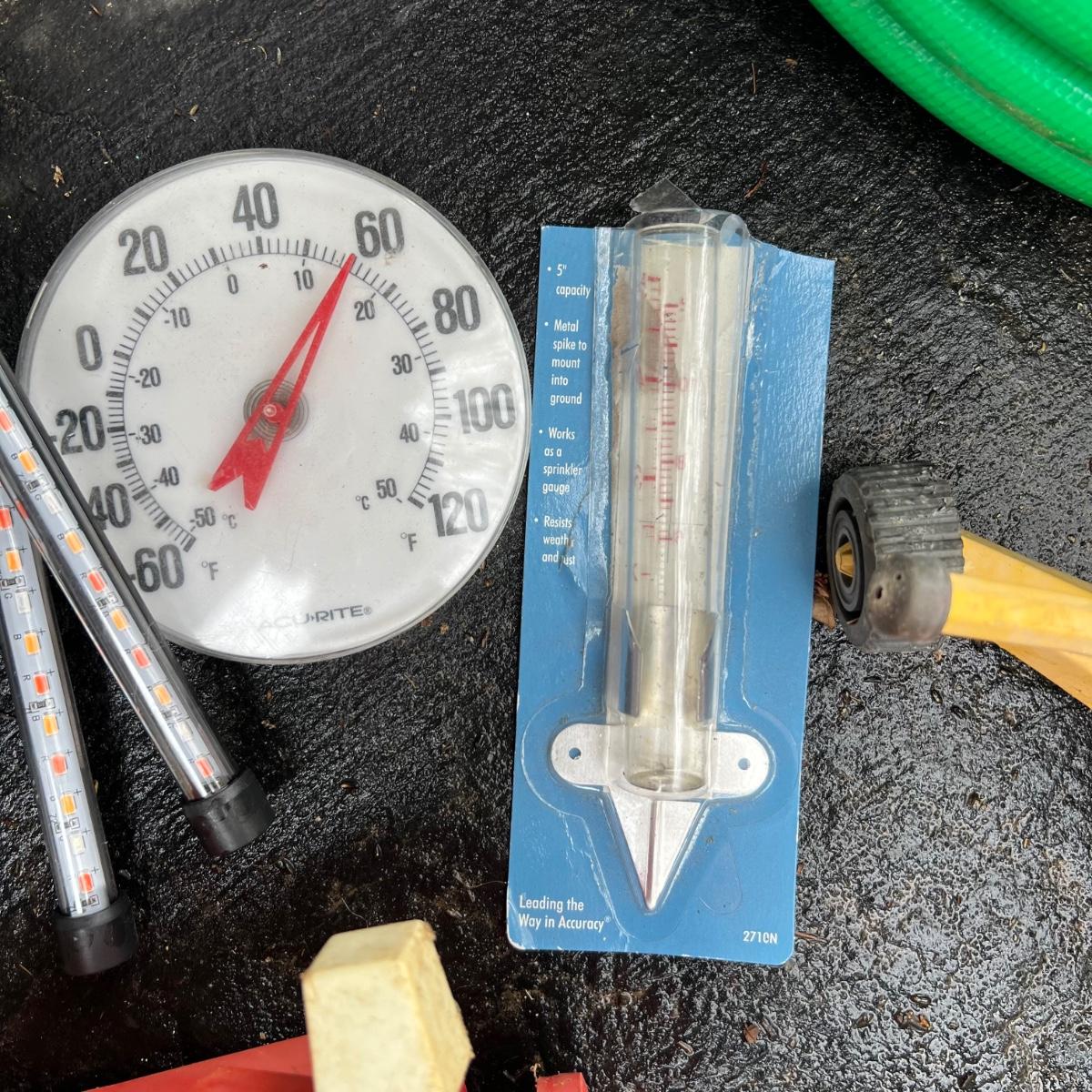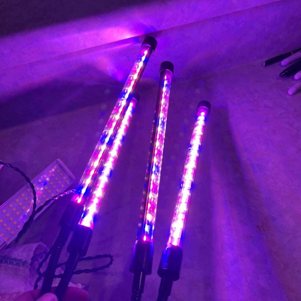 An assortment of plant care tools includes a new hose, nozzles, pruners and more. Two sets of grow lights are also included; white set has three lights and a USB plug. The black set has four lights that appear to be blue/red grow lights. Both lights powered on when plugged in.