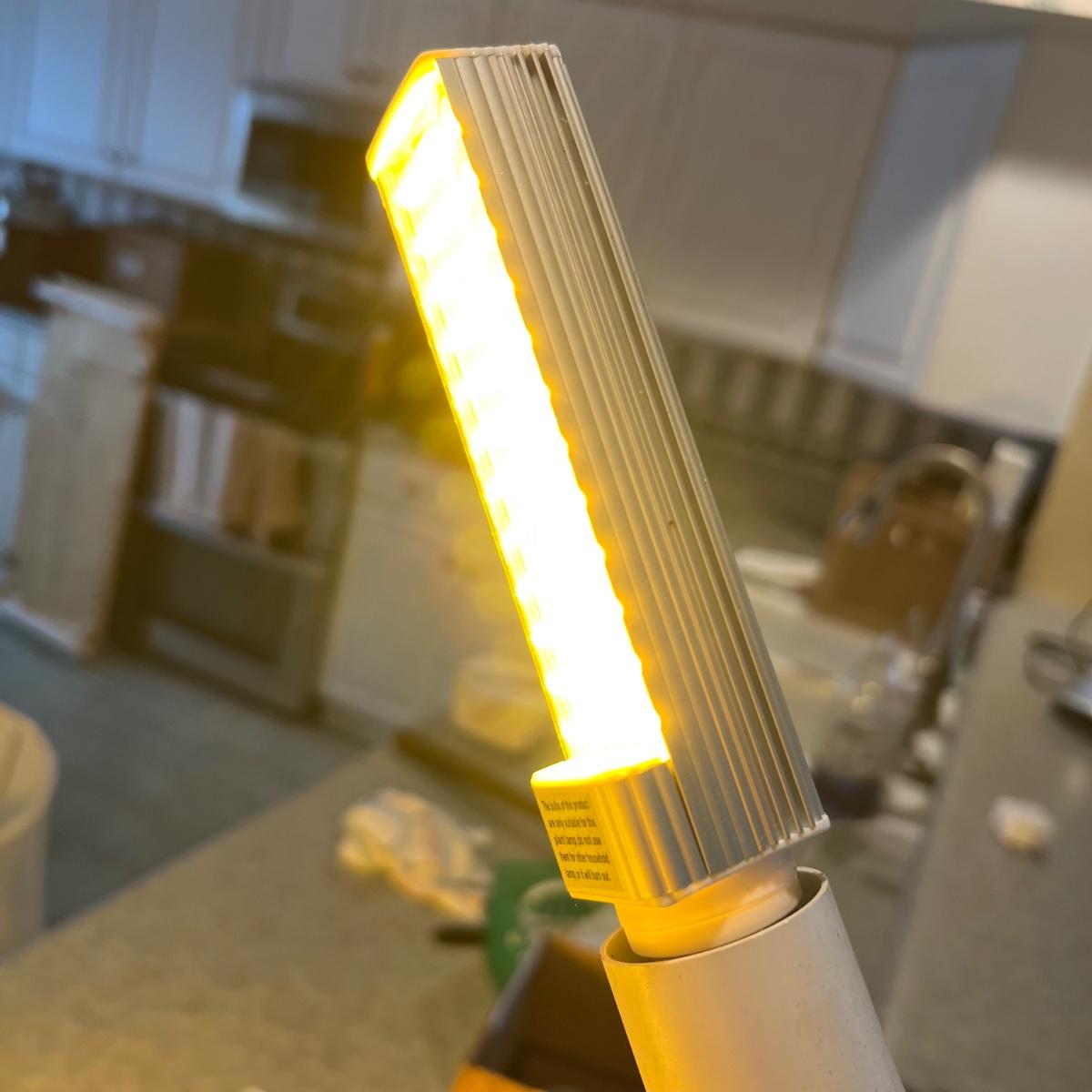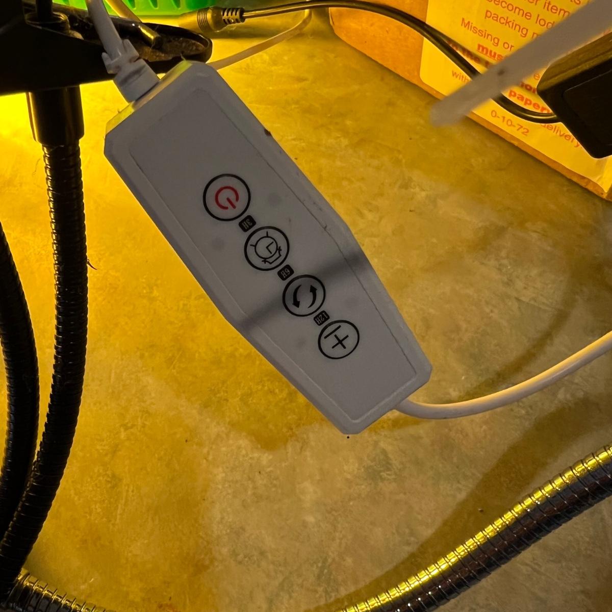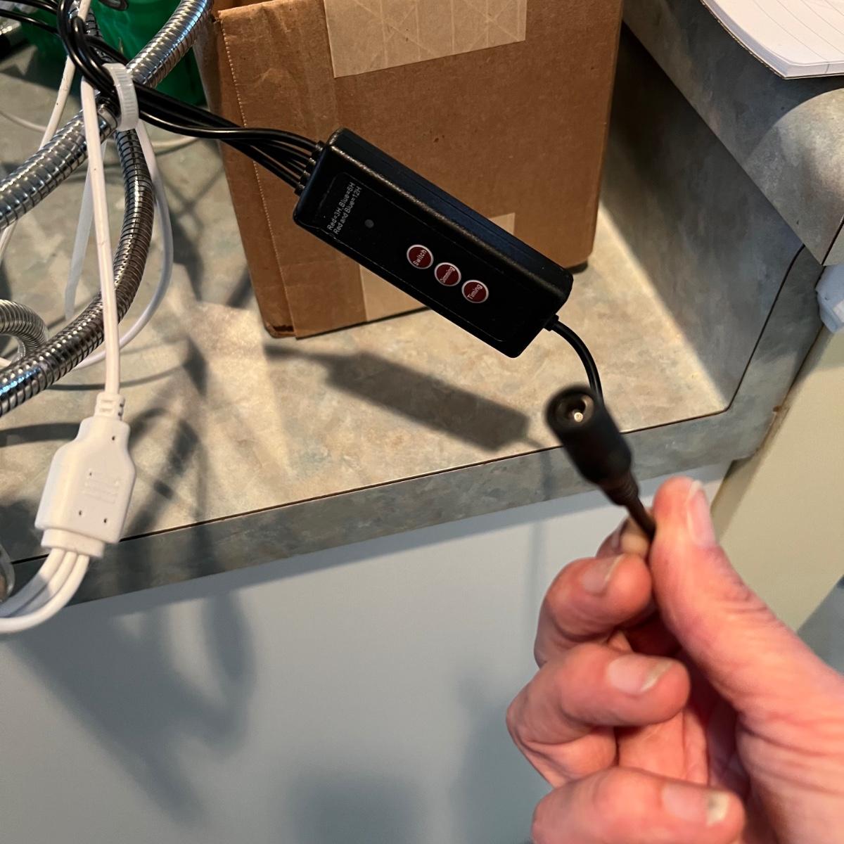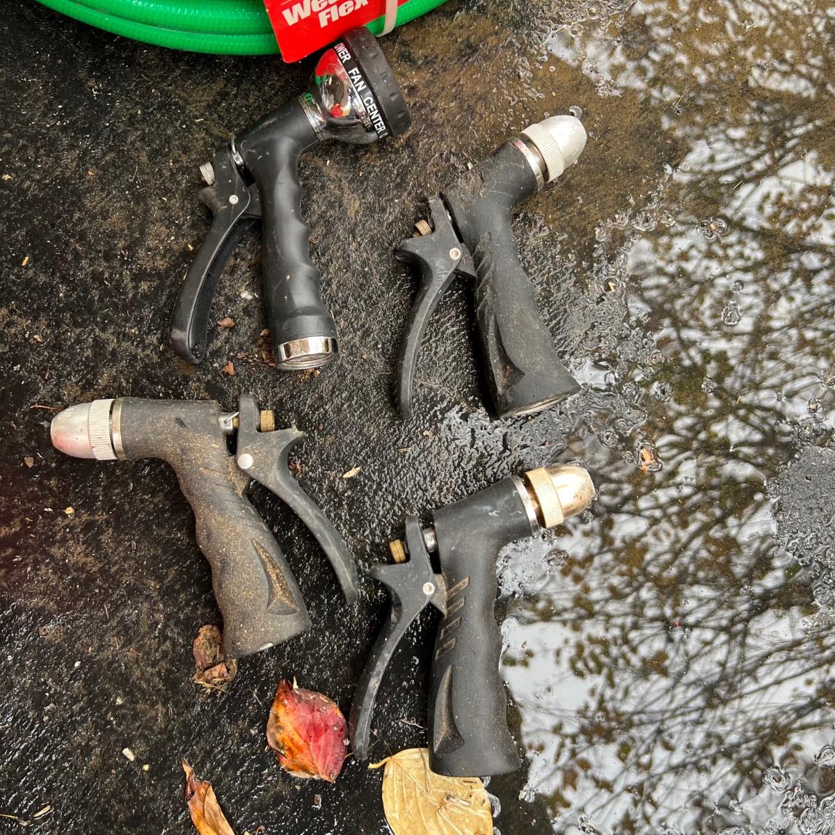 An assortment of plant care tools includes a new hose, nozzles, pruners and more. Two sets of grow lights are also included; white set has three lights and a USB plug. The black set has four lights that appear to be blue/red grow lights. Both lights powered on when plugged in.