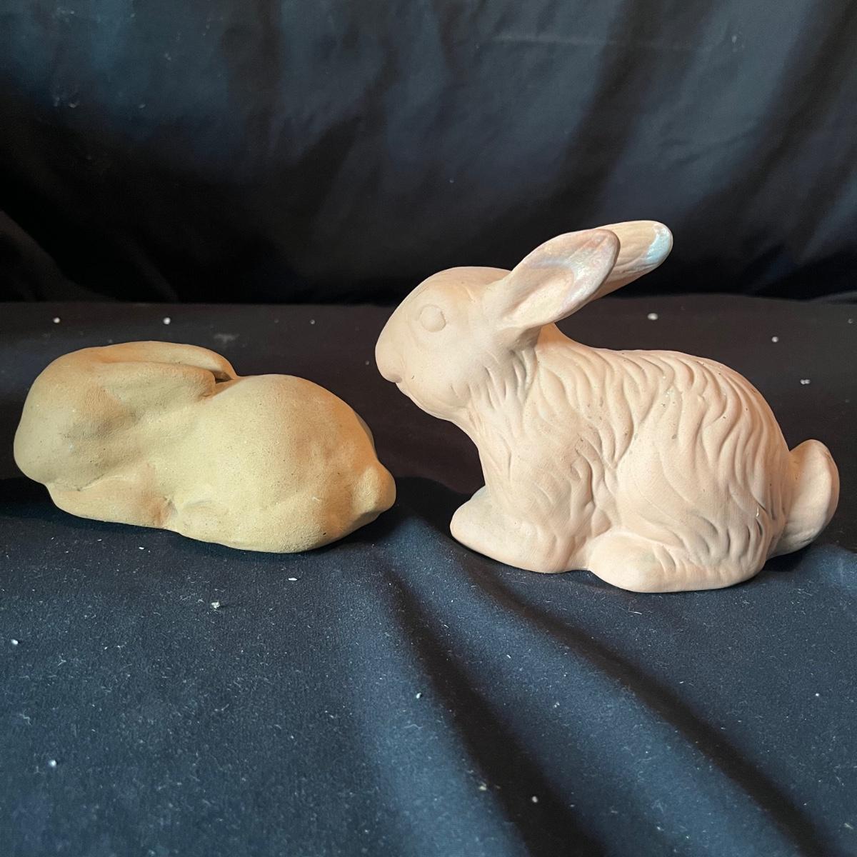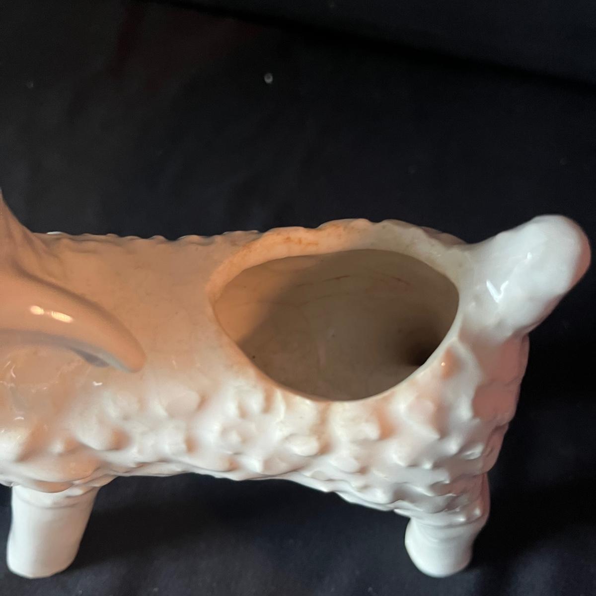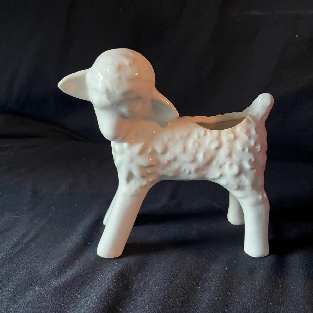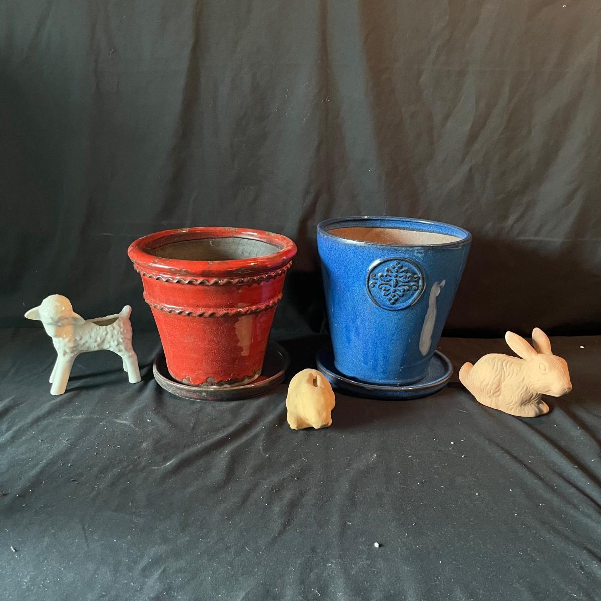 Lot includes pot from Napa home and garden with plate, unmarked blue plant pot with plate, sheep decoration, and two rabbits for decoration. Blue pot measures 9”D x 9.6” tall.