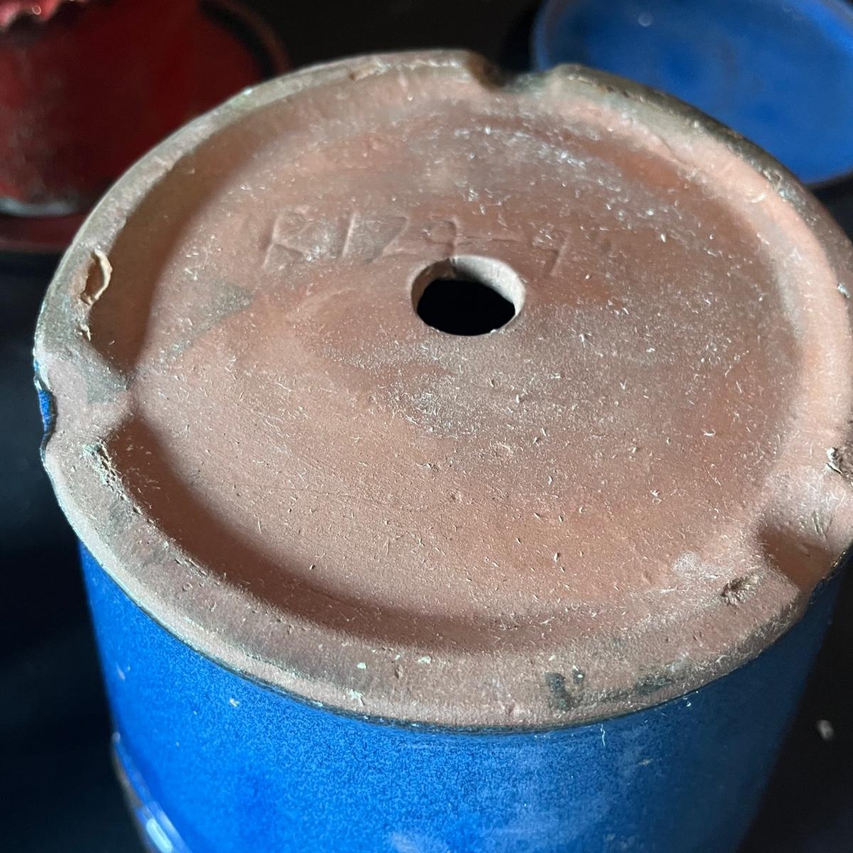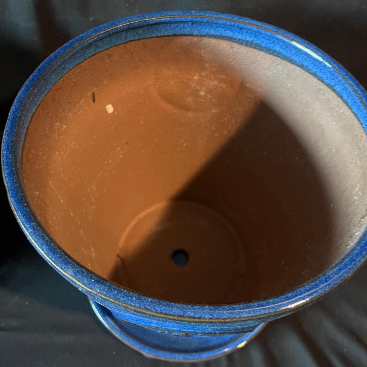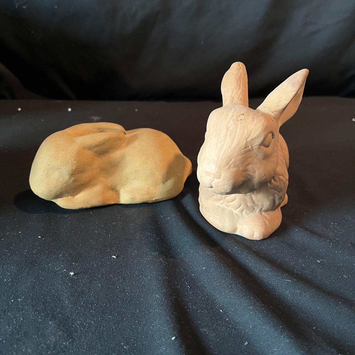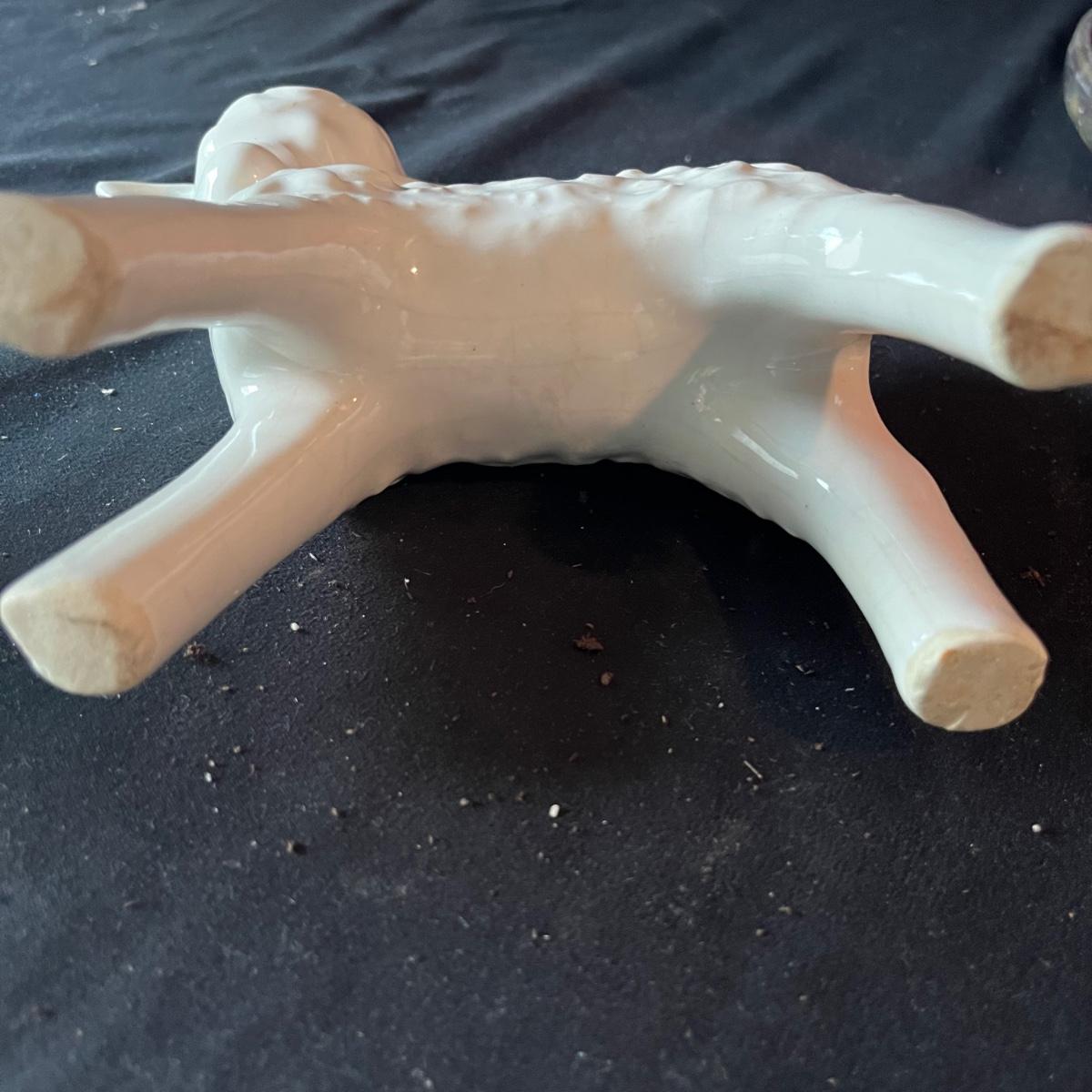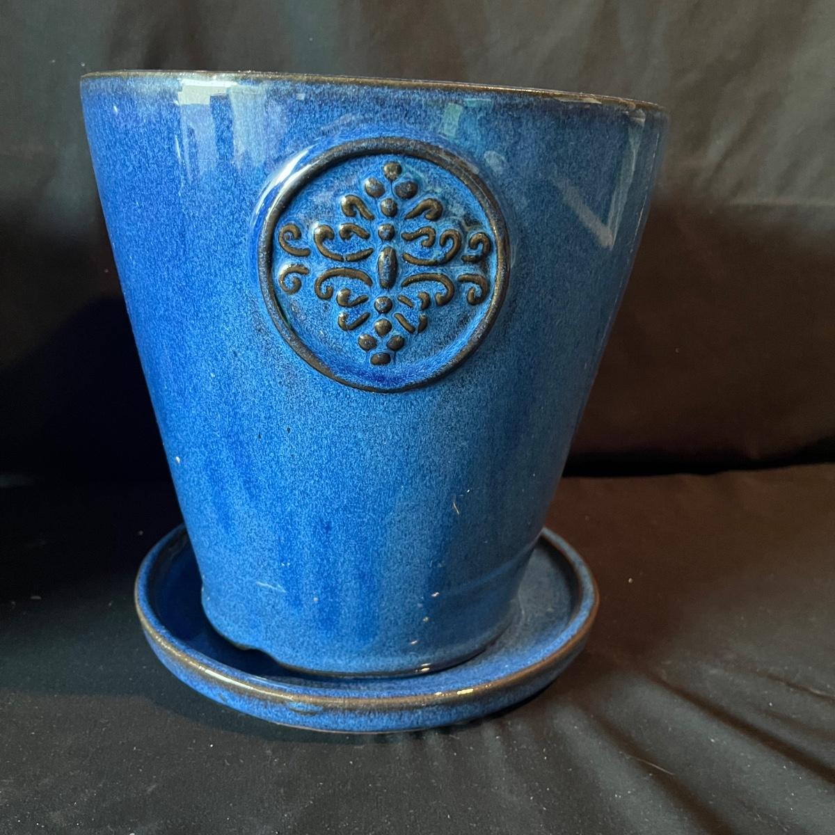 Lot includes pot from Napa home and garden with plate, unmarked blue plant pot with plate, sheep decoration, and two rabbits for decoration. Blue pot measures 9”D x 9.6” tall.