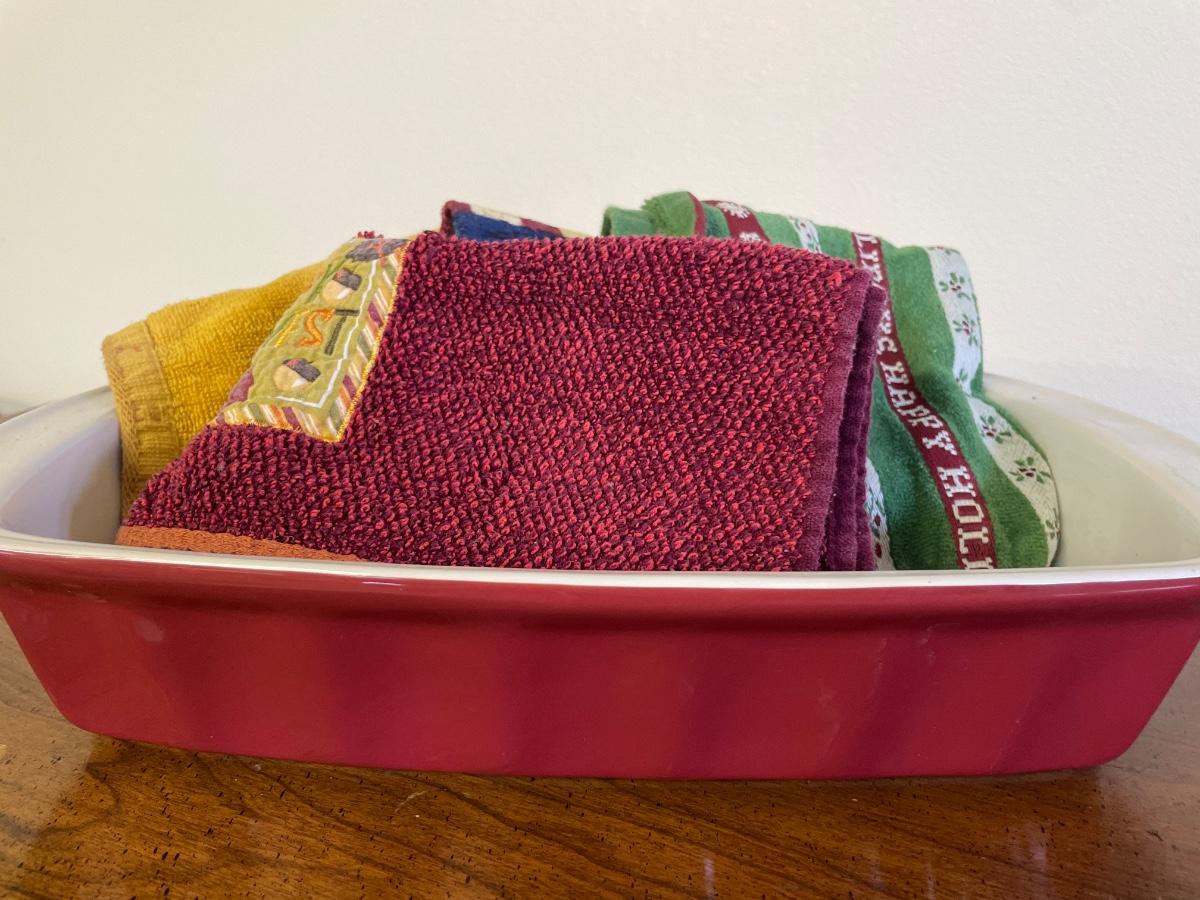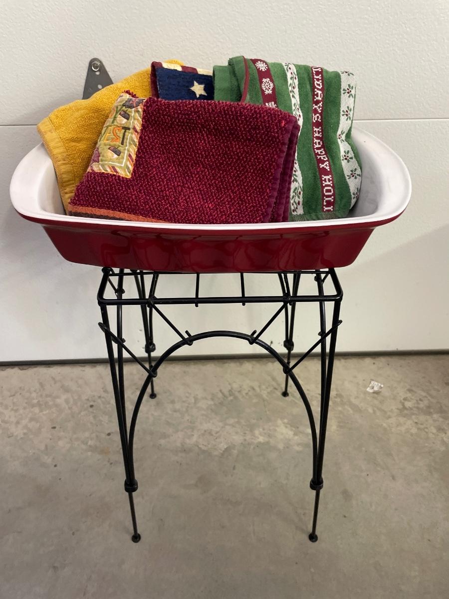 Plant stand with casserole dish and towels