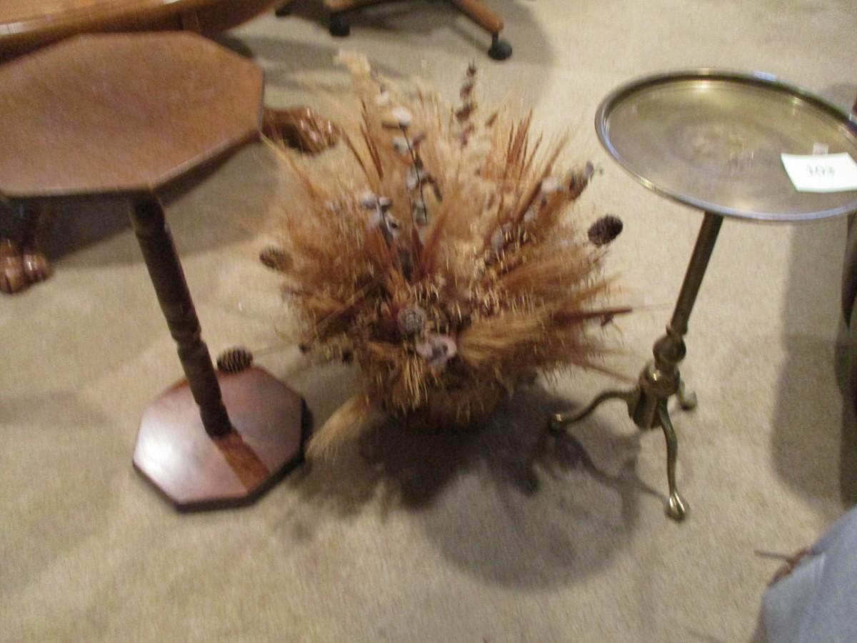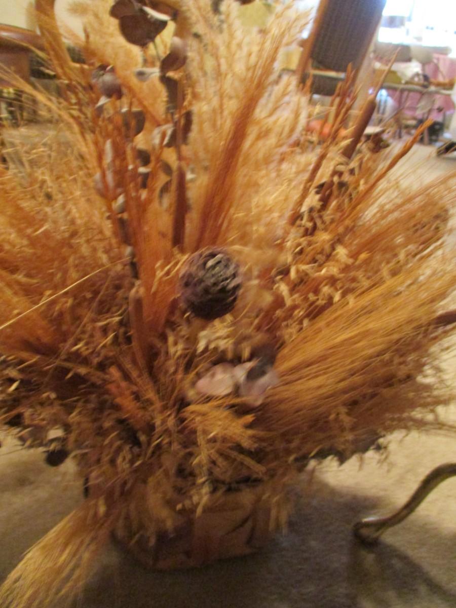 1 wood plant stand. 1 brass plant stand. 1 wheat centerpiece